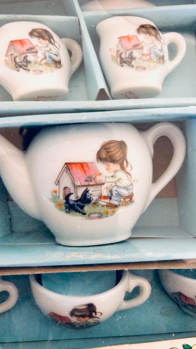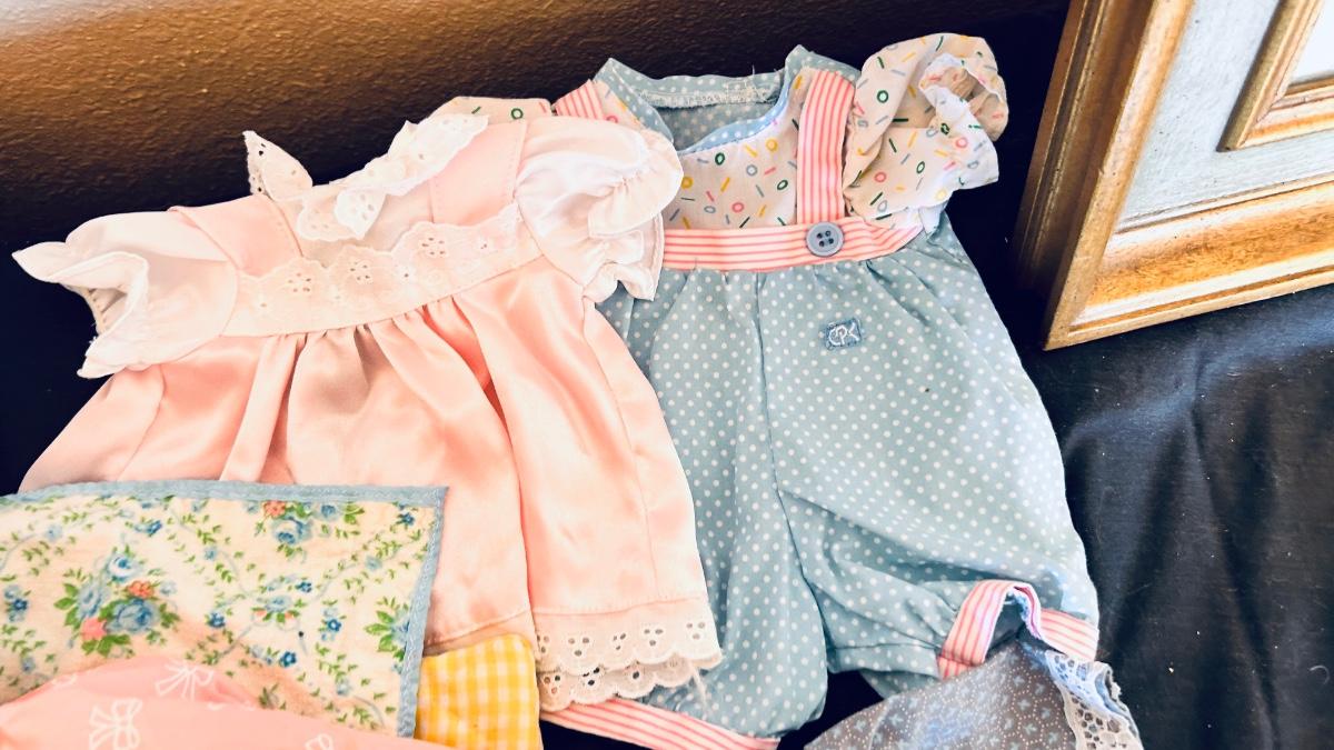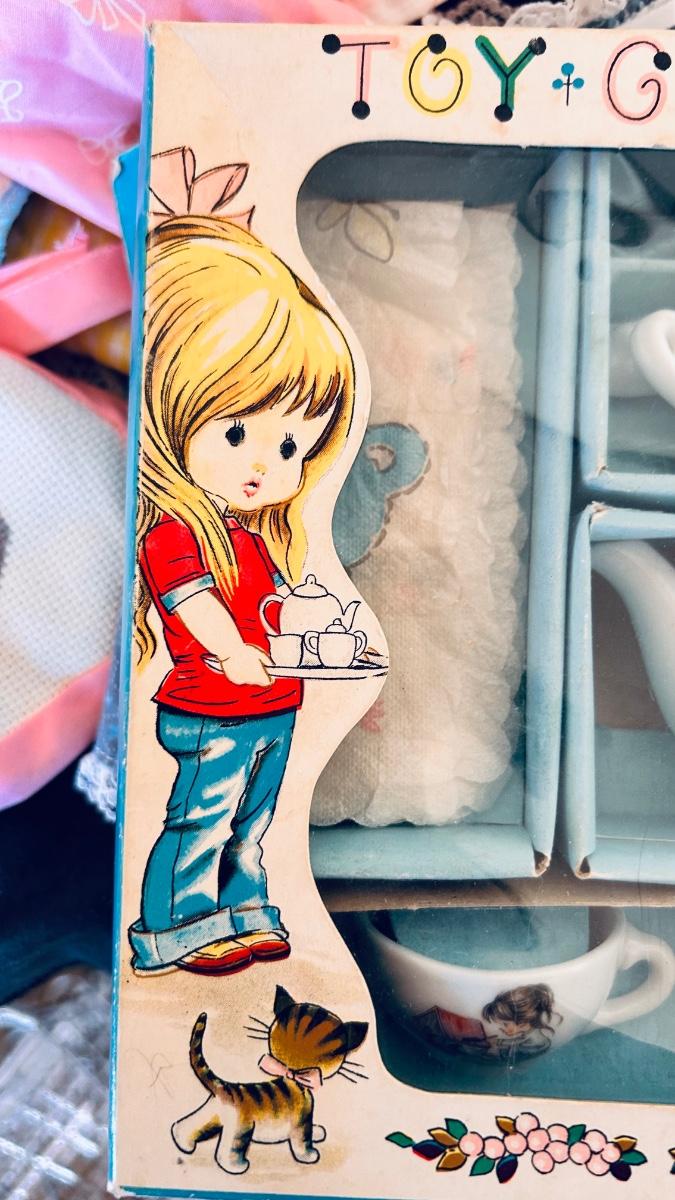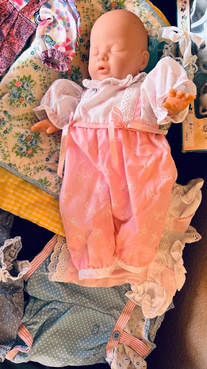 BABY DOLL, CLOTHES AND A PLAY TEA SET