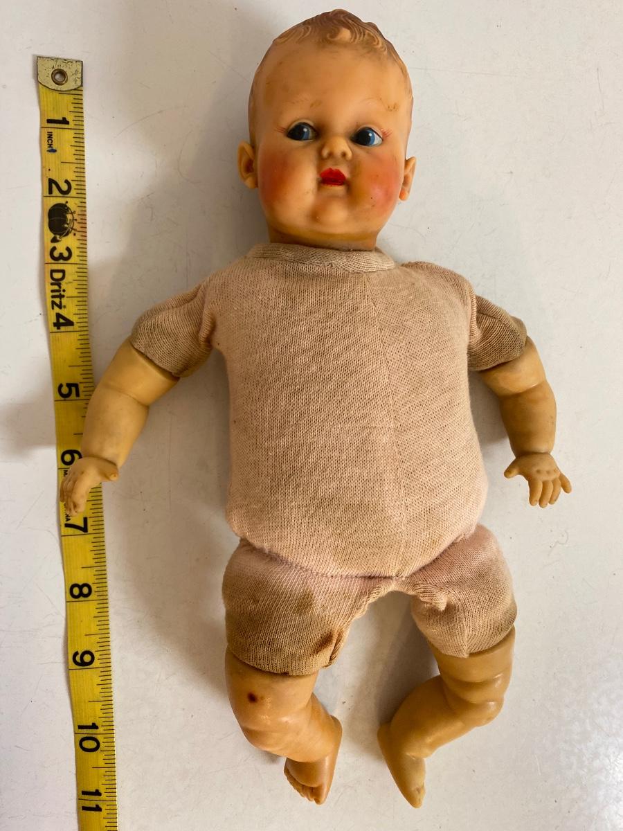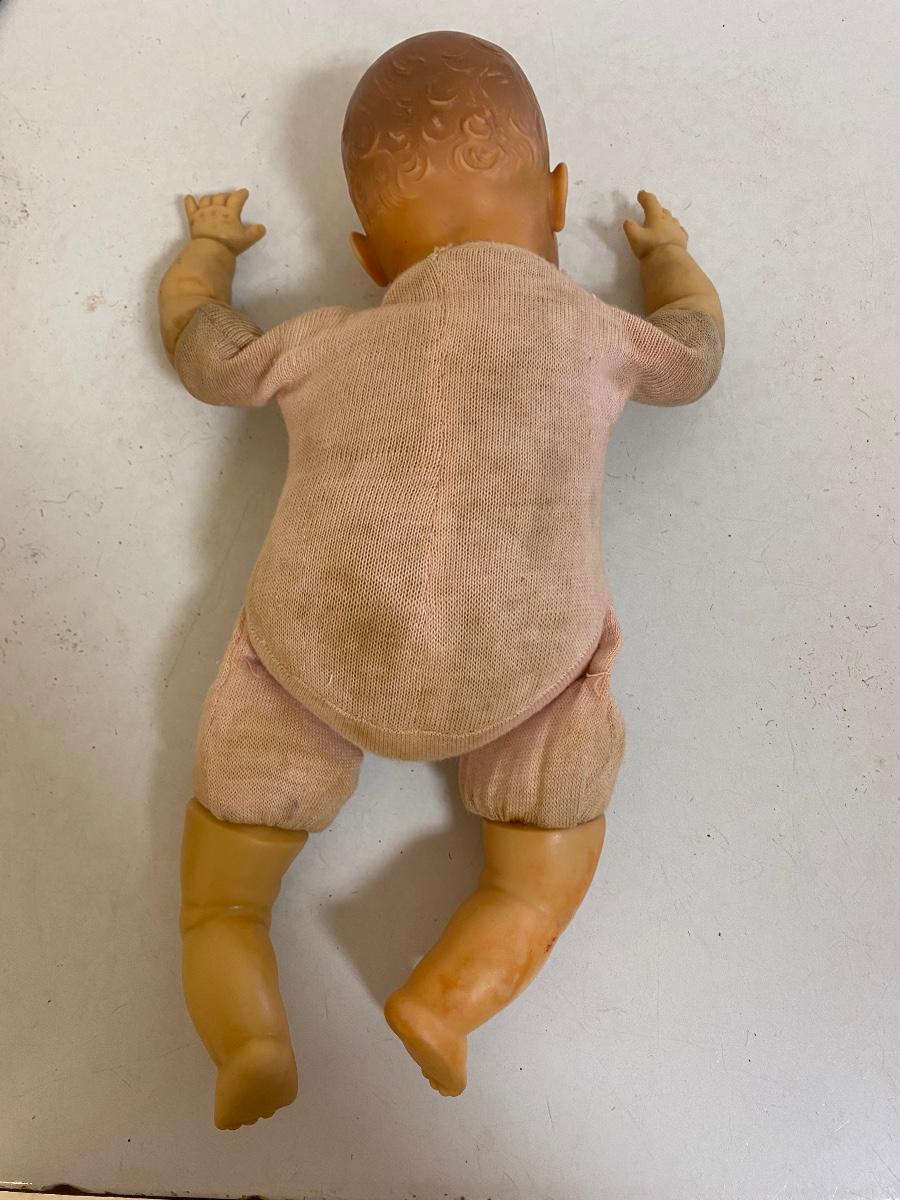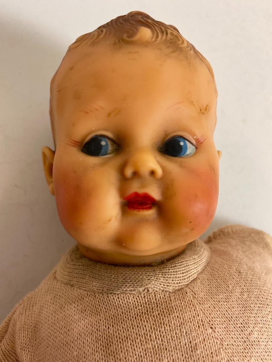 Vintage baby doll with rubber body parts and cloth torso. In fair vintage condition, but needs a cleaning.