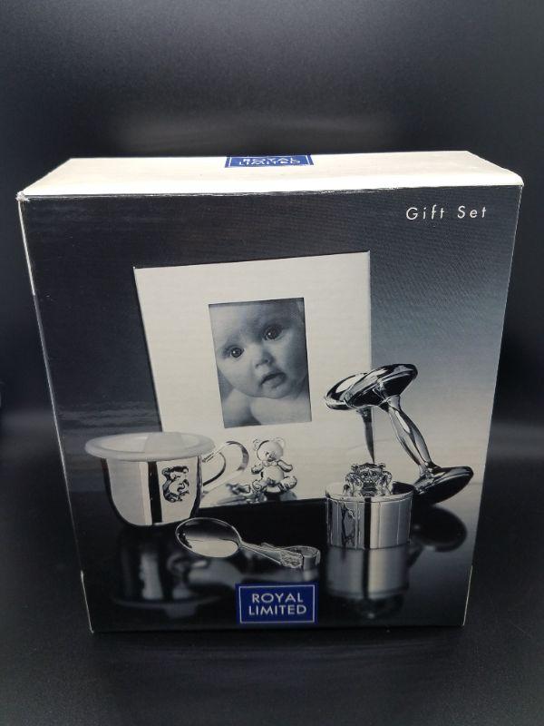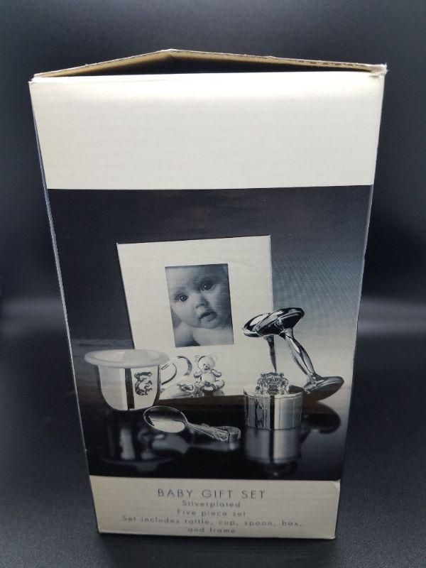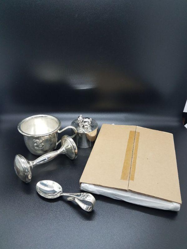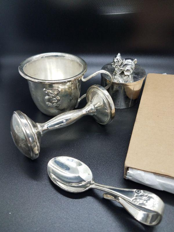 Frame, rattle, spoon, cup (missing sippy cover) and trinket box. frame still wrapped up, others could use a light polish.