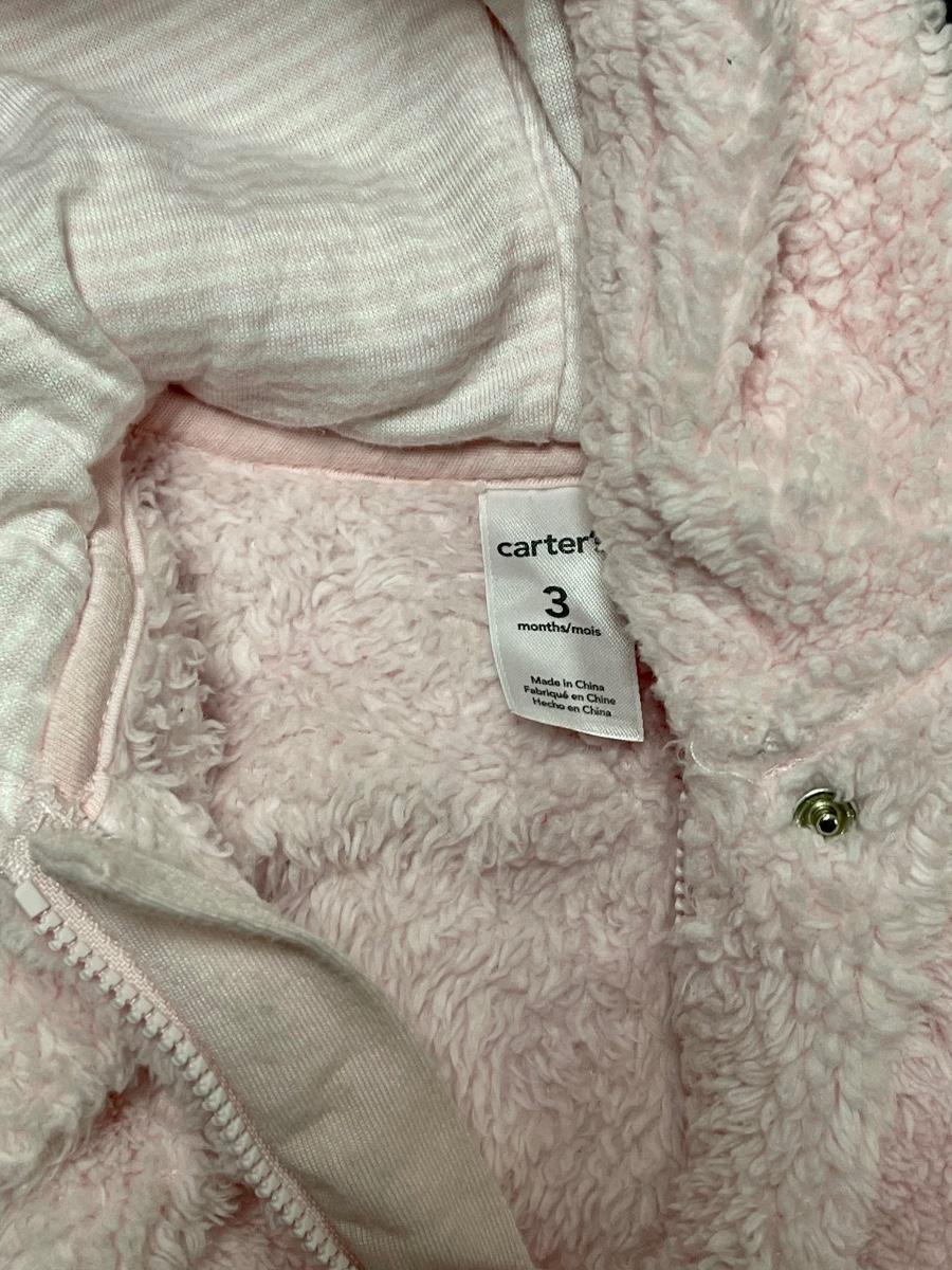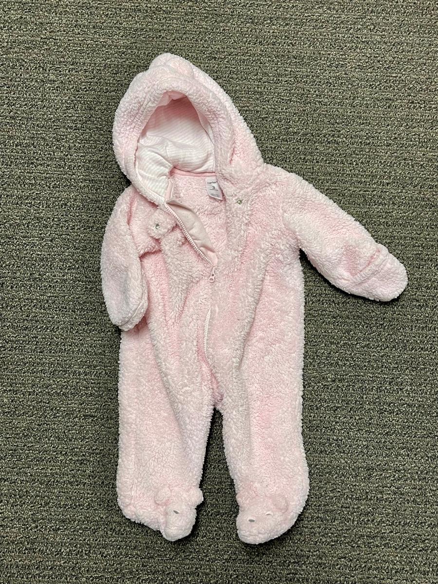 Pale Pink Carters Baby One Piece Fuzzy Footed Onesie with Hood. In good used condition