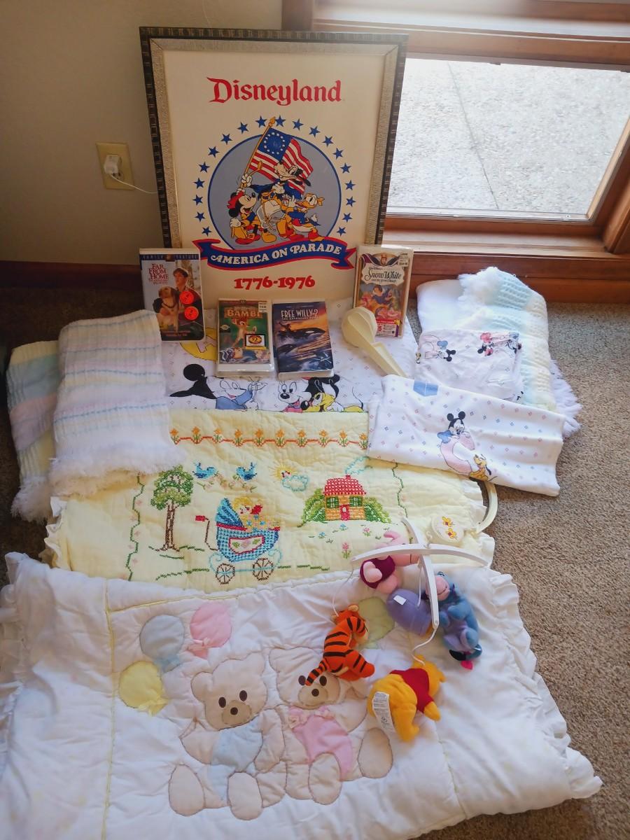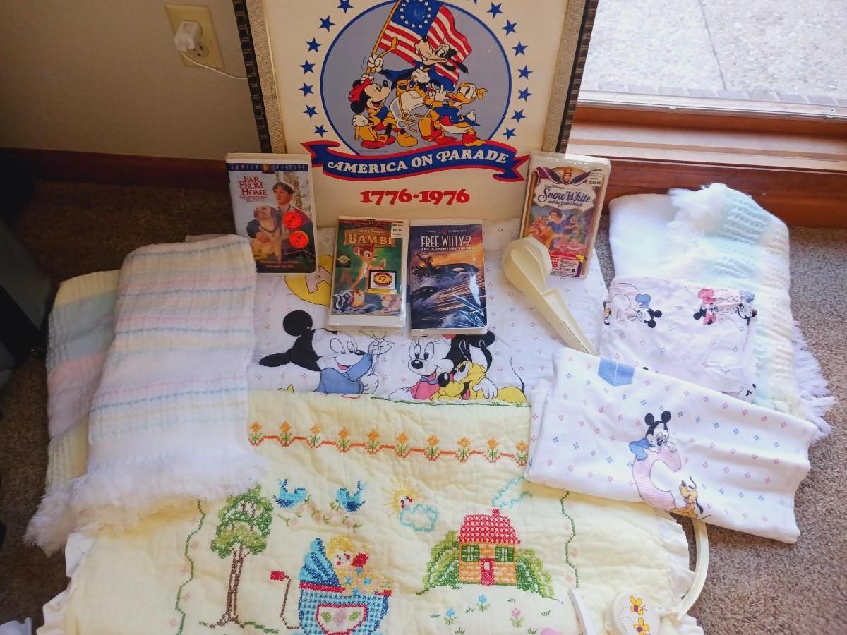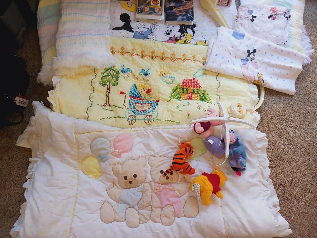 BABY QUILTS/BLANKETS, WINNIE THE POOH MOBILE, DISNEY VHS MOVIES AND MORE