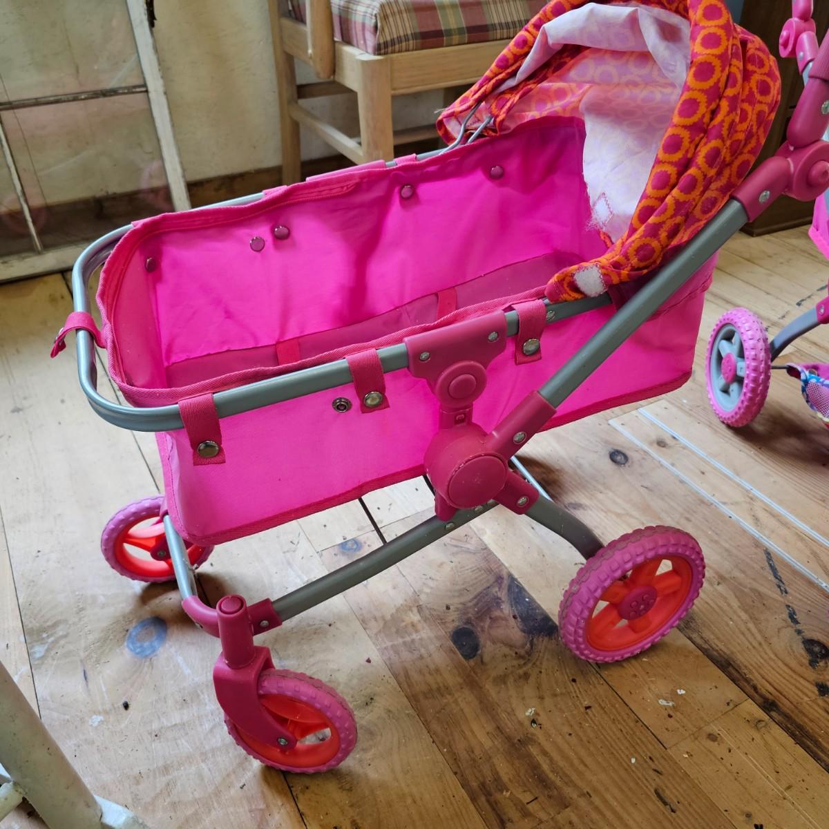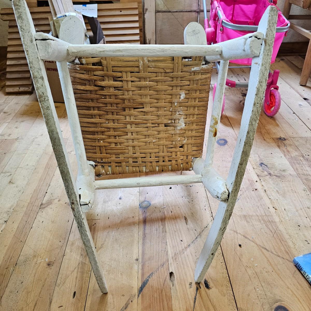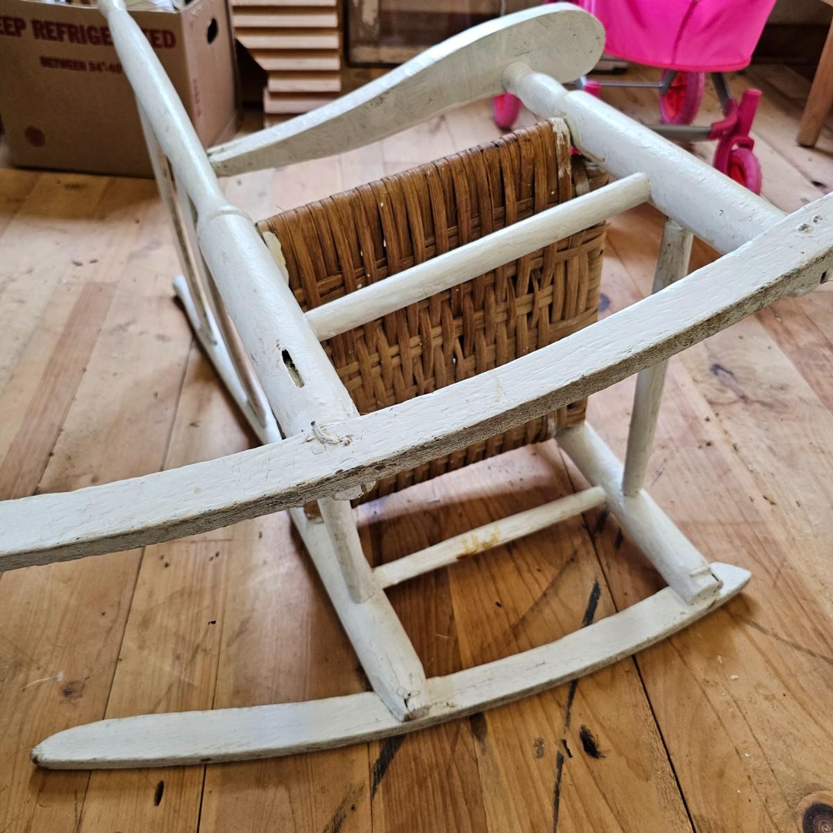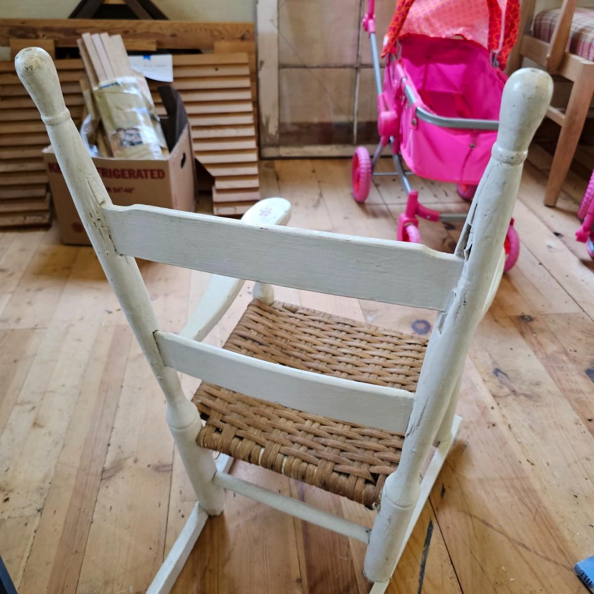 Two pink baby strollers for child's dolls or other. Movable hoods and will collapse for storage. 29" x 30" x 26"H. One large child's decorated rocking chair with split wood seat, measures 24" x 25" x 27"H, seat height 10". Smaller rocker is doll size, is 7" x 7" x 12"H, has split wood seat. One knitted baby blanket, 30" sq. And twenty-five children's books, Wizard of Oz, Pied Piper of Hamelin, more. See photos for details. Local pickup only.