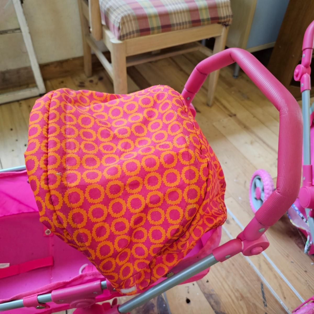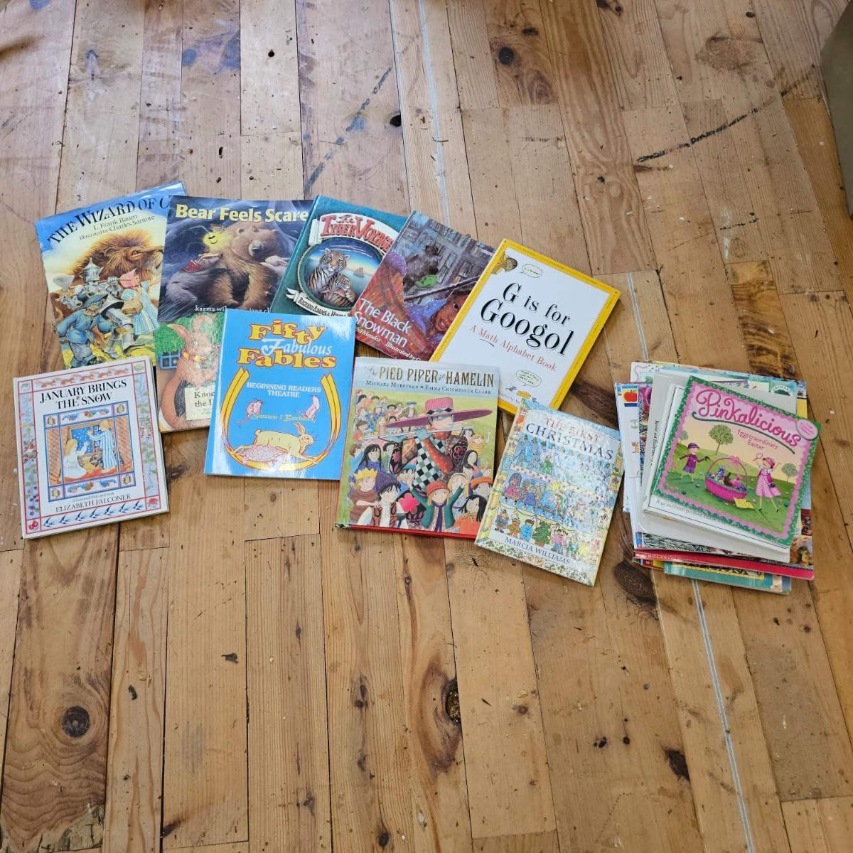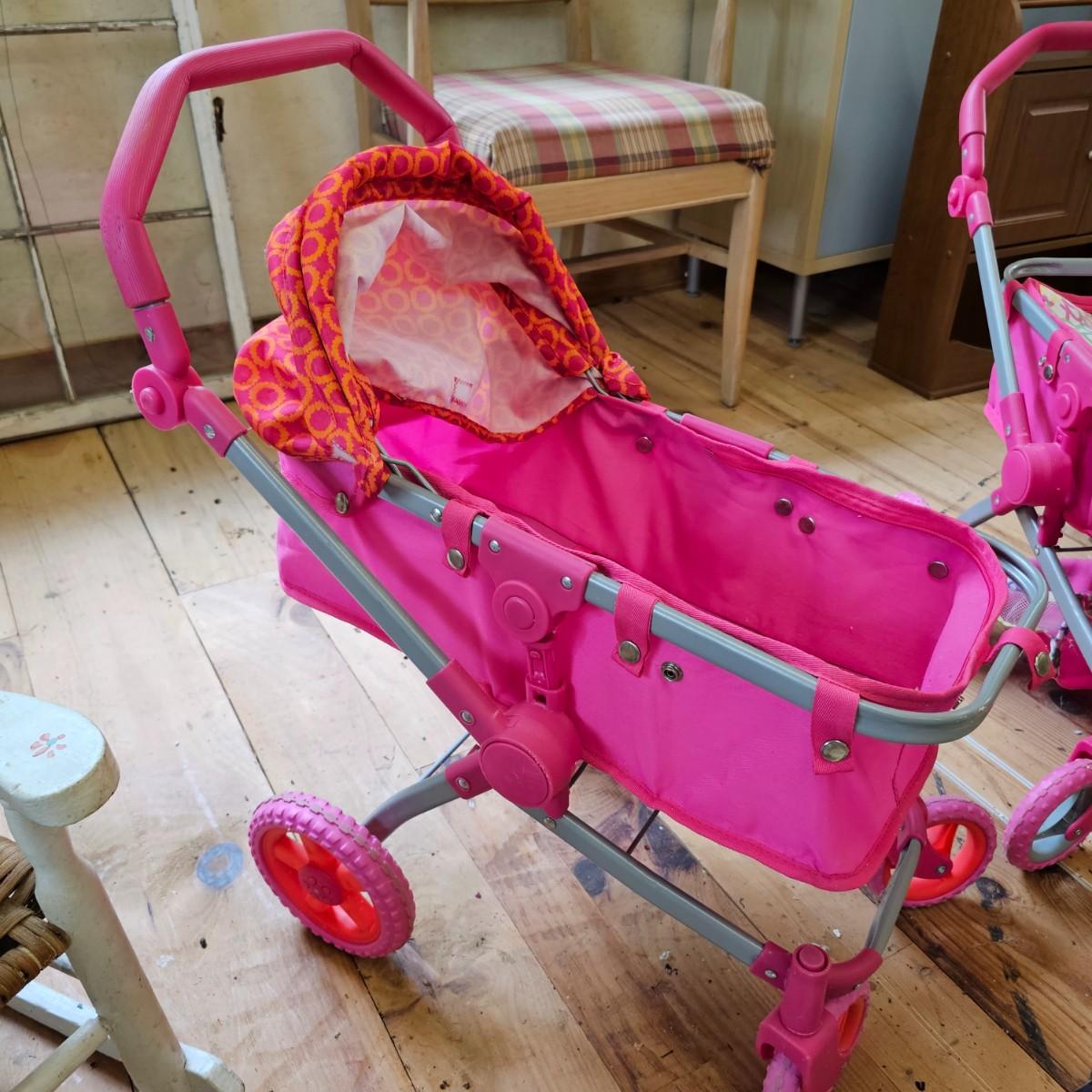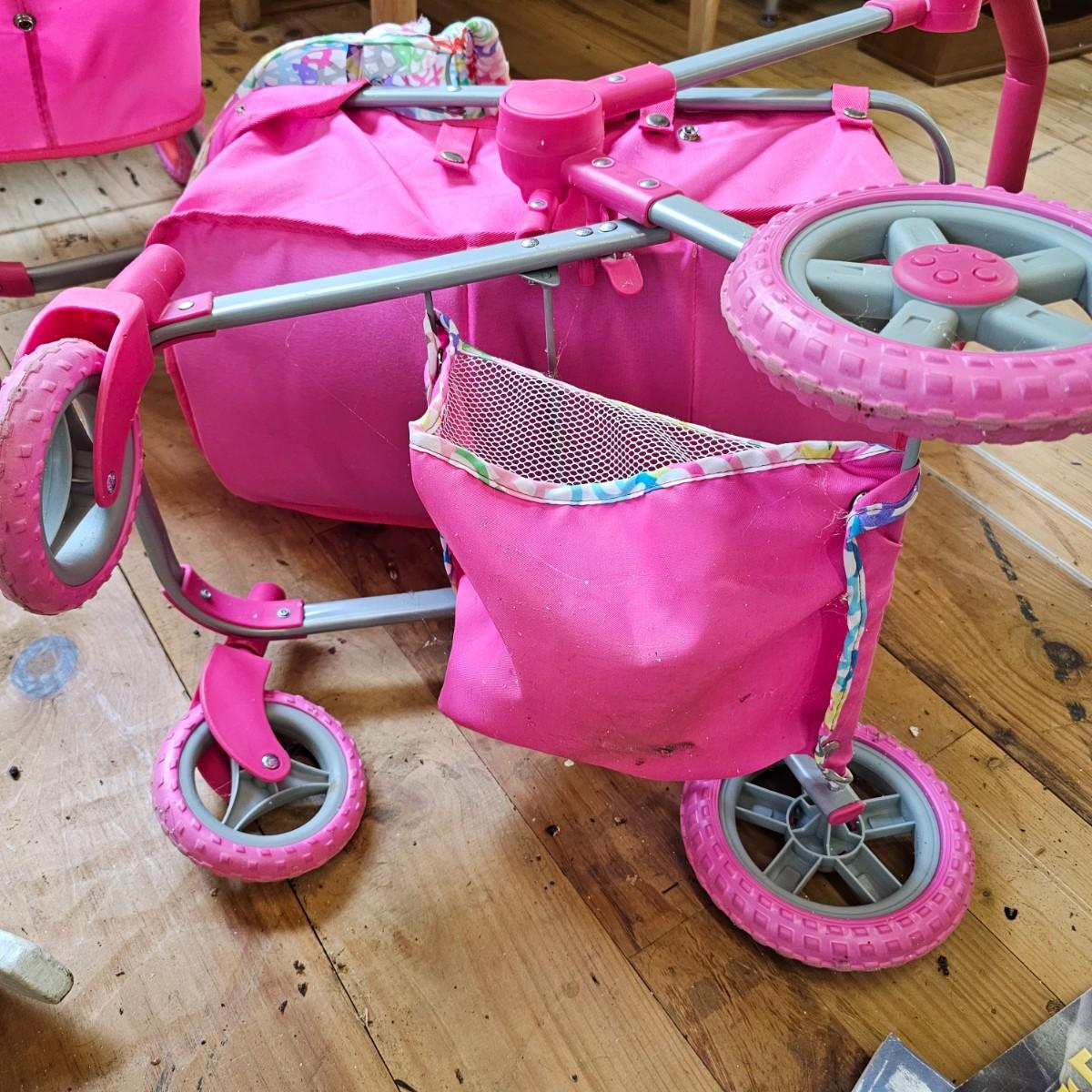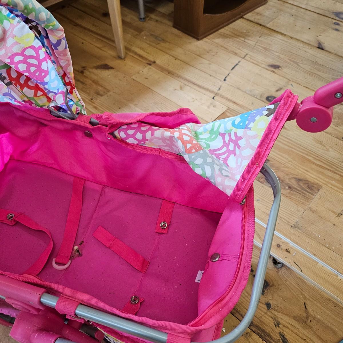 Two pink baby strollers for child's dolls or other. Movable hoods and will collapse for storage. 29" x 30" x 26"H. One large child's decorated rocking chair with split wood seat, measures 24" x 25" x 27"H, seat height 10". Smaller rocker is doll size, is 7" x 7" x 12"H, has split wood seat. One knitted baby blanket, 30" sq. And twenty-five children's books, Wizard of Oz, Pied Piper of Hamelin, more. See photos for details. Local pickup only.