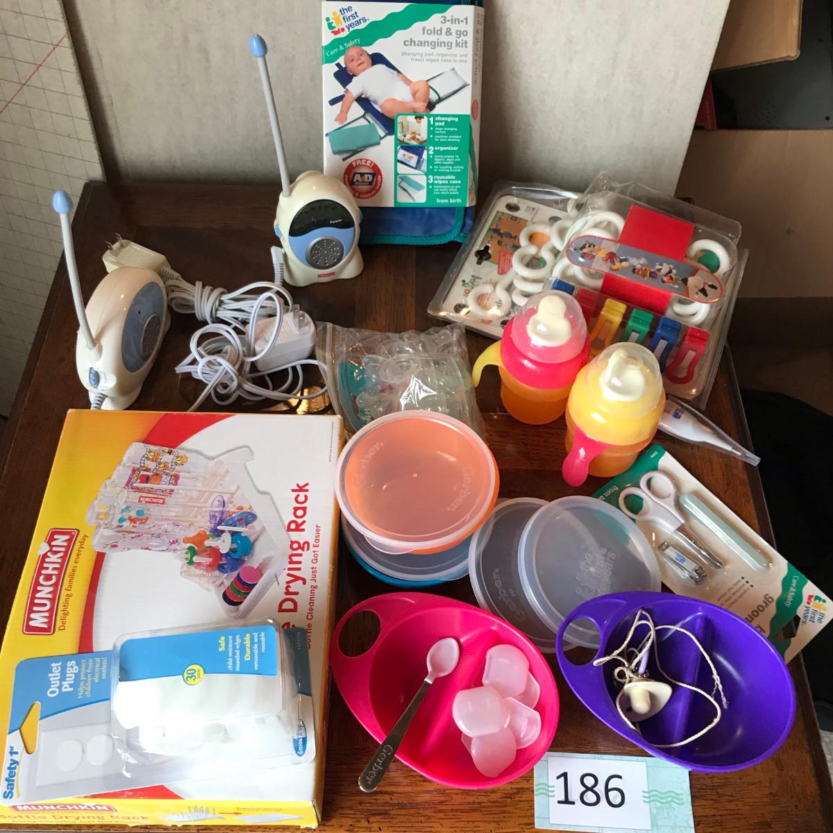 Lot of baby supplies, mostly new. Don't know if the baby monitors work.