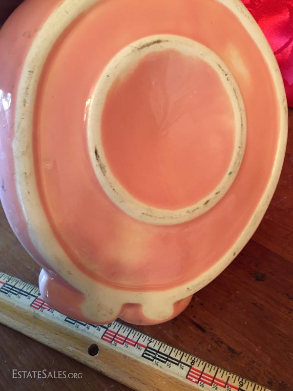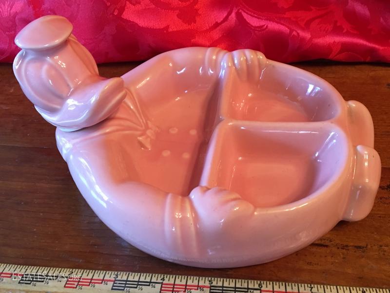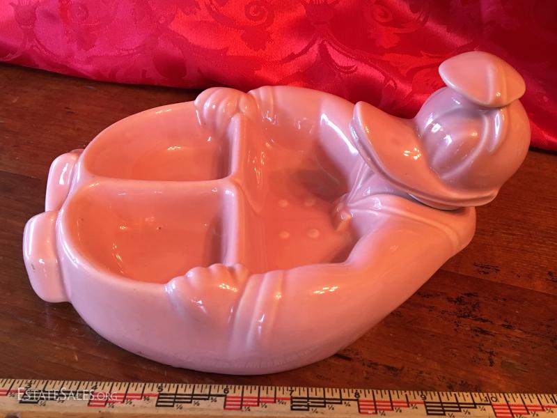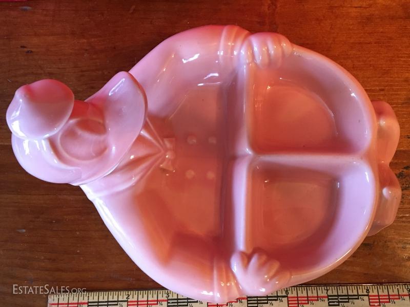 Head rotates, and comes out so hot water can be added to holllow cavity to keep food warm. Or, you can hide your jewelry in it, and fill the sections with chocolate!?!? Clean, no chips. There is a spot that was never glazed, between the feet.