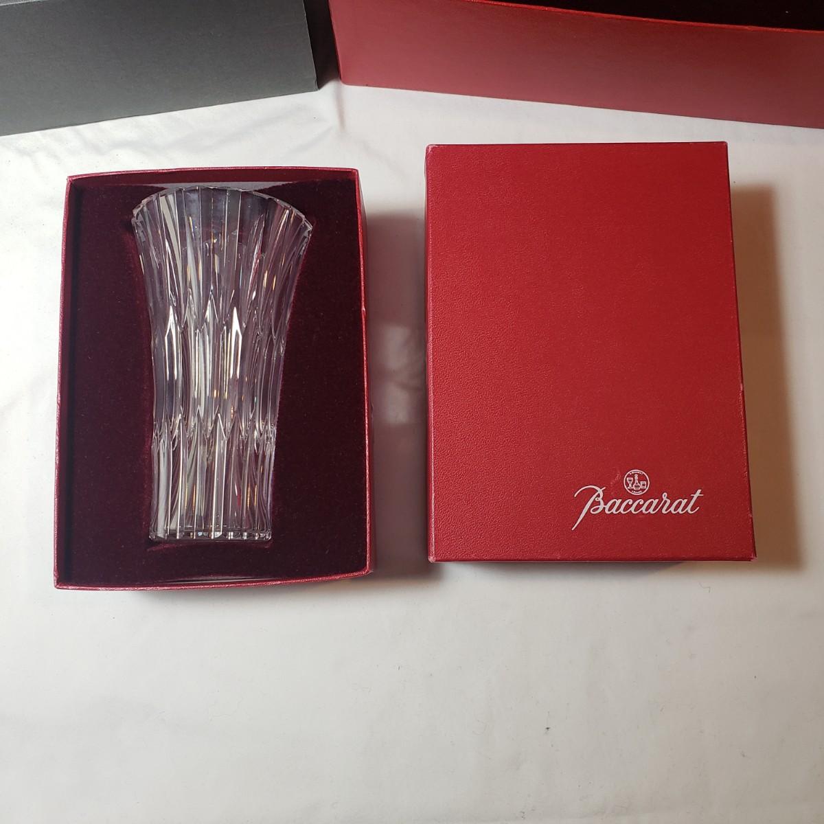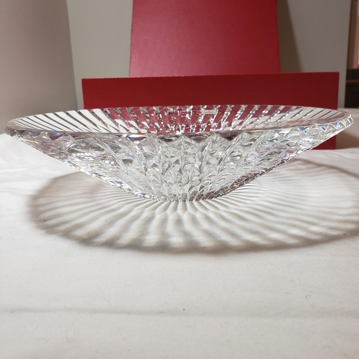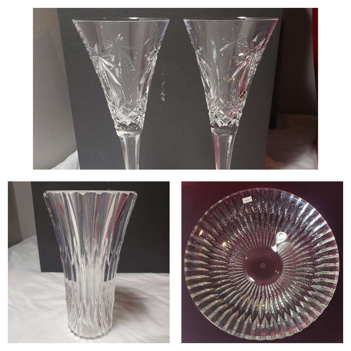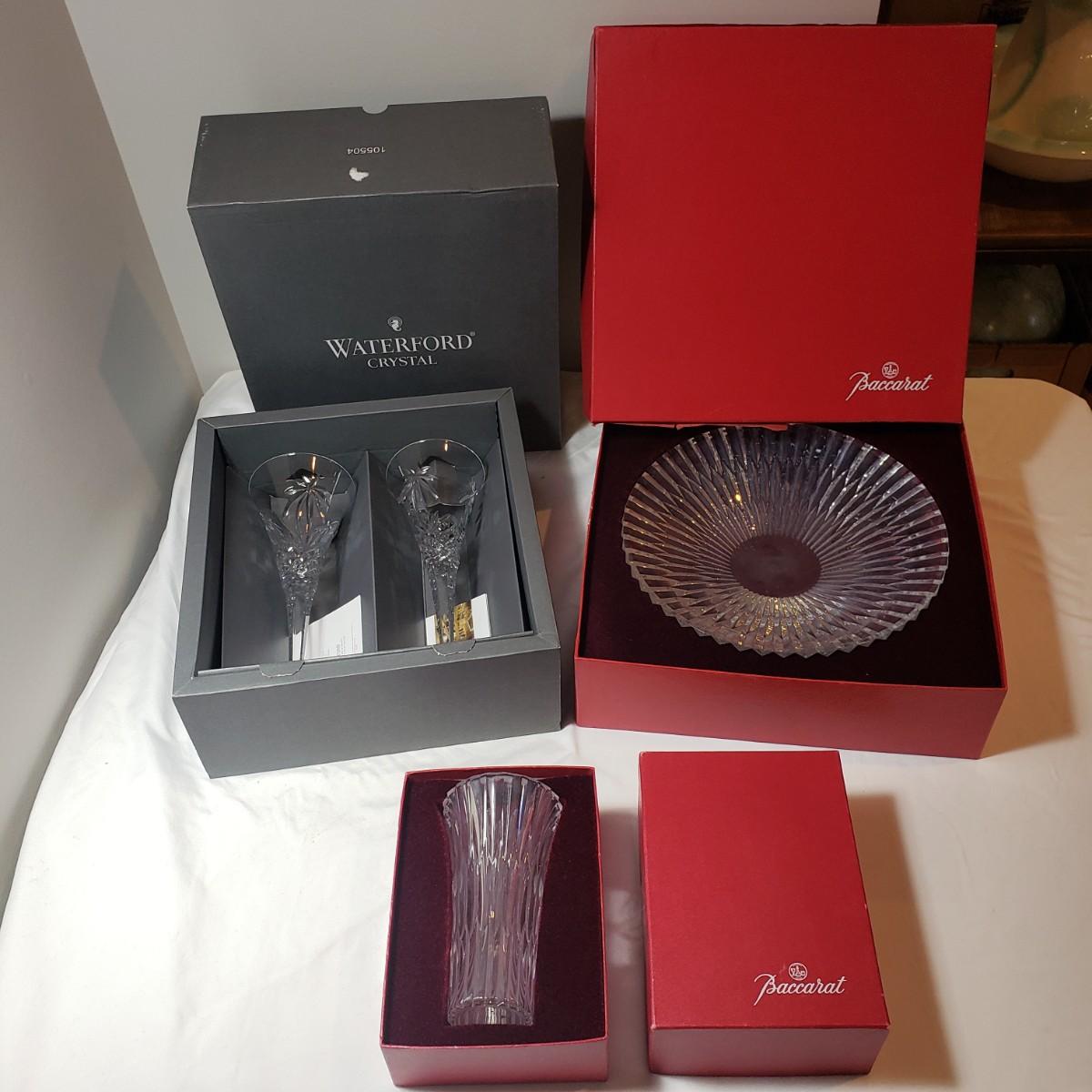 This is a three piece lot with two Baccarat pieces and two Waterford flutes. The vase measures 3" x 6"H and the bowl measures 10" x 2"H. The bowl is heavy. The two Waterford flutes are from their palm tree design. There appears to be no blemishes on any of the pieces.