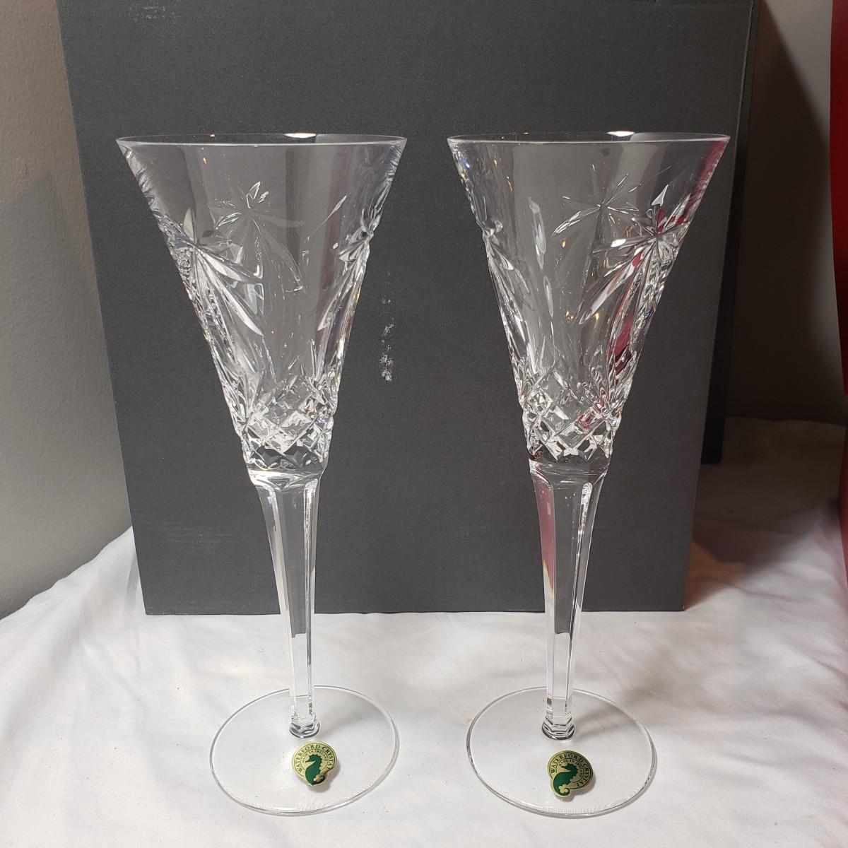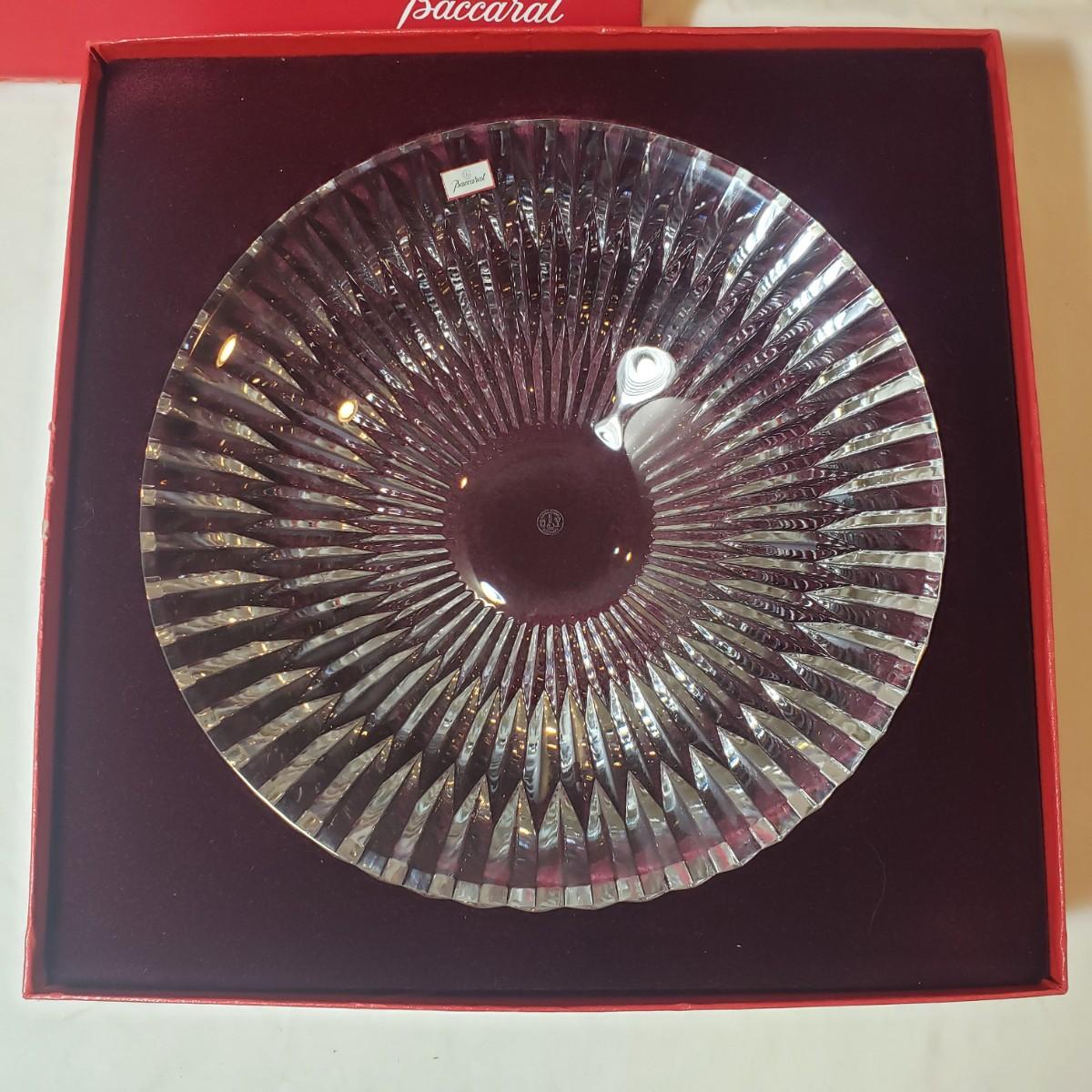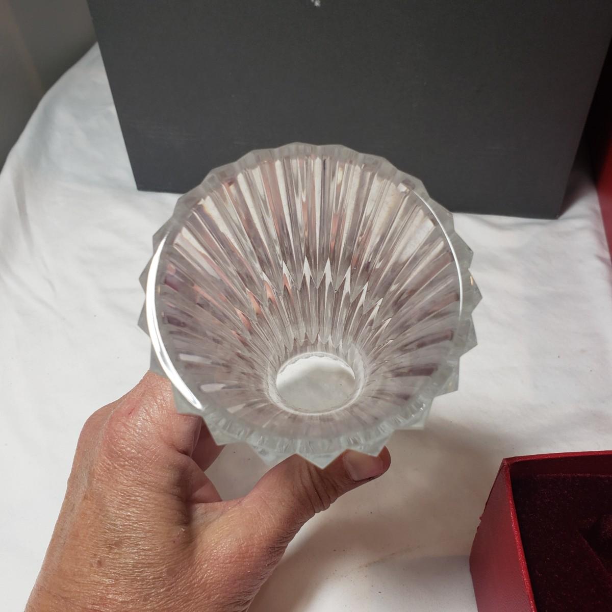 This is a three piece lot with two Baccarat pieces and two Waterford flutes. The vase measures 3" x 6"H and the bowl measures 10" x 2"H. The bowl is heavy. The two Waterford flutes are from their palm tree design. There appears to be no blemishes on any of the pieces.