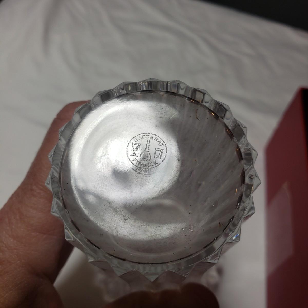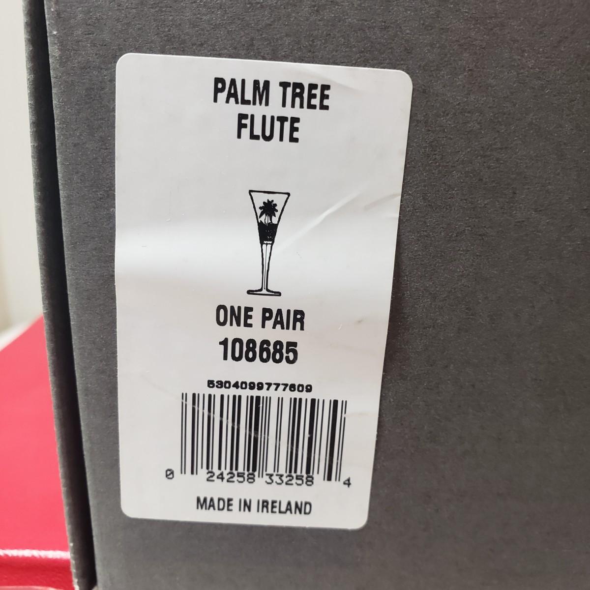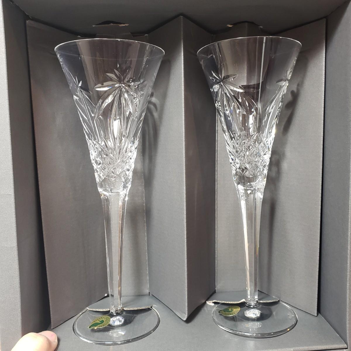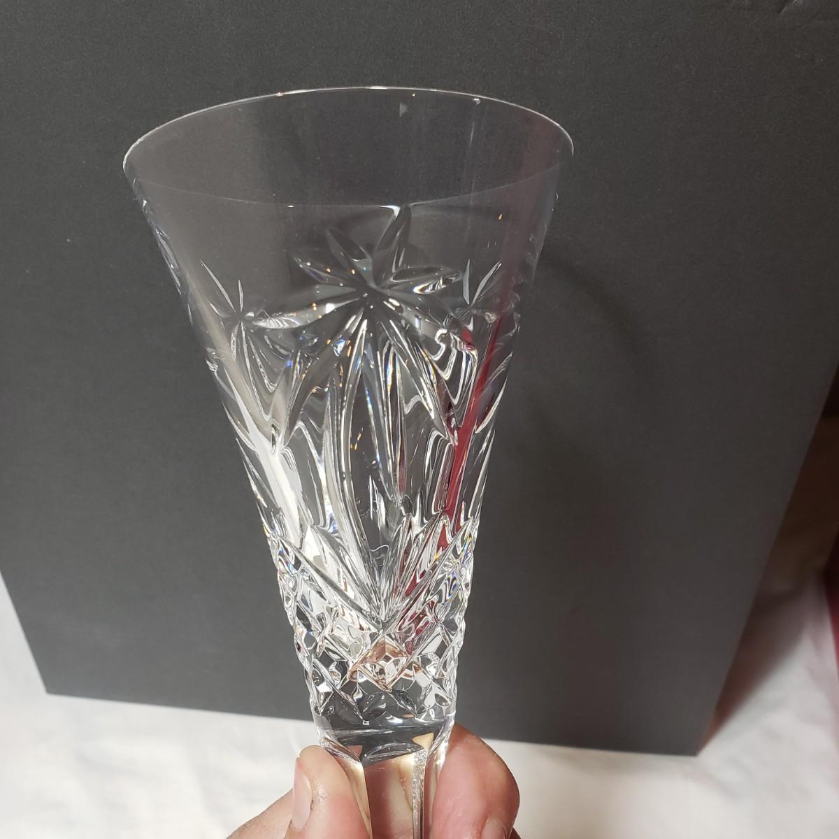 This is a three piece lot with two Baccarat pieces and two Waterford flutes. The vase measures 3" x 6"H and the bowl measures 10" x 2"H. The bowl is heavy. The two Waterford flutes are from their palm tree design. There appears to be no blemishes on any of the pieces.
