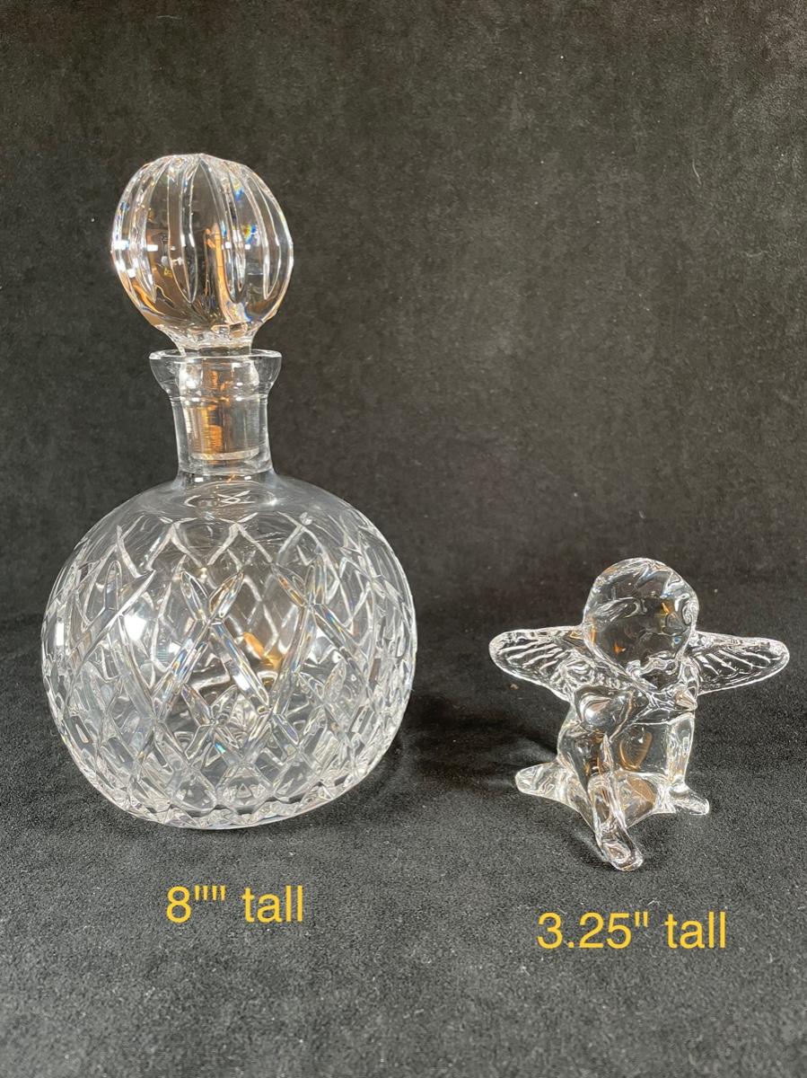Reserve is $45.00. Cut crystal bottle with stopper and a Baccarat Crystal cherub figurine