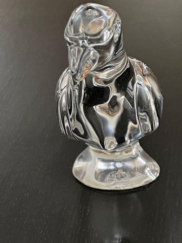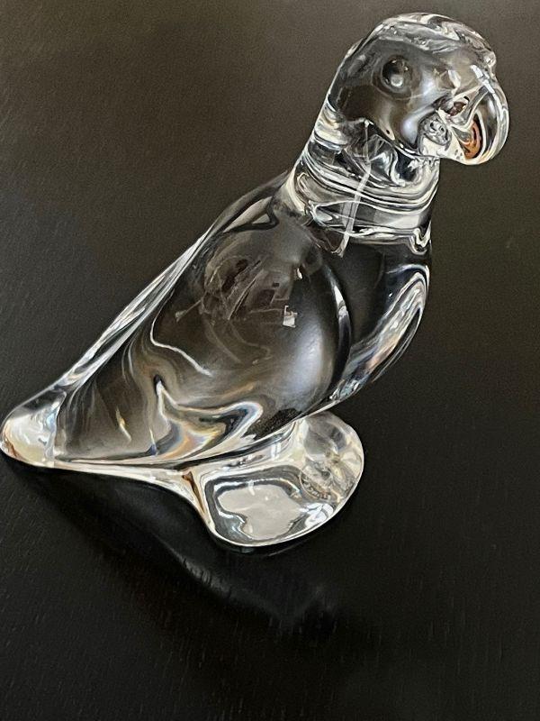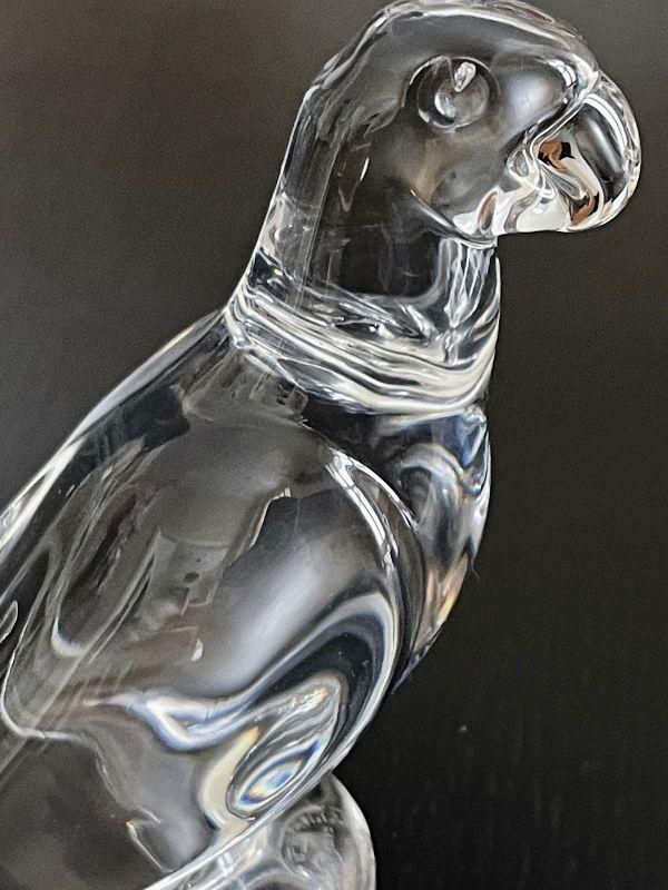 The subject item for auction sale is a vintage Baccarat clear crystal glass parrot figurine.