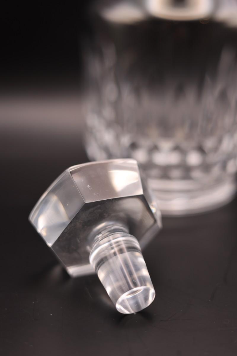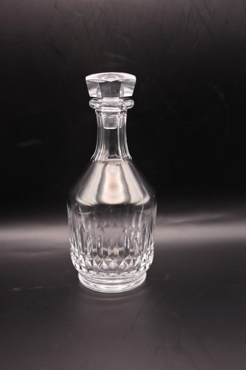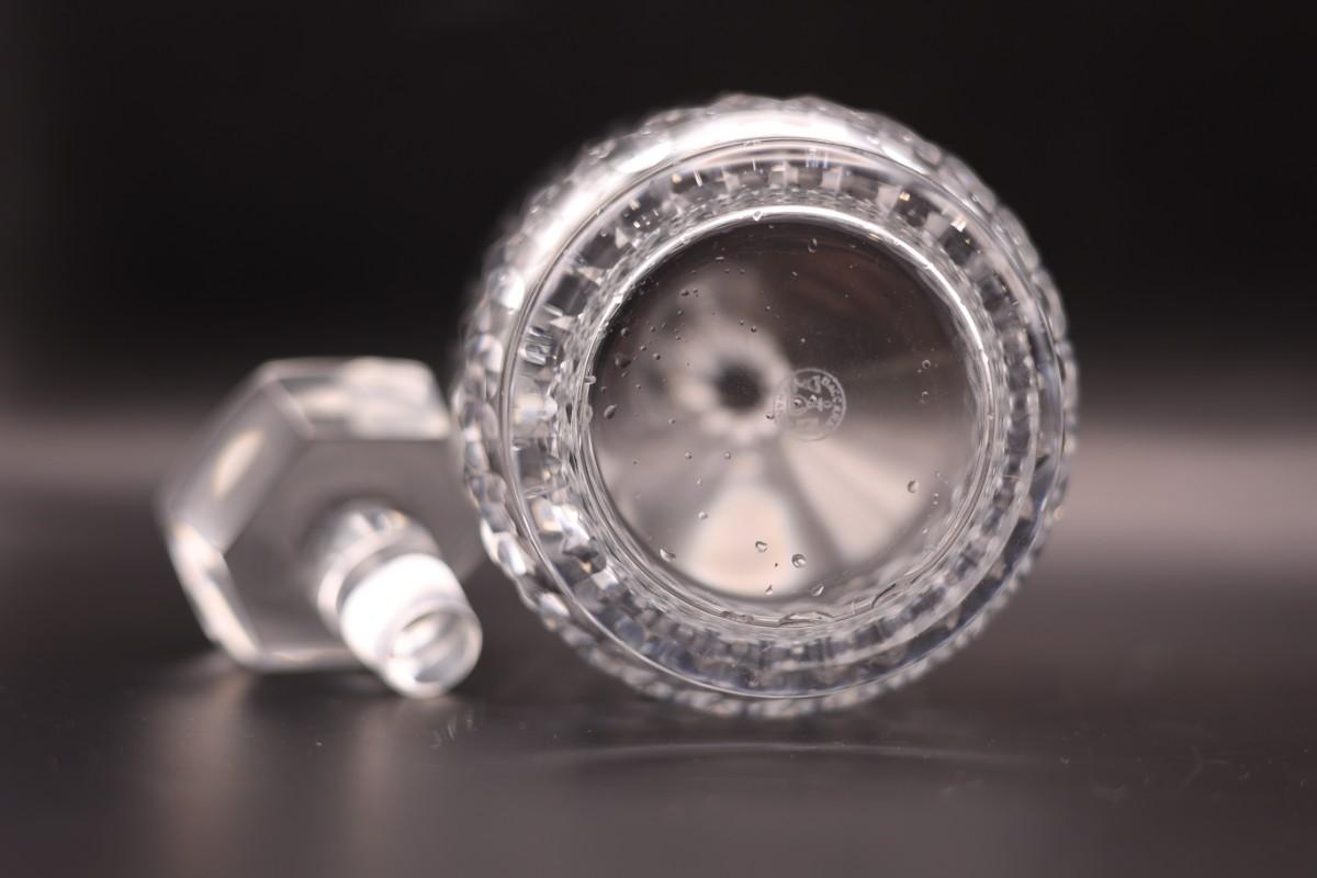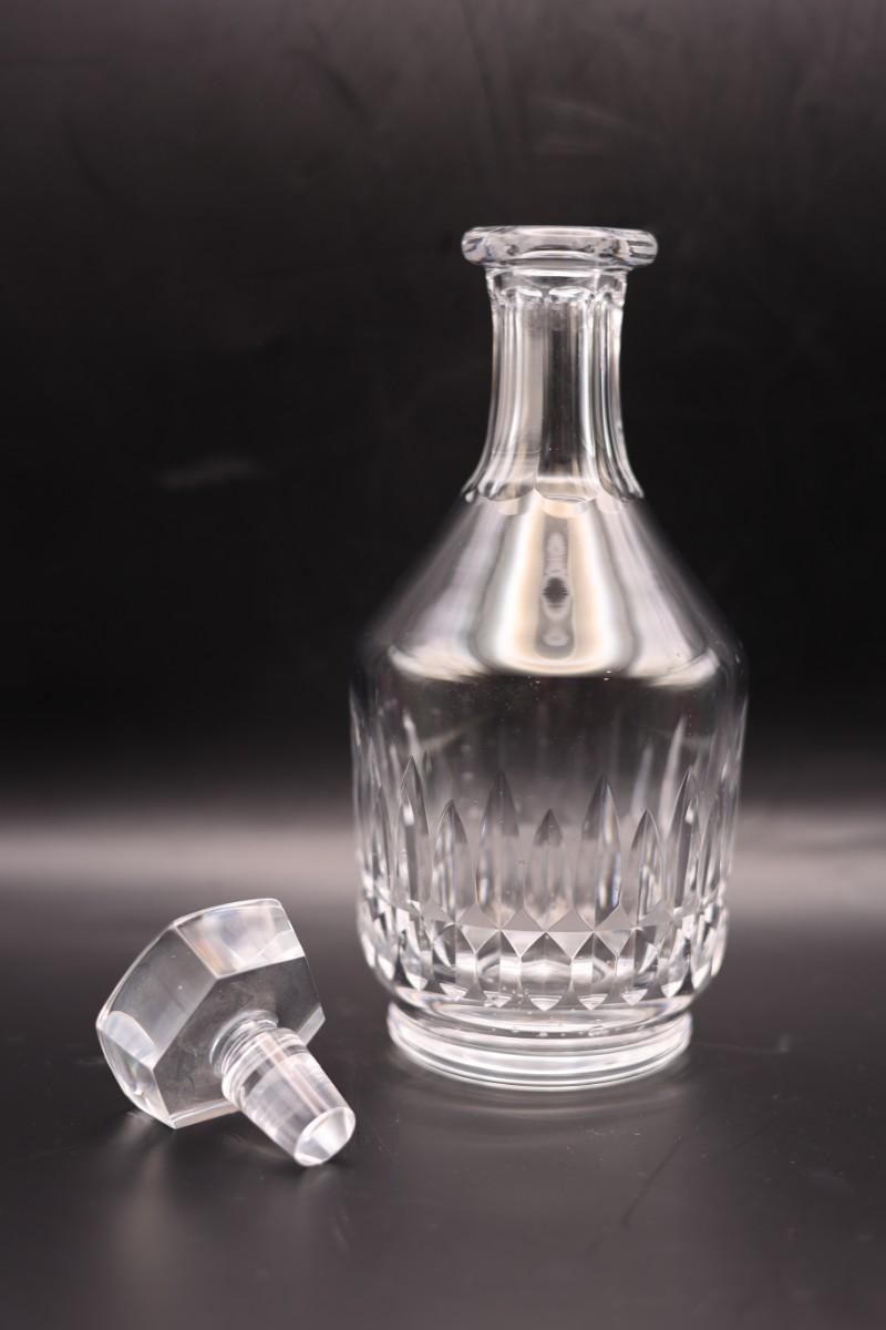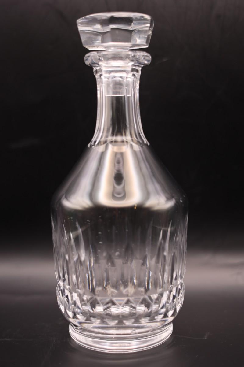 Clear crystal decanter with faceted detailing and matching stopper. Marked Baccarat. Appears in good condition with no visible chips or cracks noted.