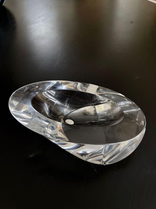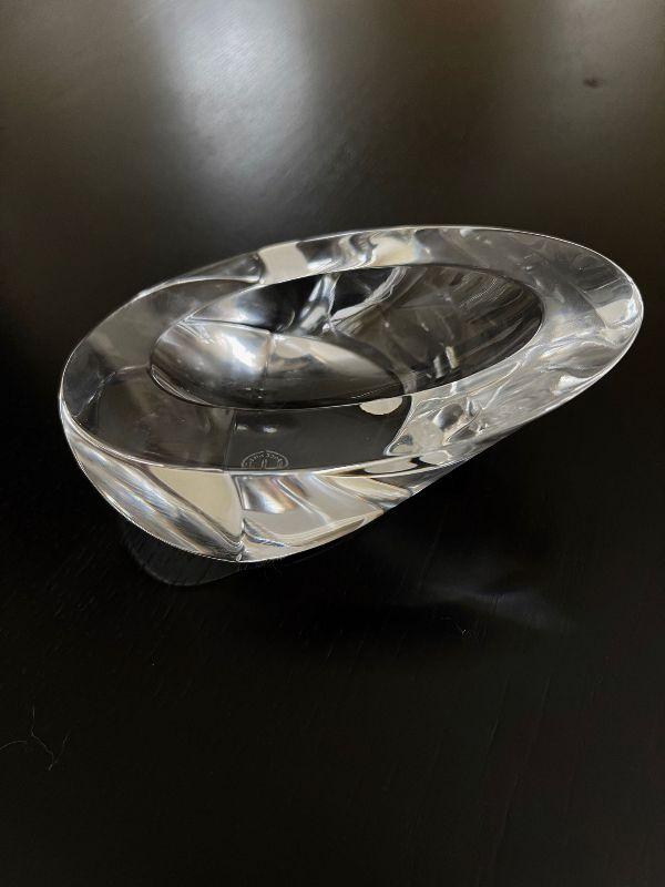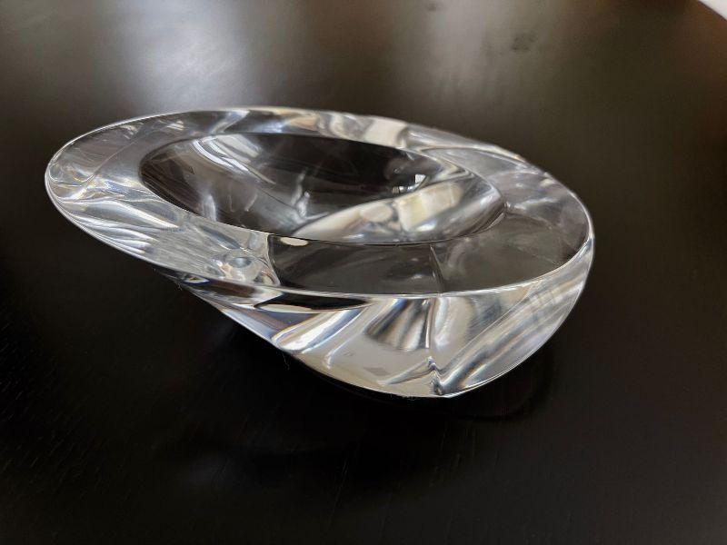 The subject item for auction sale is a hand crafted studio art glass of clear crystal and eliptical shape with a deeply beveled base. The concave bowl is made to rest a gentleman's or gentlewoman's pipe on his/her desk or chair-side stand.