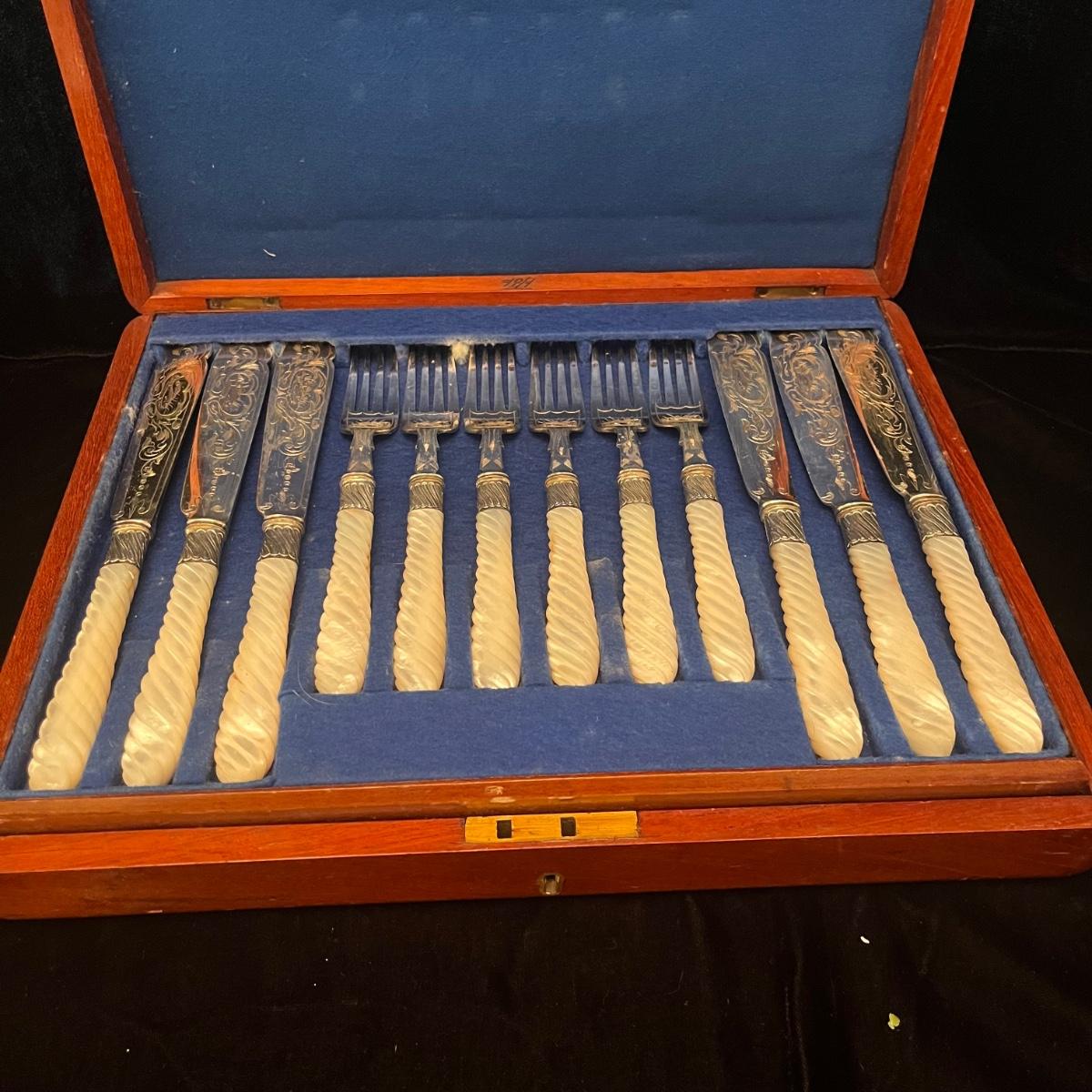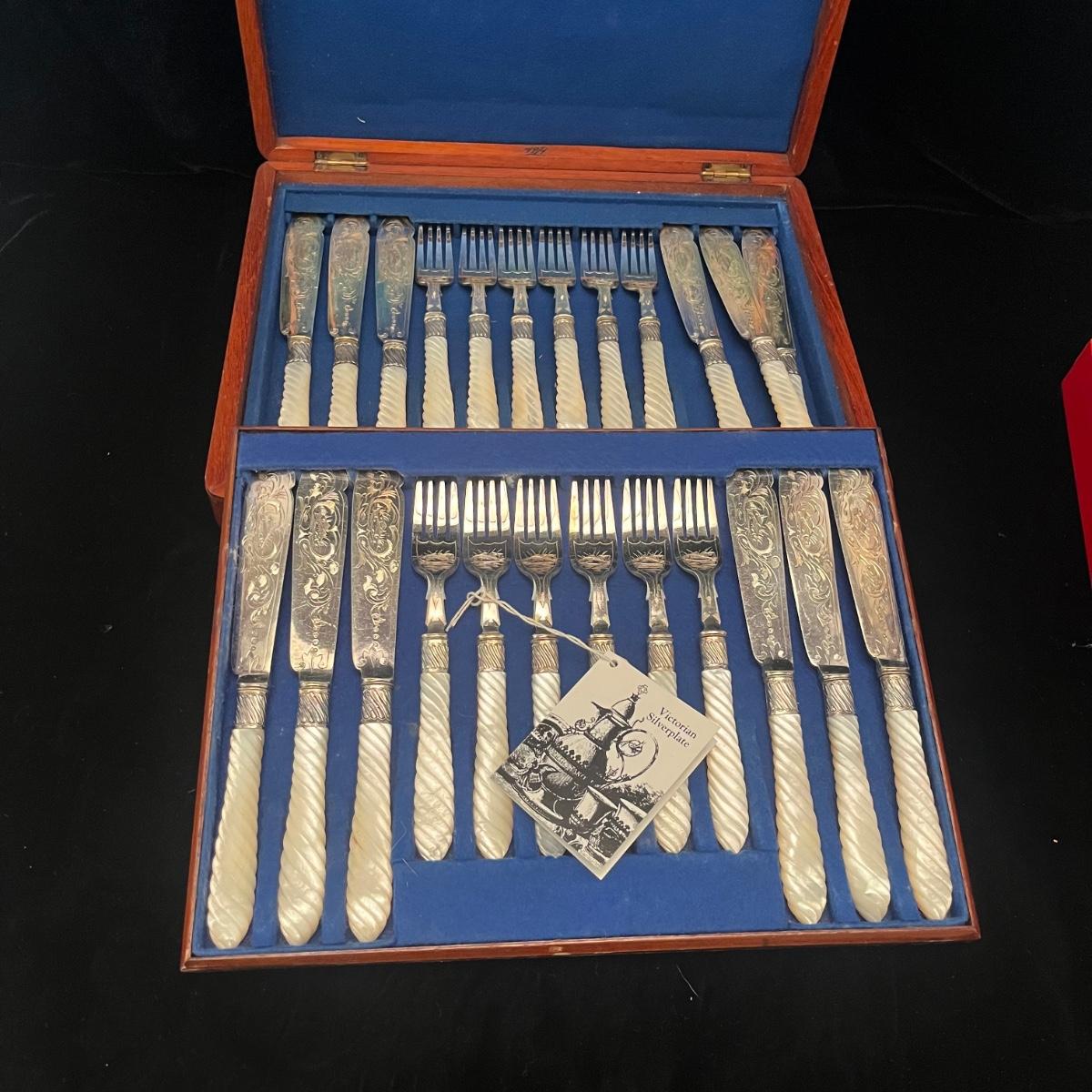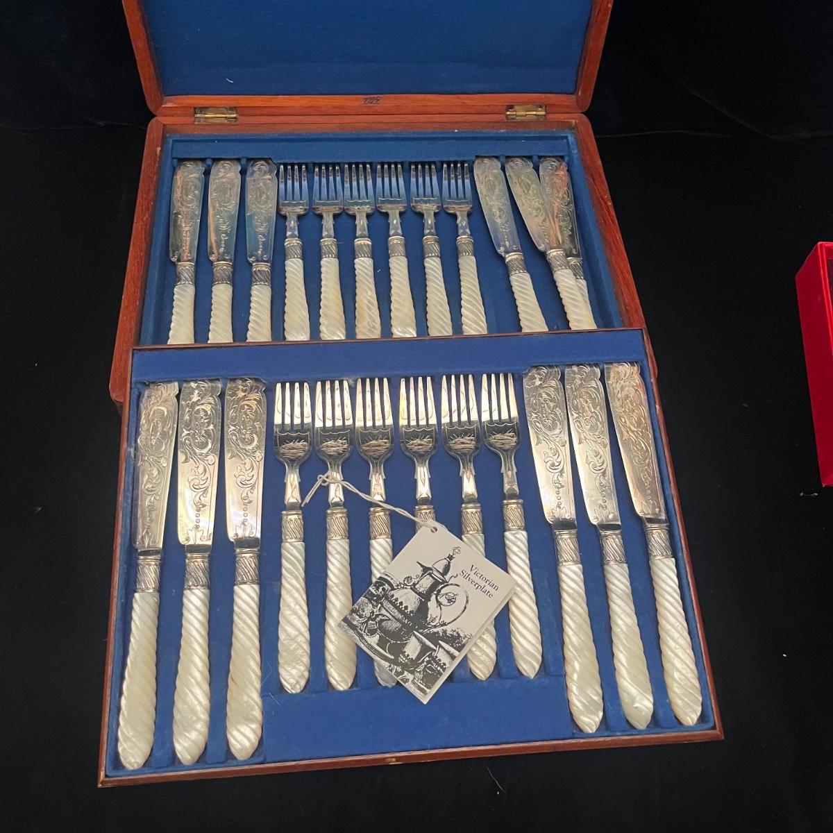Lot includes a 24 piece Victorian silverplate set with carved mother of pearl handles and wooden storage box. Also includes 15 Baccarat crystal knife rests. Wooden box measures 10” x 14” x 2.25”H.