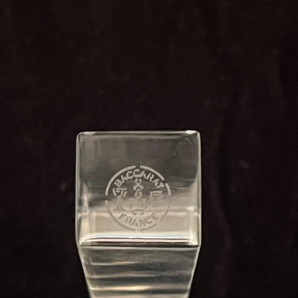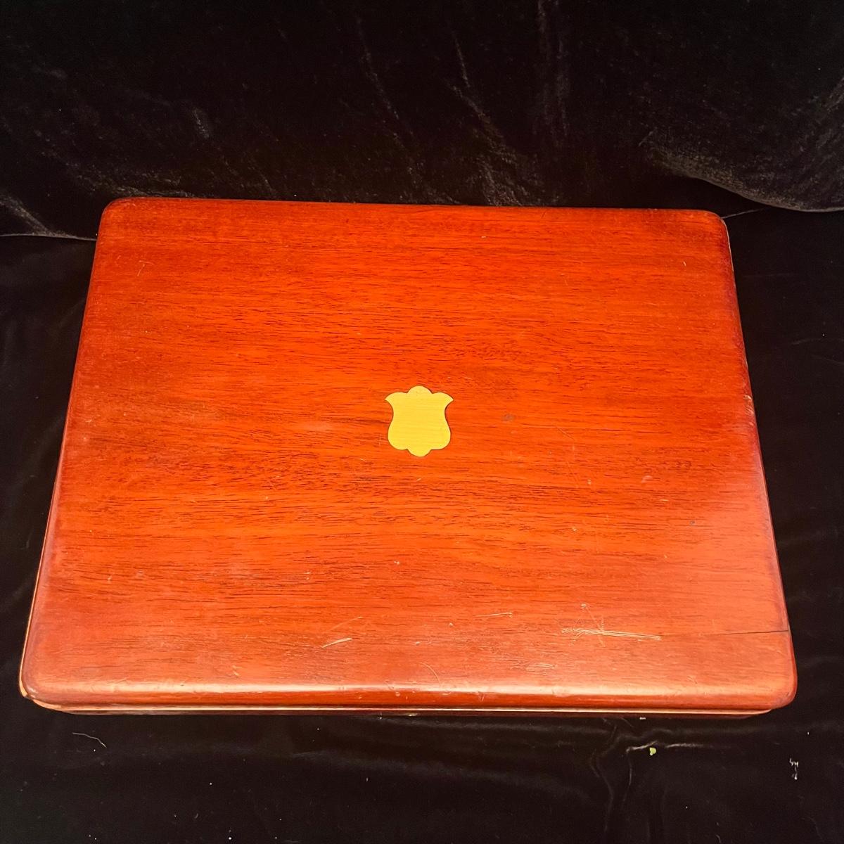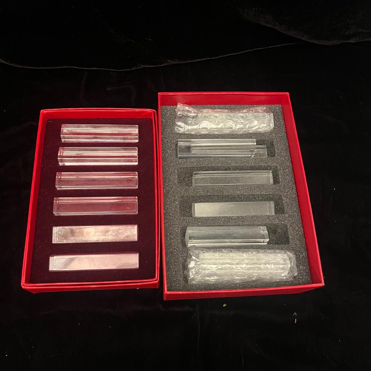 Lot includes a 24 piece Victorian silverplate set with carved mother of pearl handles and wooden storage box. Also includes 15 Baccarat crystal knife rests. Wooden box measures 10” x 14” x 2.25”H.