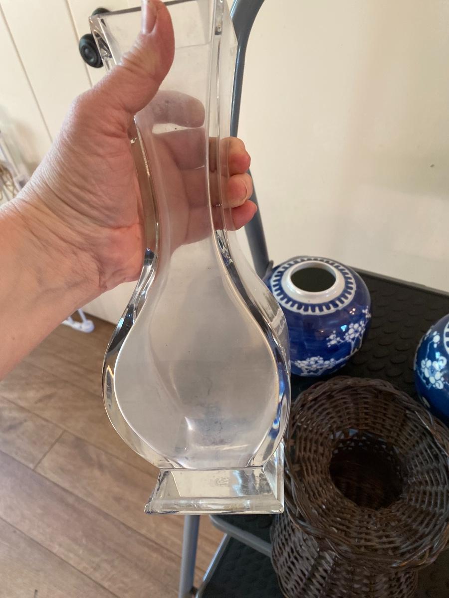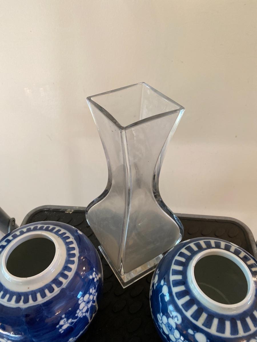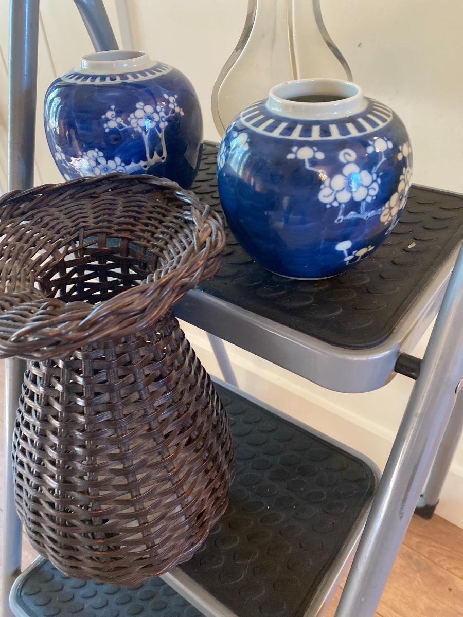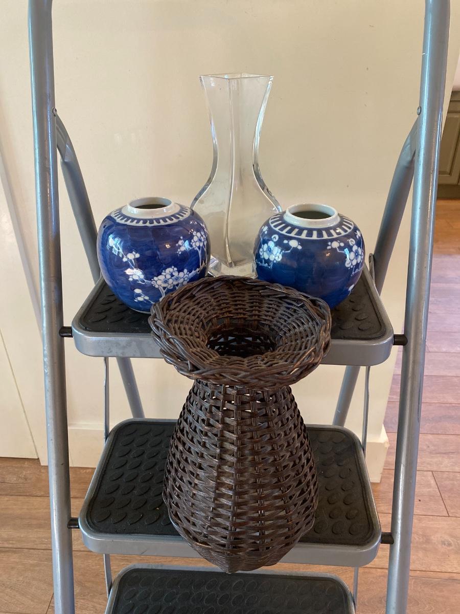 Includes a woven basket vase and pair of blue porcelain vases. 4 items. Baccarat vase is 10 inches high. (downstairs)