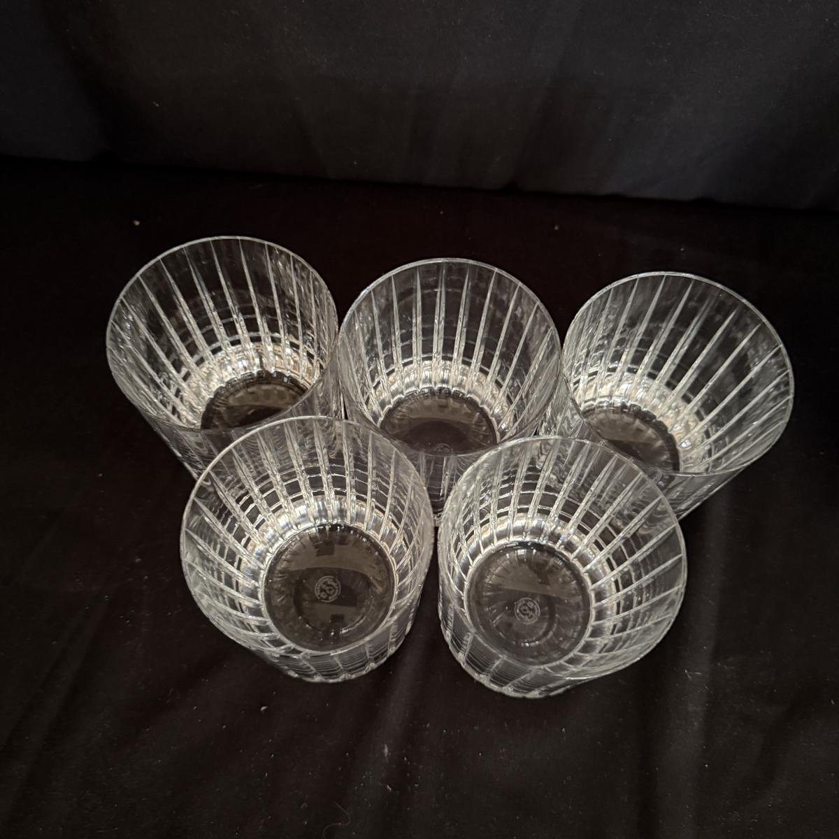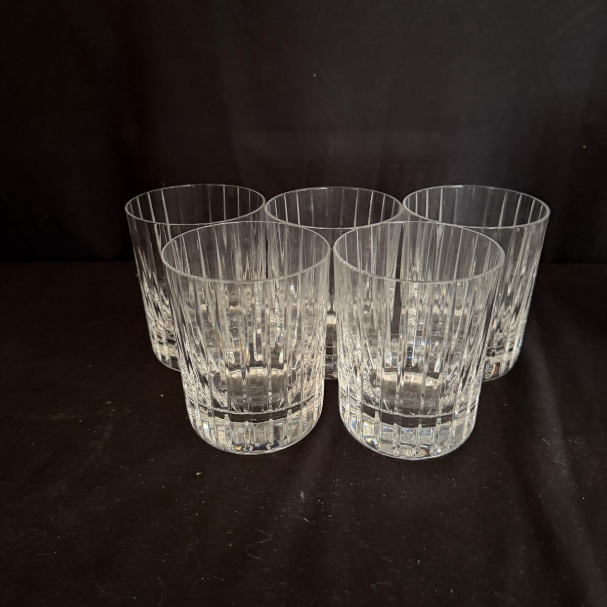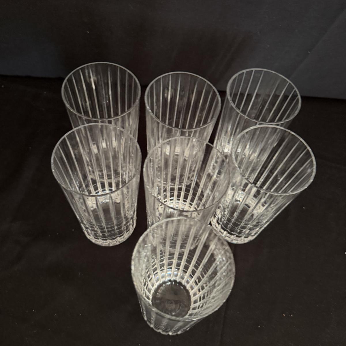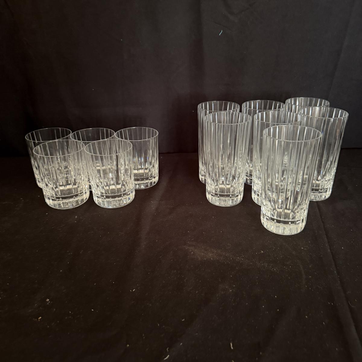 Lot includes five Baccarat high ball glasses and seven Baccarat tumblers. Both are in the Harmonies design. Tumblers measure 2.75”D x 5.5”H.