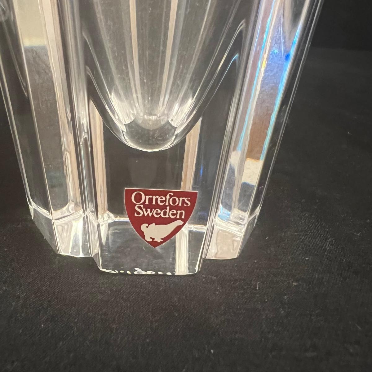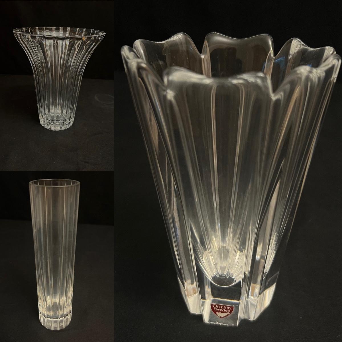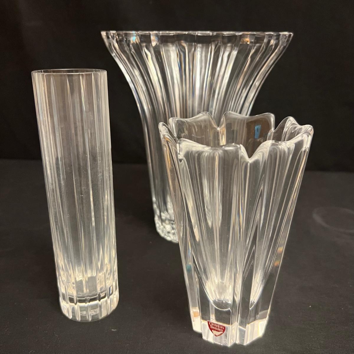 Three glass vases includes Baccarat and Orrefors. The largest vase is the unmarked one which measures 6.5”D x 8”H.