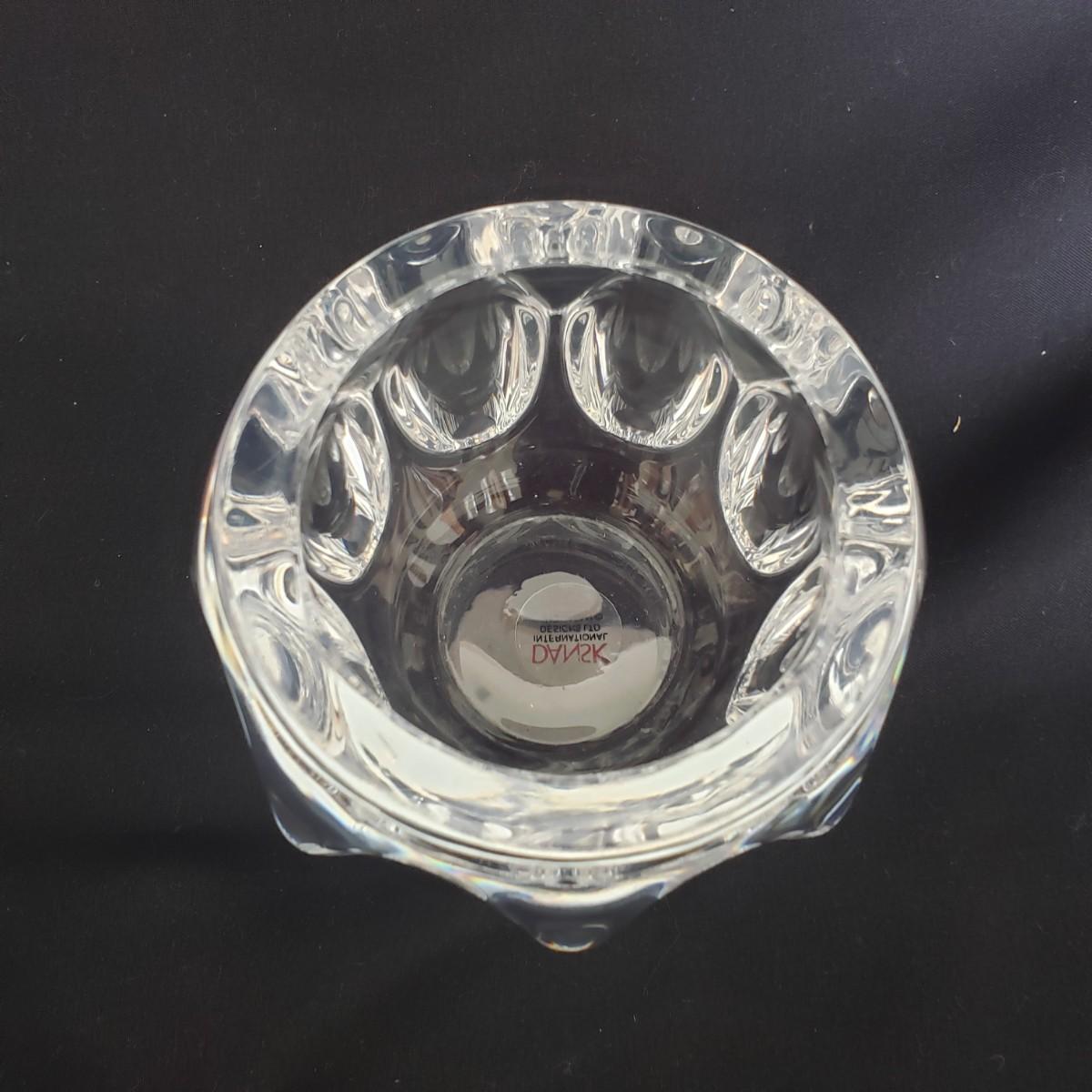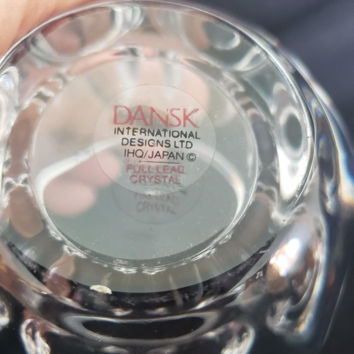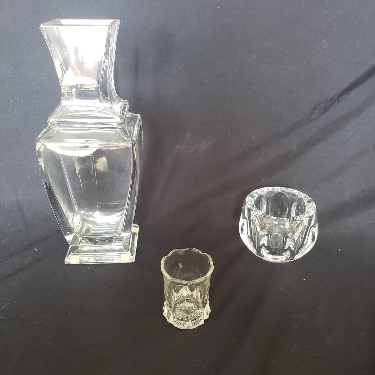 This three-piece lot features a Baccarat vase from France that measures 4" x 4" x 10" H. It is heavy to the touch. The Dansk bowl is a full lead crystal. The small vintage toothpick holder has a stylish bottom. It has a small crack on one of the scallops, see picture. It is smooth, so it is not a chip.