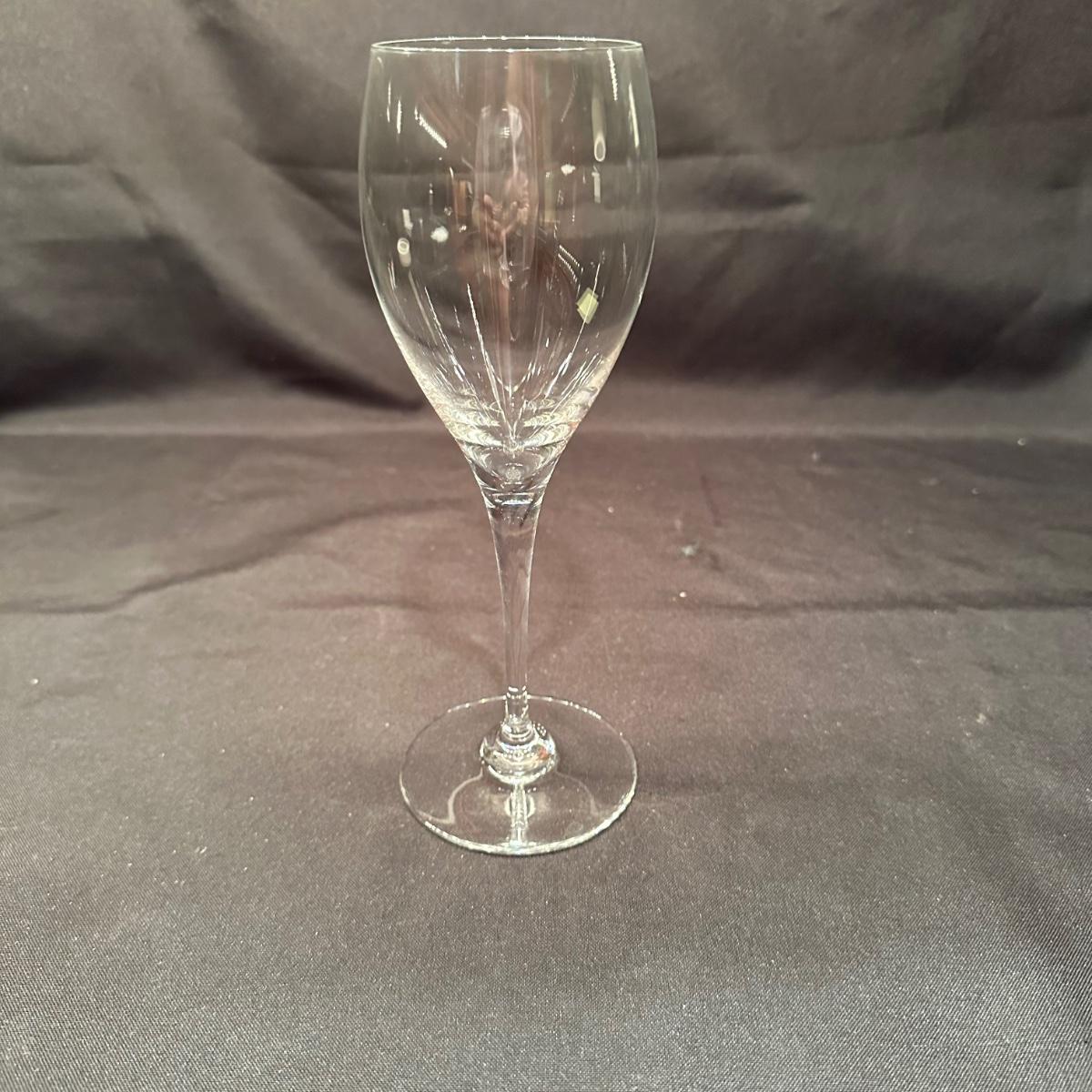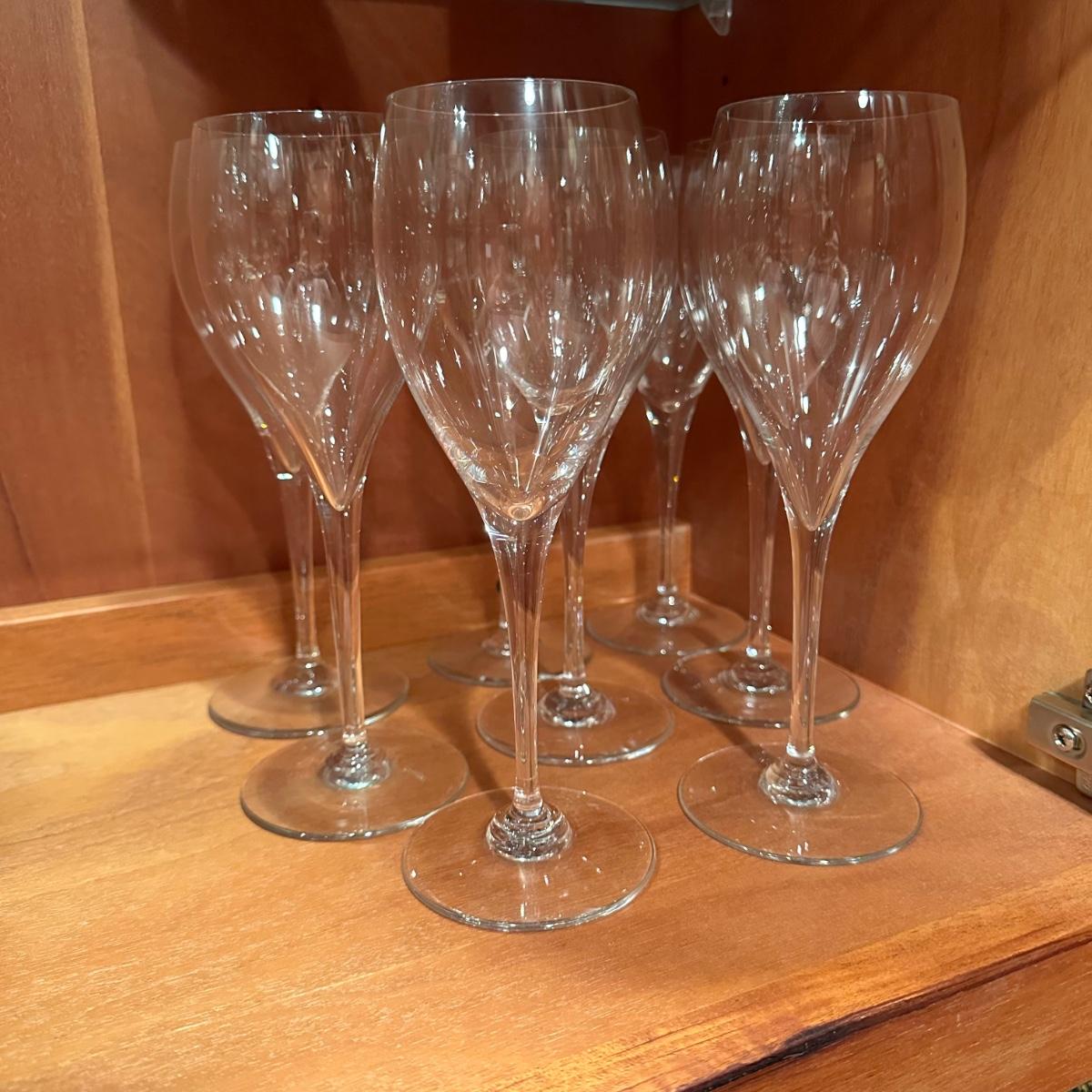 Eight Baccarat crystal wine glasses. Each measures 8.75”H. Shipping available.