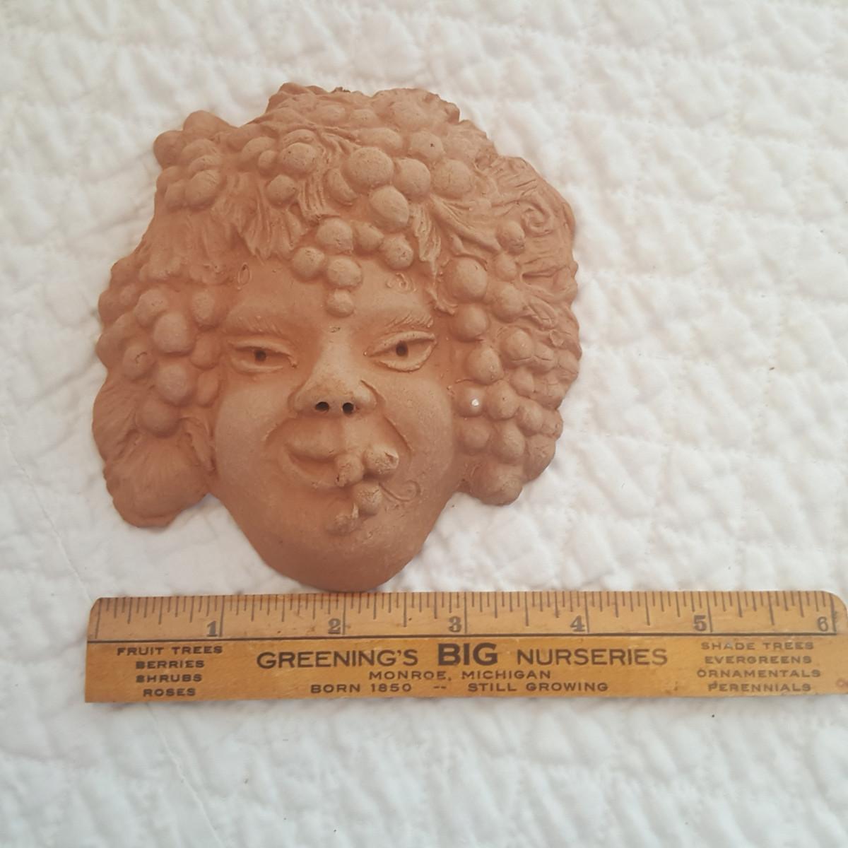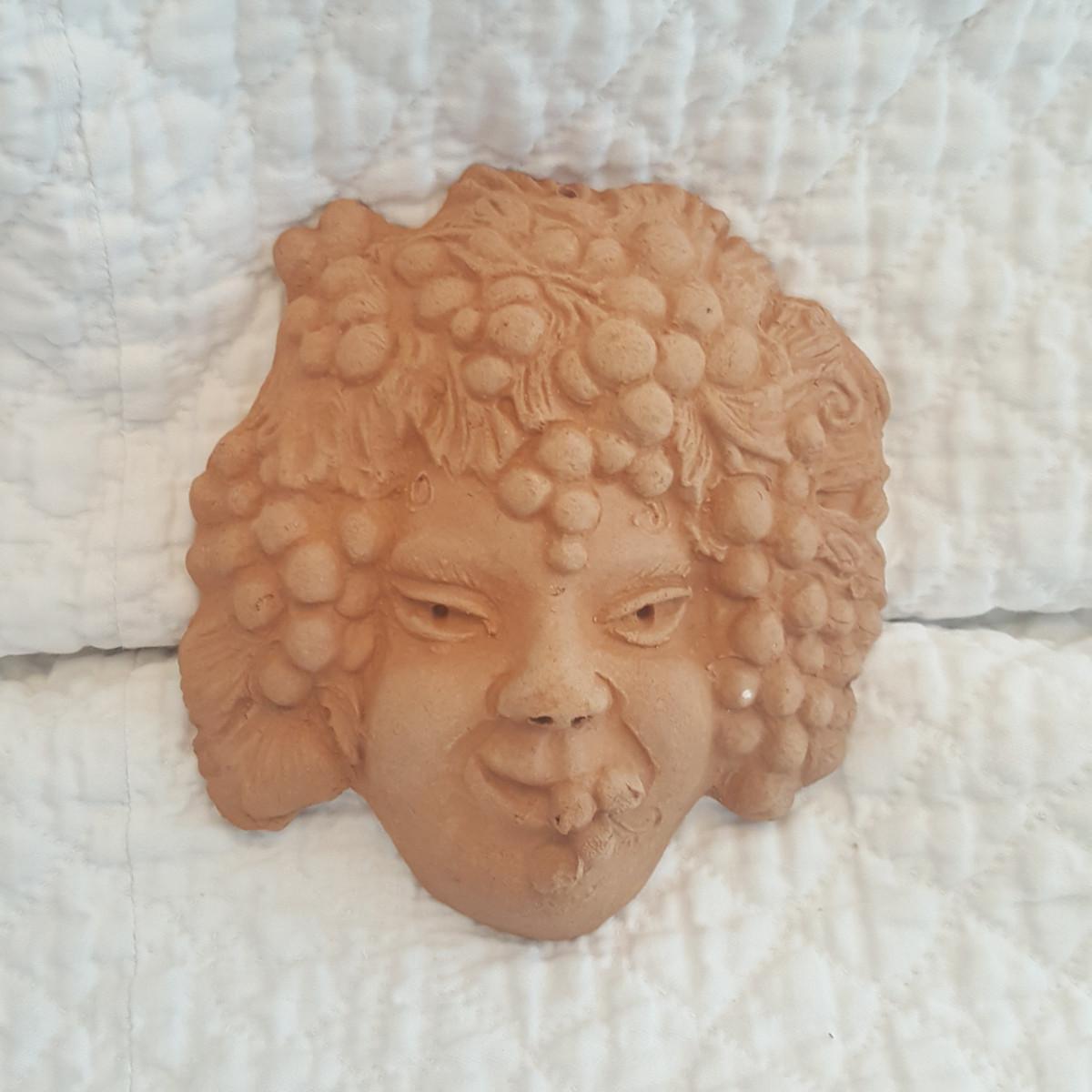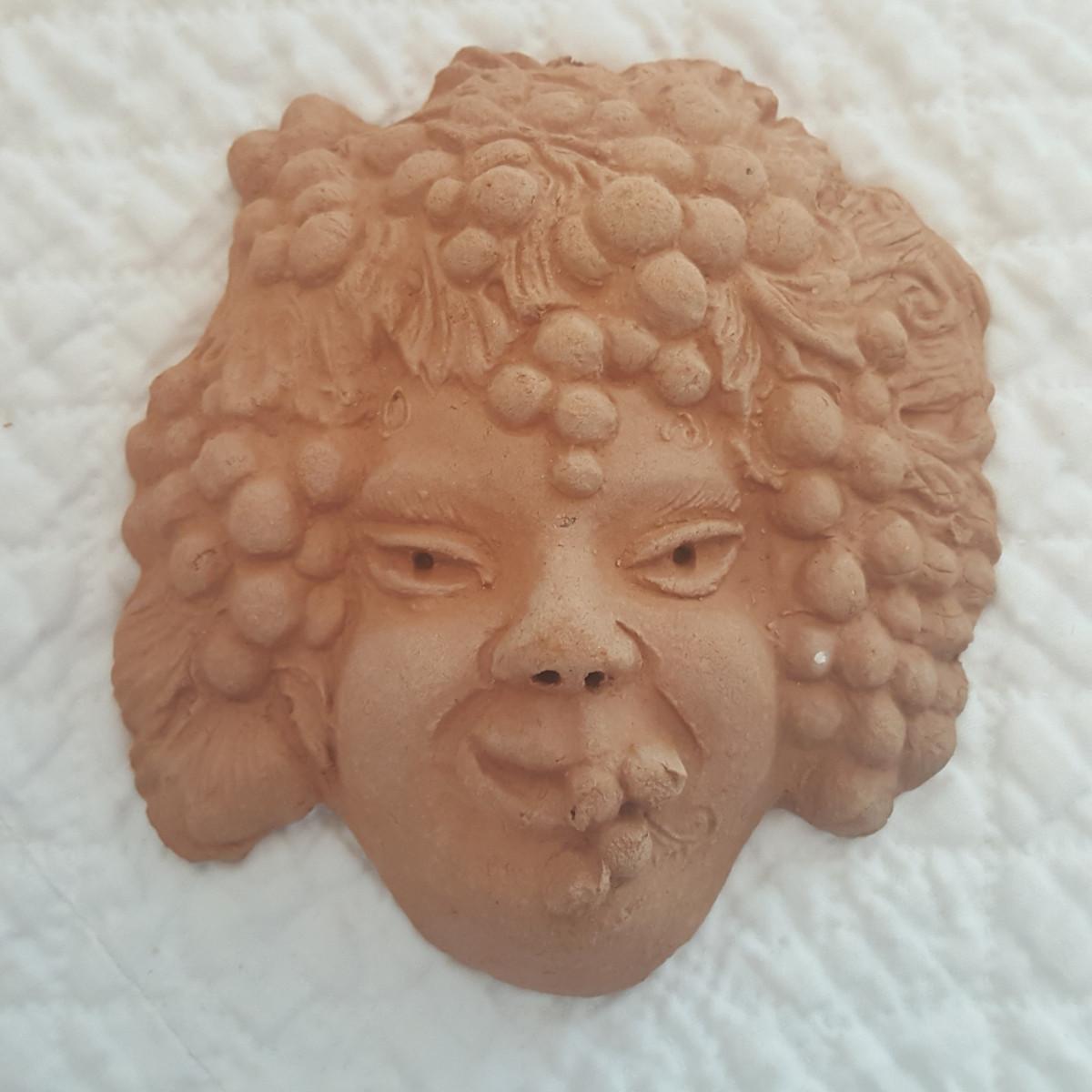 This auction lot is for a nice example of Bacchus in Terracotta. The sculpture measures about 4.5-inches squared. Creat for most any art project or to hand in your sunroom or on the patio wall. Originally Dionysus was the Greek god of fertility. Later, he came to be known chiefly as the god of wine and pleasure. The Romans called him Bacchus. Dionysus was the son of the supreme god Zeus and Semele, the daughter of a king.