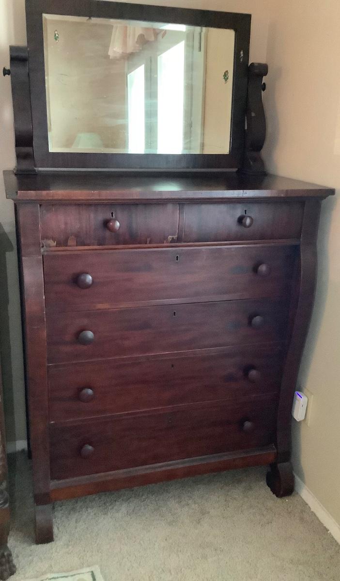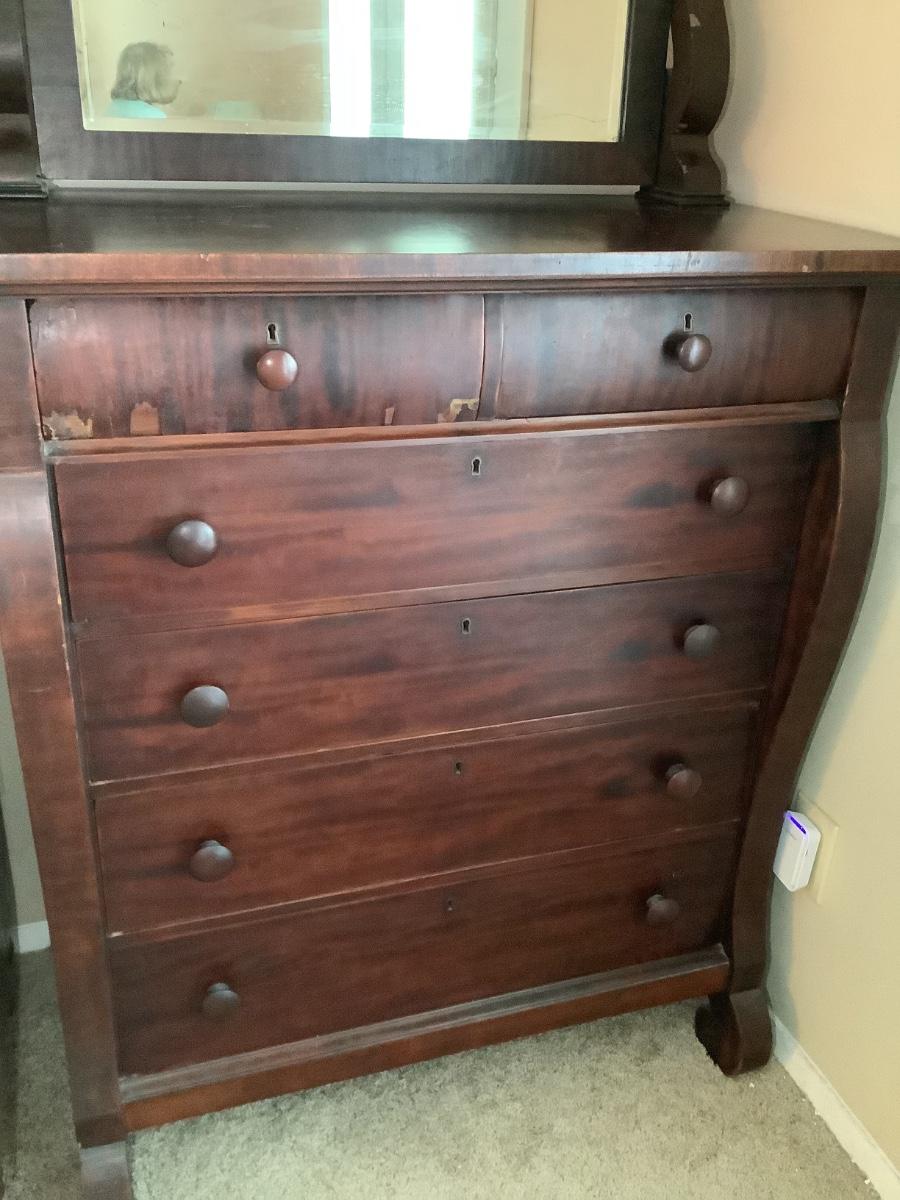 Bachelor's Chest, chest of drawers with beveled mirror, pin & cove, 6 drawers 40"W 20.5"depth 46" H to top, 69"H to top of mirror