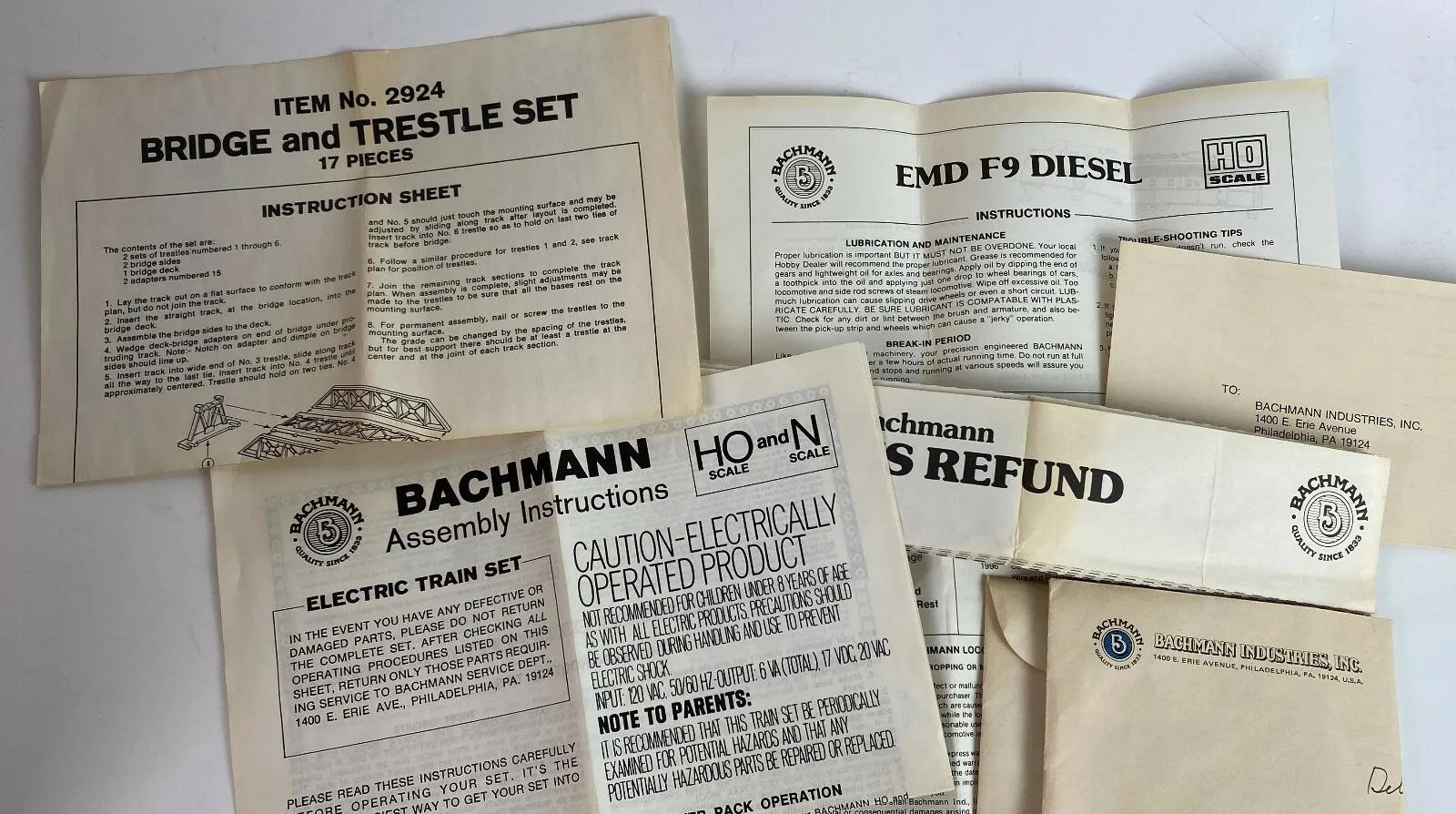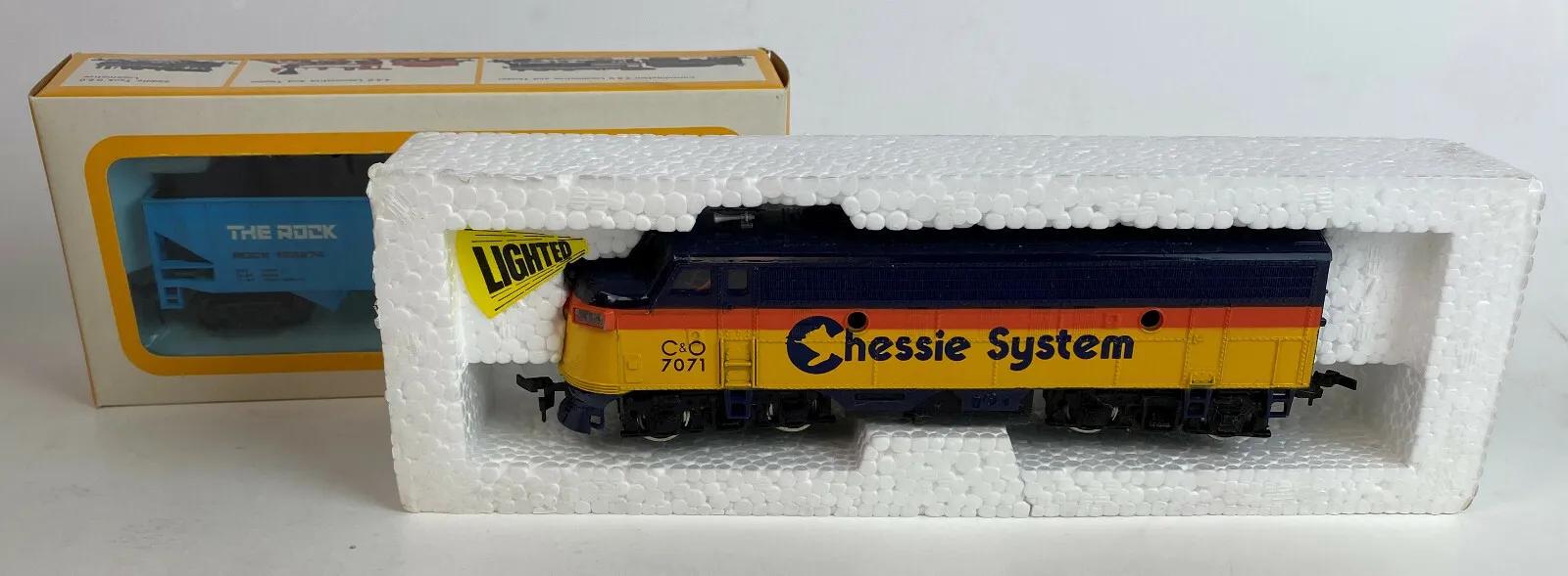 Here is a complete BACHMANN Sherwin Williams freight train set with a Chessie System F9 Diesel along with HO gauge steel track...All in new condition...Purchased in 1983...in its original shipping box..Unassembled Plasticville buildings...a Bridge and Trestle set...Tunnel...Paper instructions for assembly and operation...Power Pack..(5) cars.