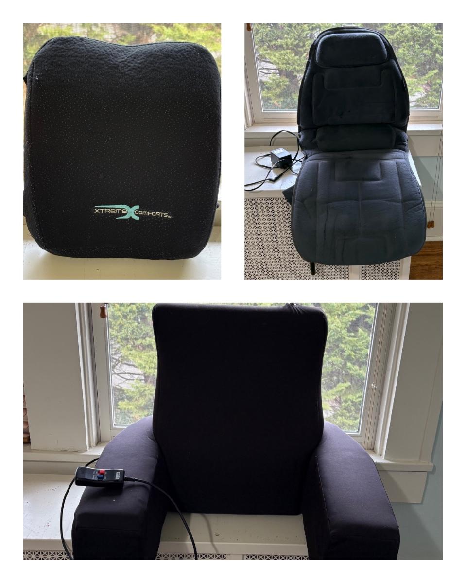 This lot includes 3 different units for back massaging and/or support. The Discovery Channel Massager/ Cushion Chair Relaxation system has measurements of approximately 26" x 19" x 24"H. This lot also includes a SNAILAX 10 Motors Massage Cushion with Heat and an Xtreme Comforts Memory Foam Lumbar Support Pillow.