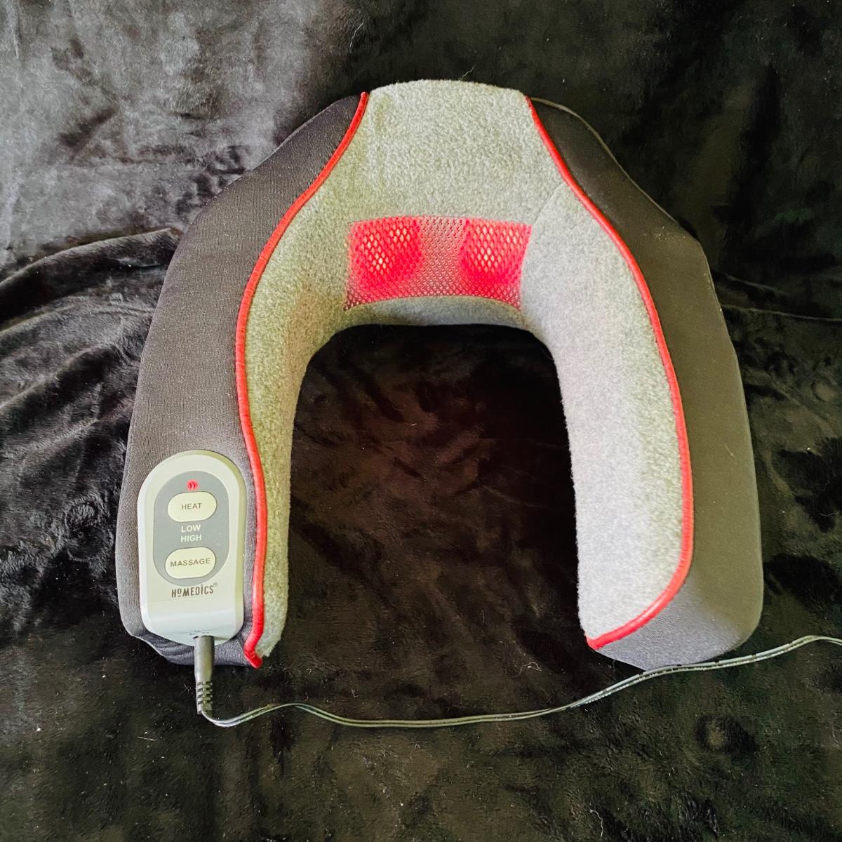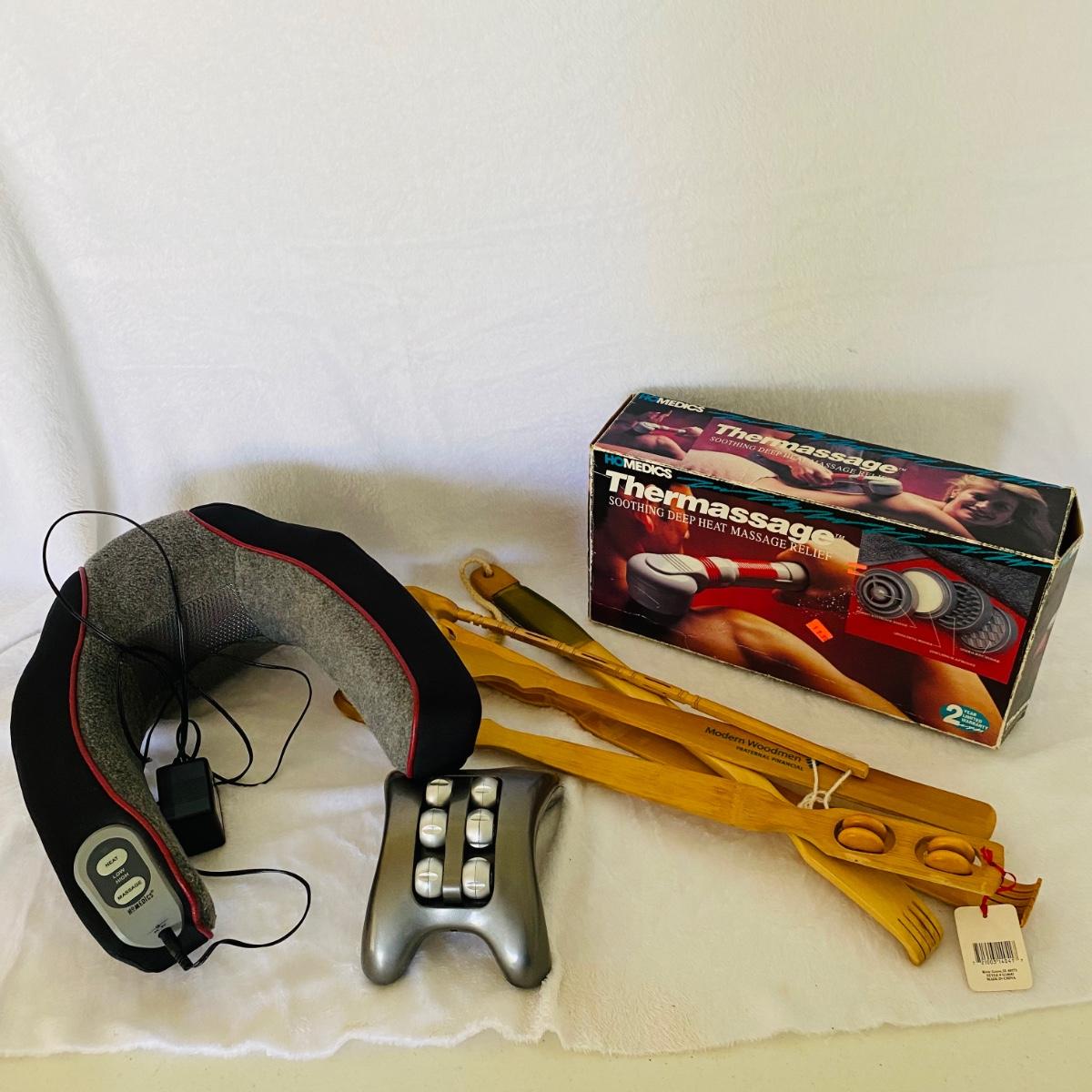 Two Homedics Back Massagers, small handheld massager, and five back scratchers. Power on when plugged in.