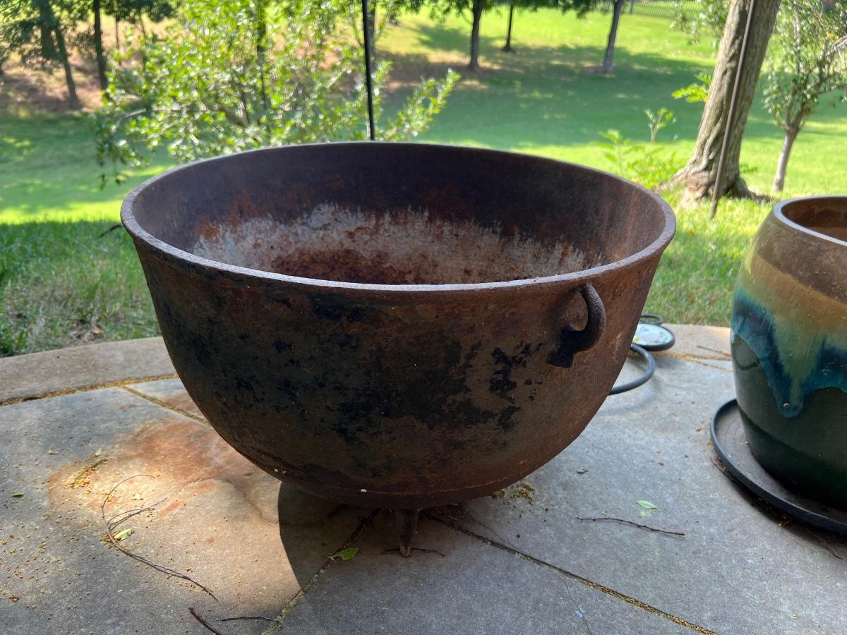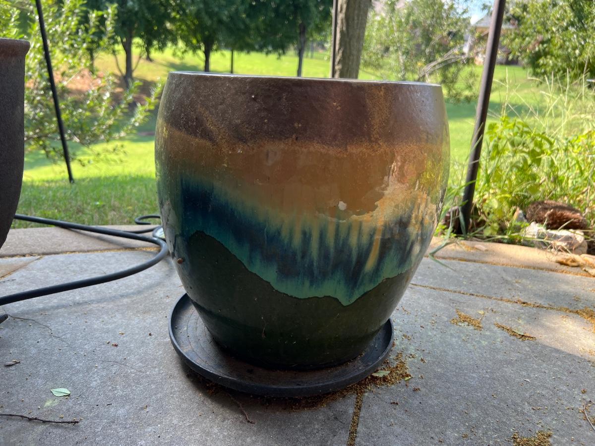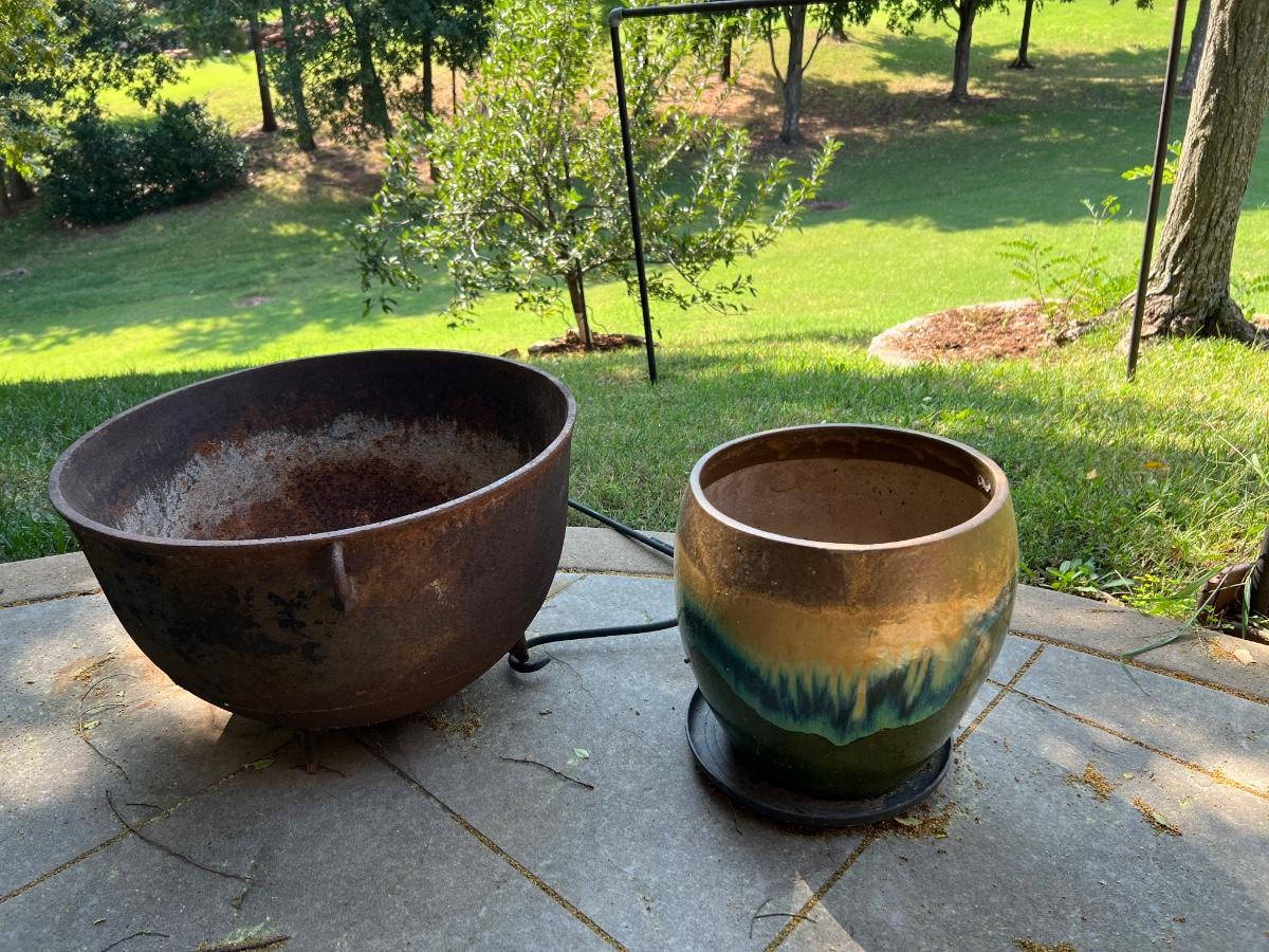2 large pots on the back porch. One is cast iron - not drilled the other is glazed pottery. there is also a shepherds hook.