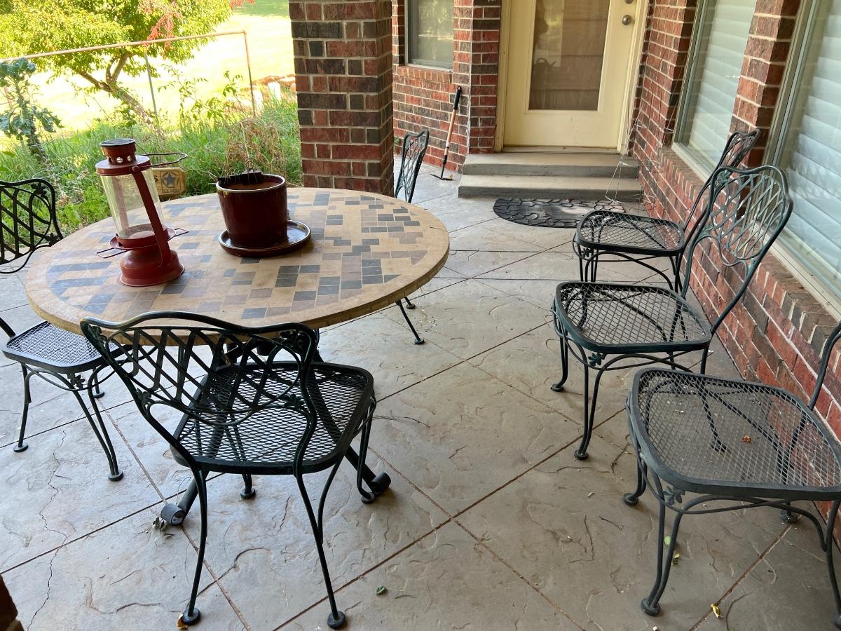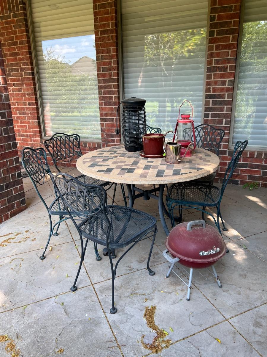 Tiled table and 5 iron chars. Small grill and small patio items and pictured