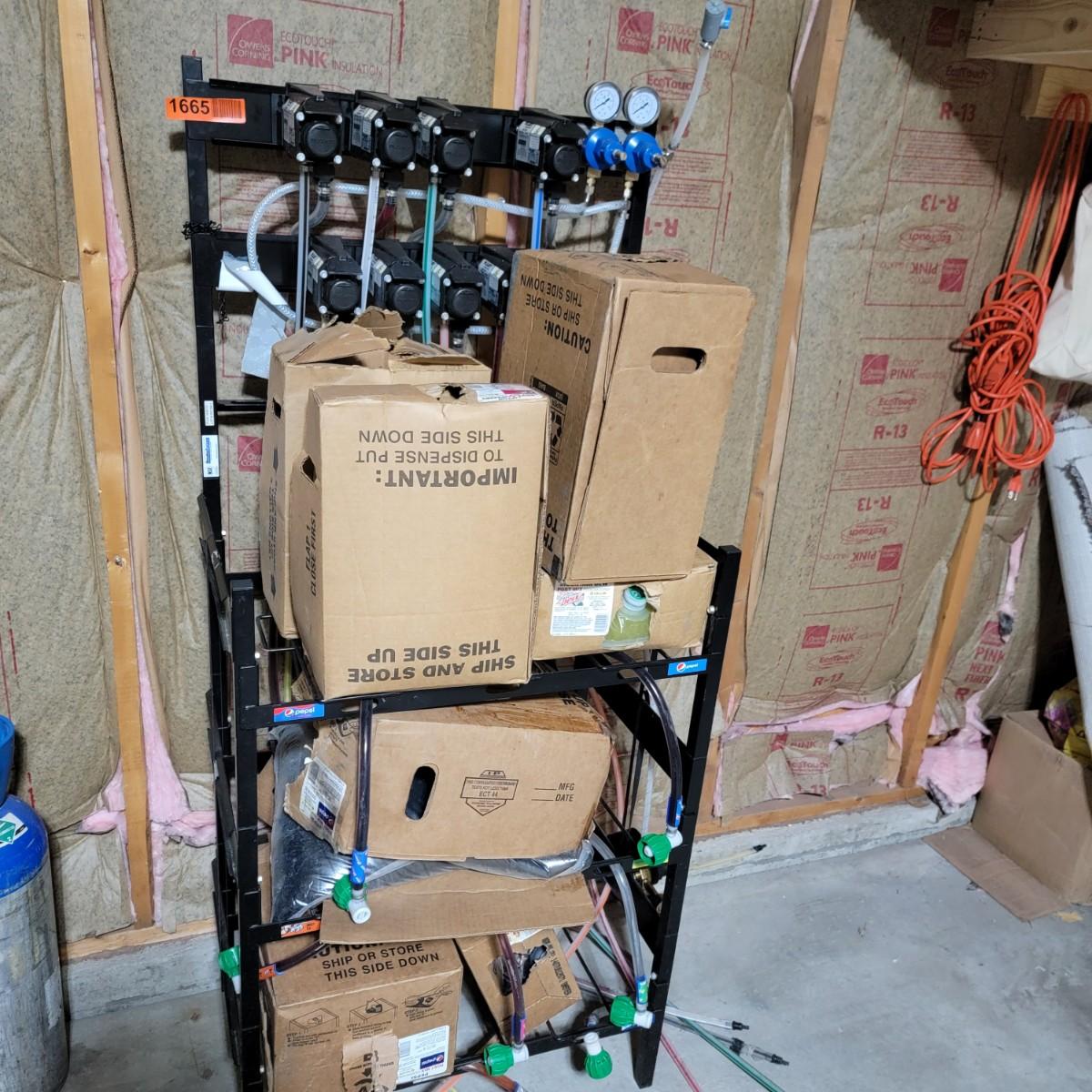 Back room rack for pop, with 7 partial boxes of assorted pop