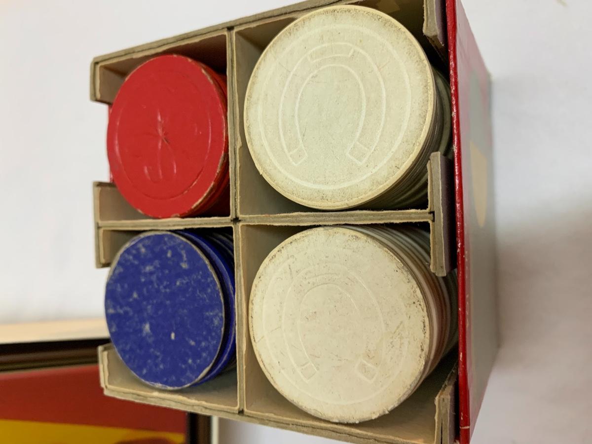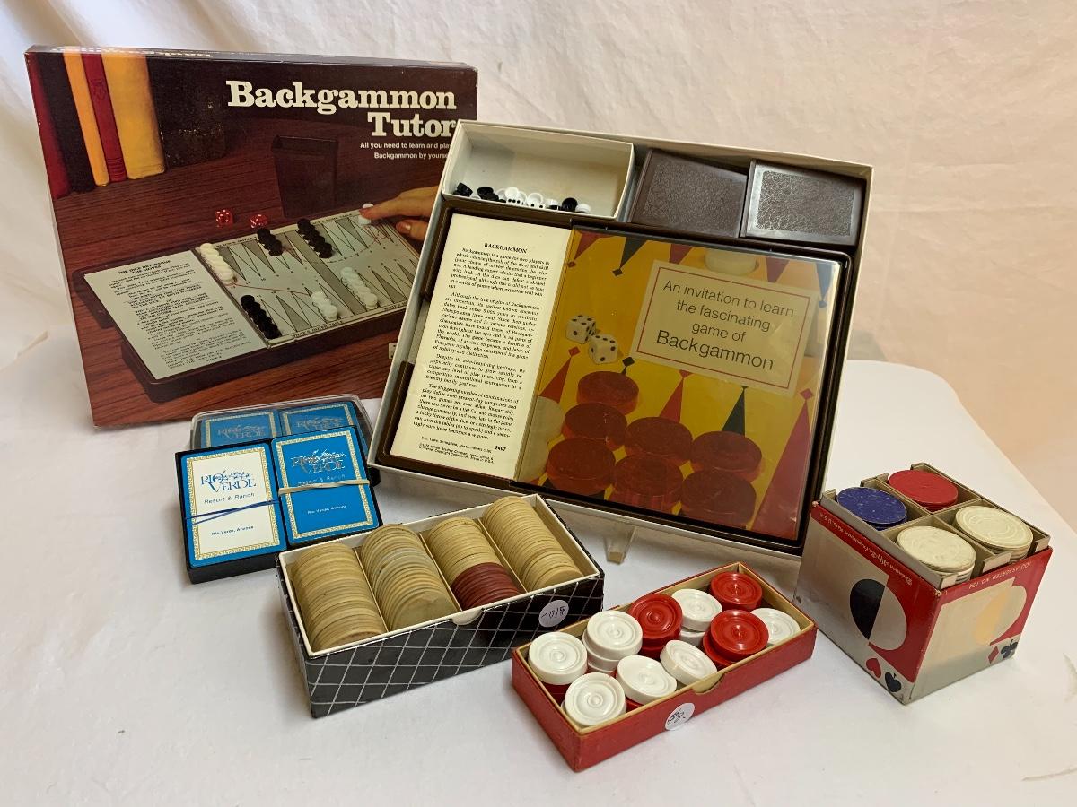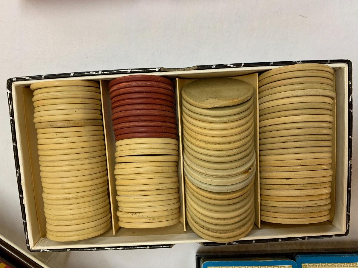 Backgammon tutor, vintage playing cards and paper and possibly wood poker chips.Small box of checkers, too.