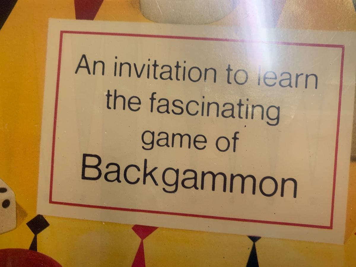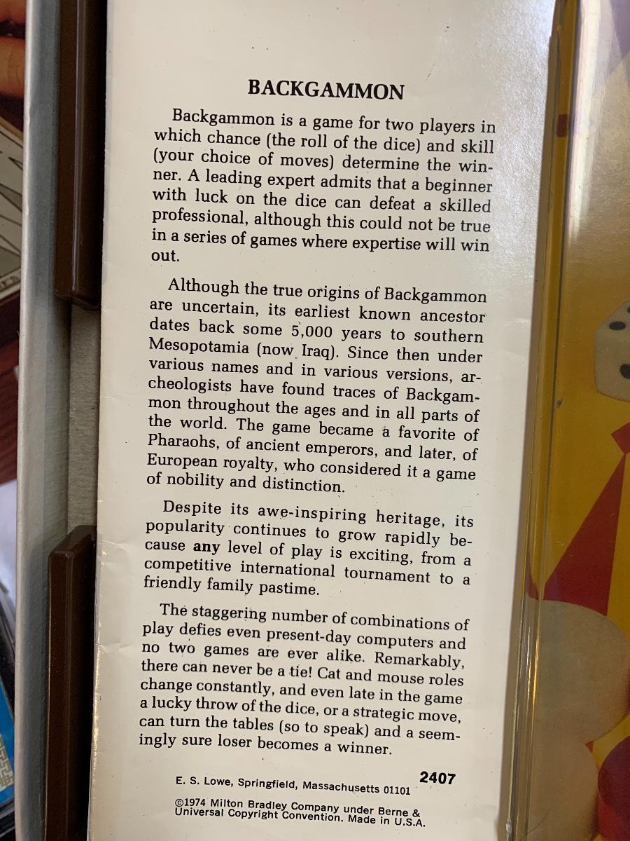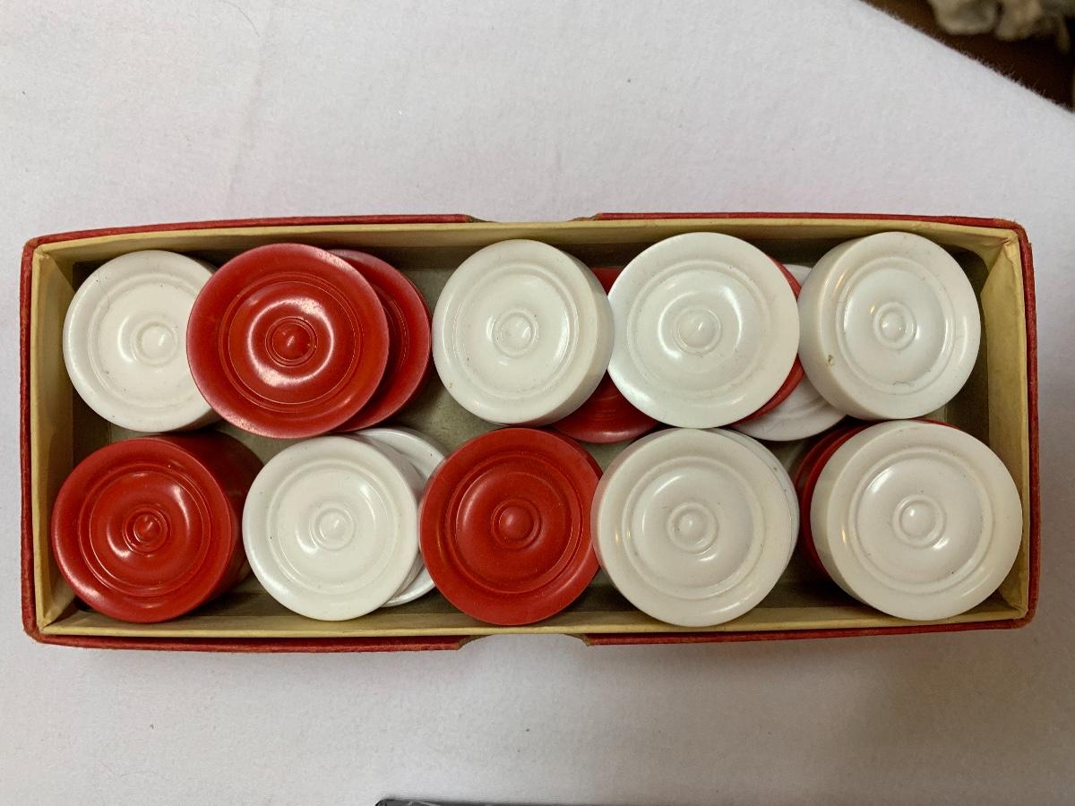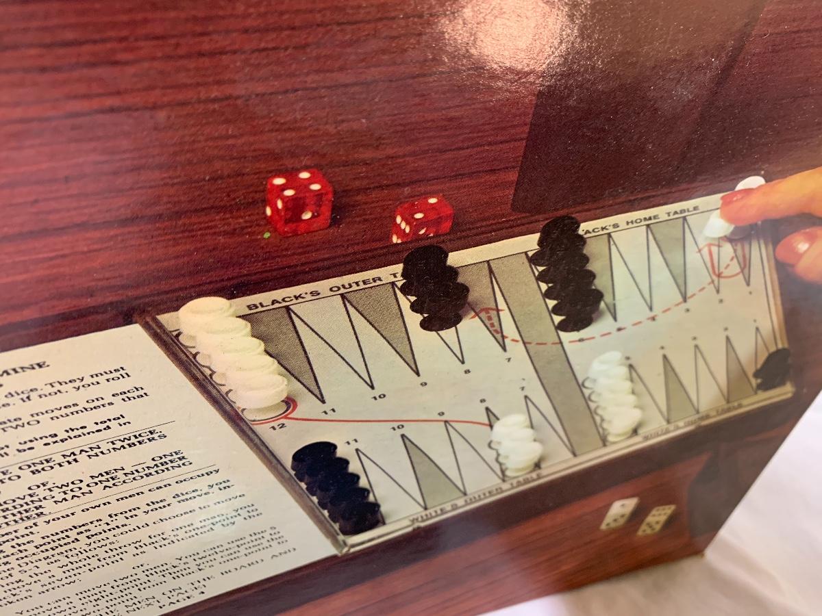 Backgammon tutor, vintage playing cards and paper and possibly wood poker chips.Small box of checkers, too.