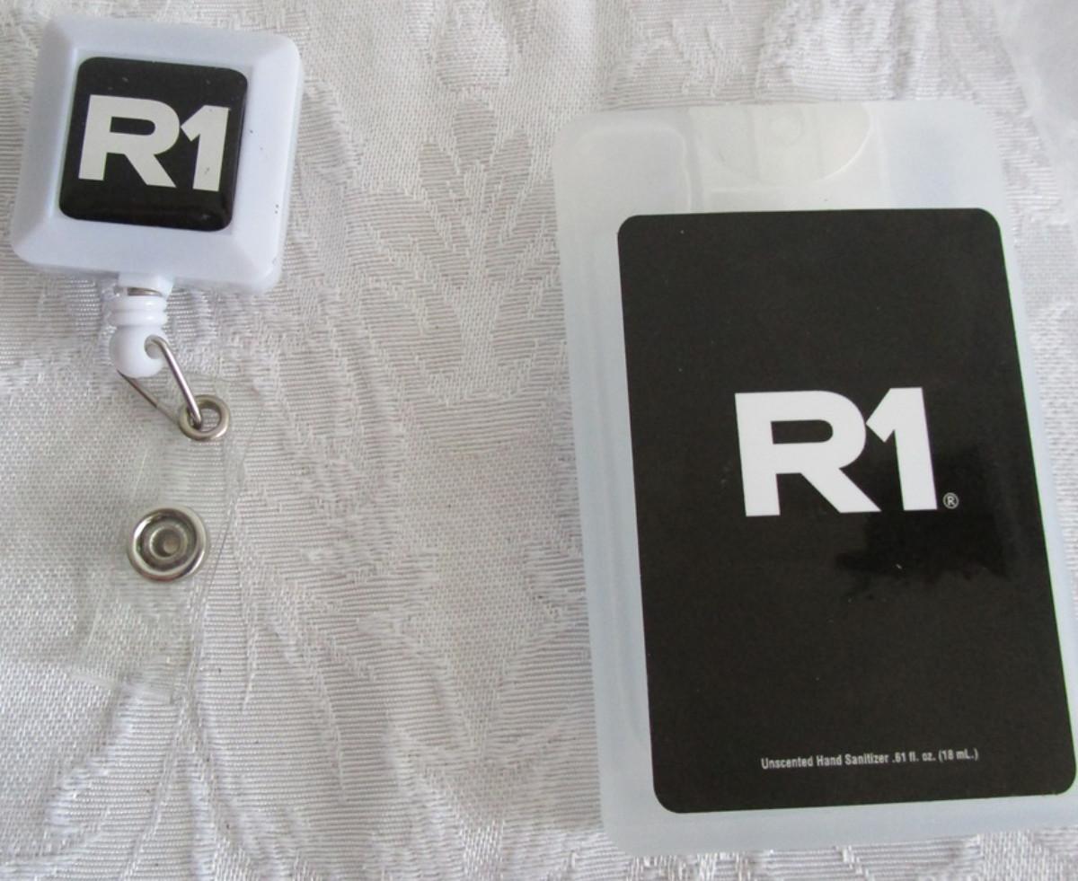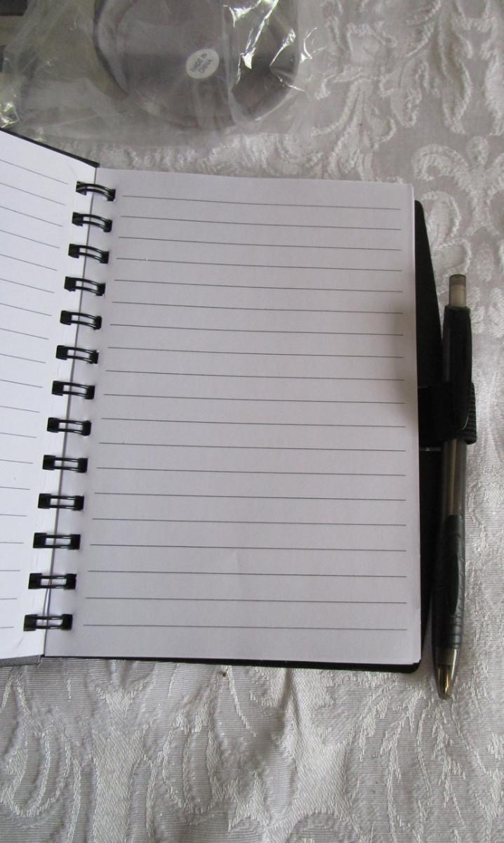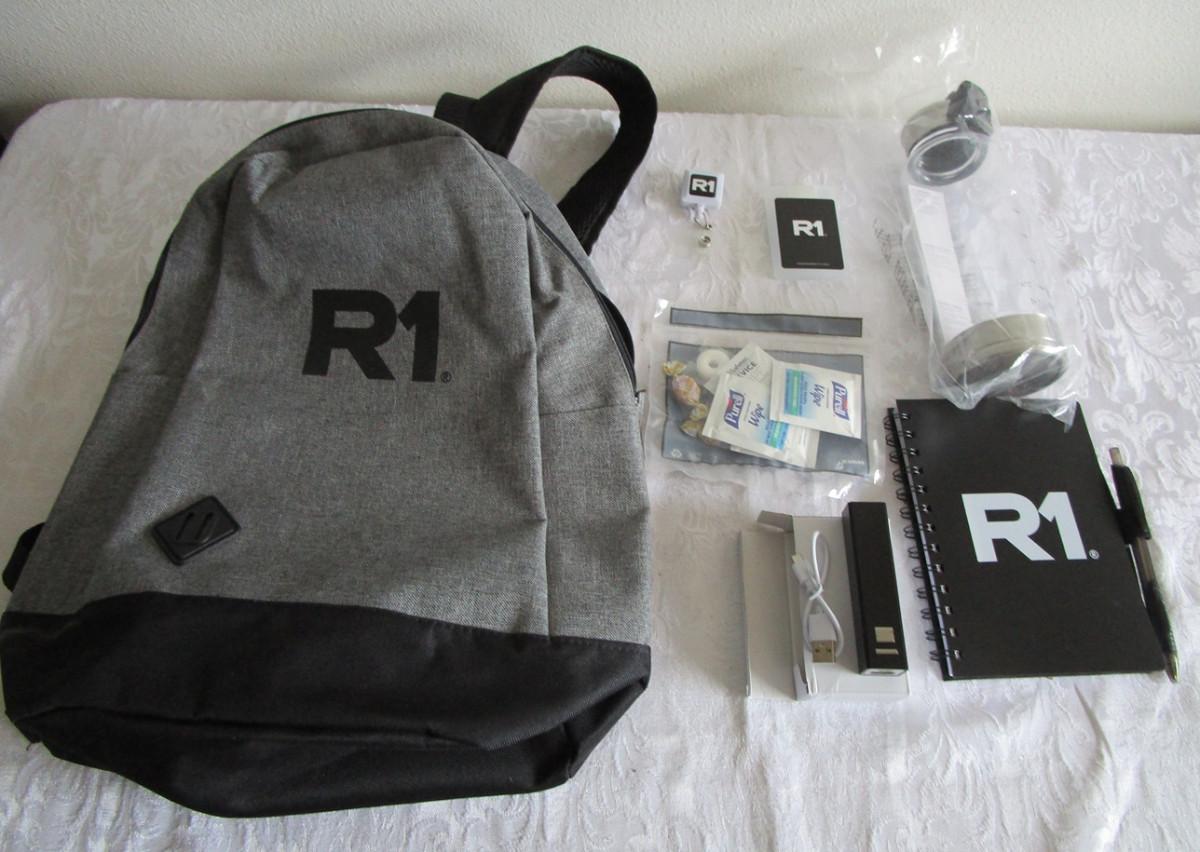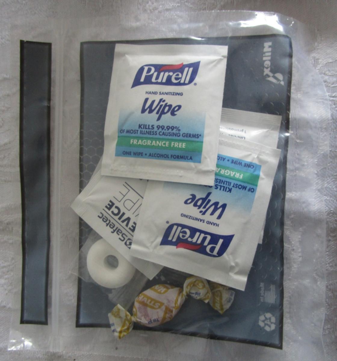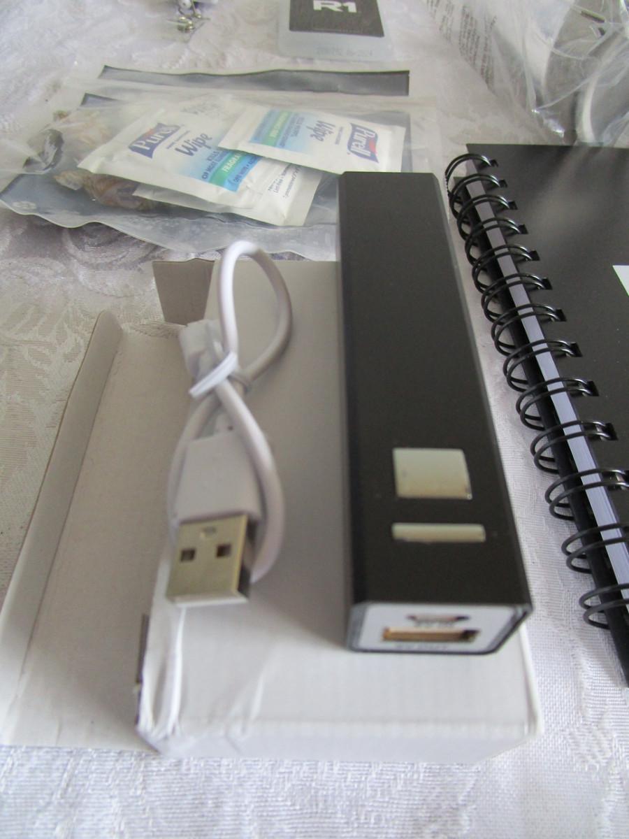 All new and unused; power bank, notebook with pen, water bottle, hand sanitizer, retractable I.D. badge holder, wipes with misc. Backpack is 16" x 9.5" x 4.5"