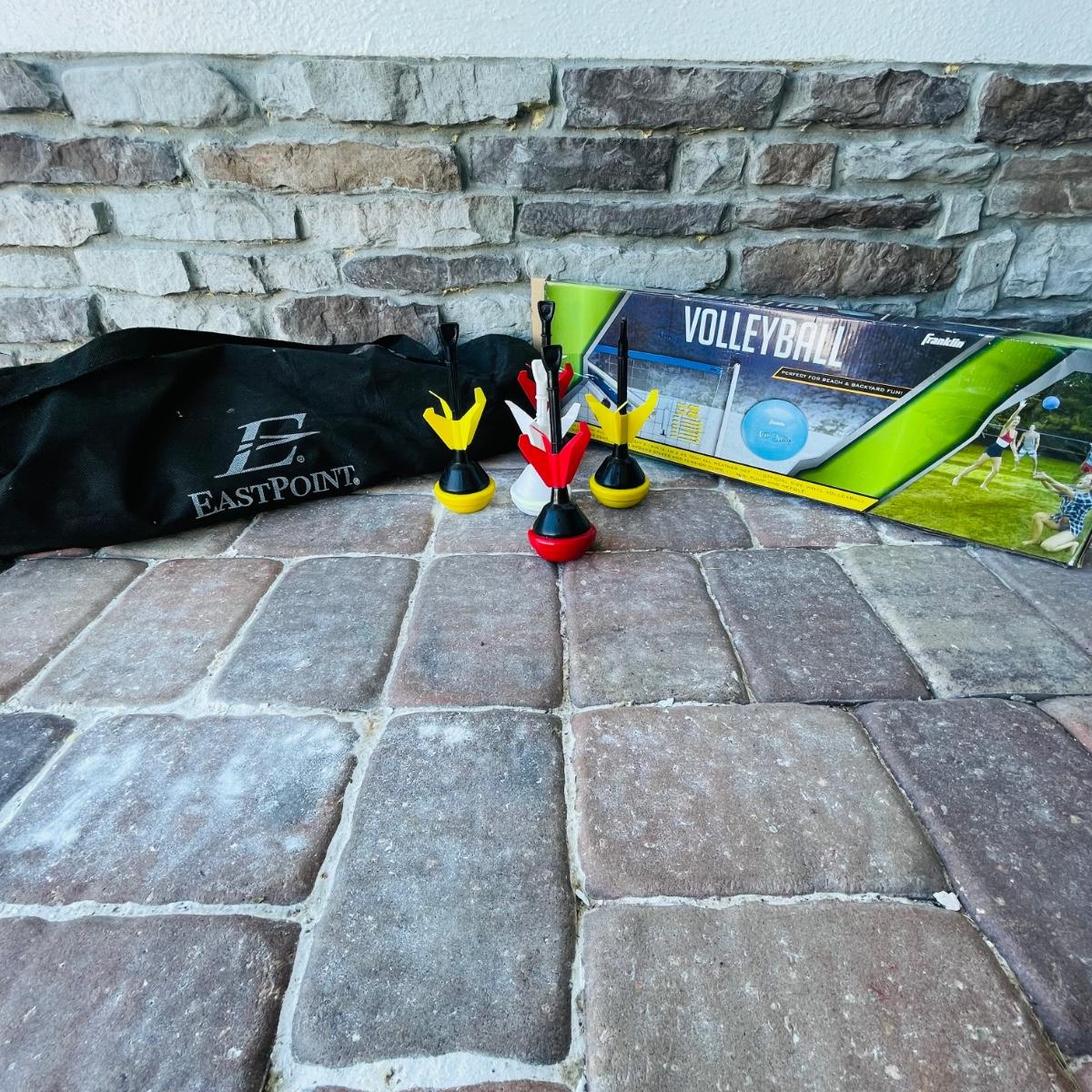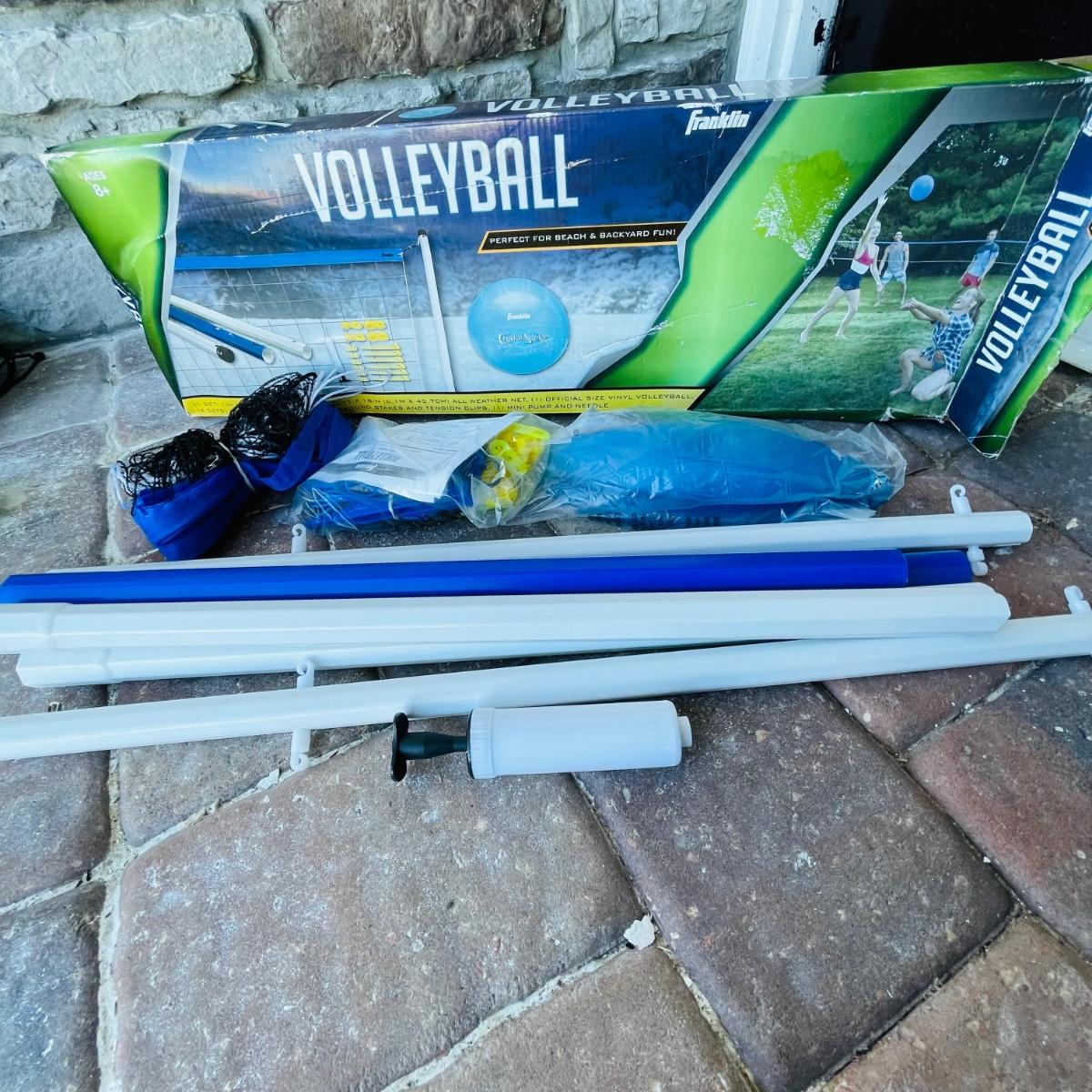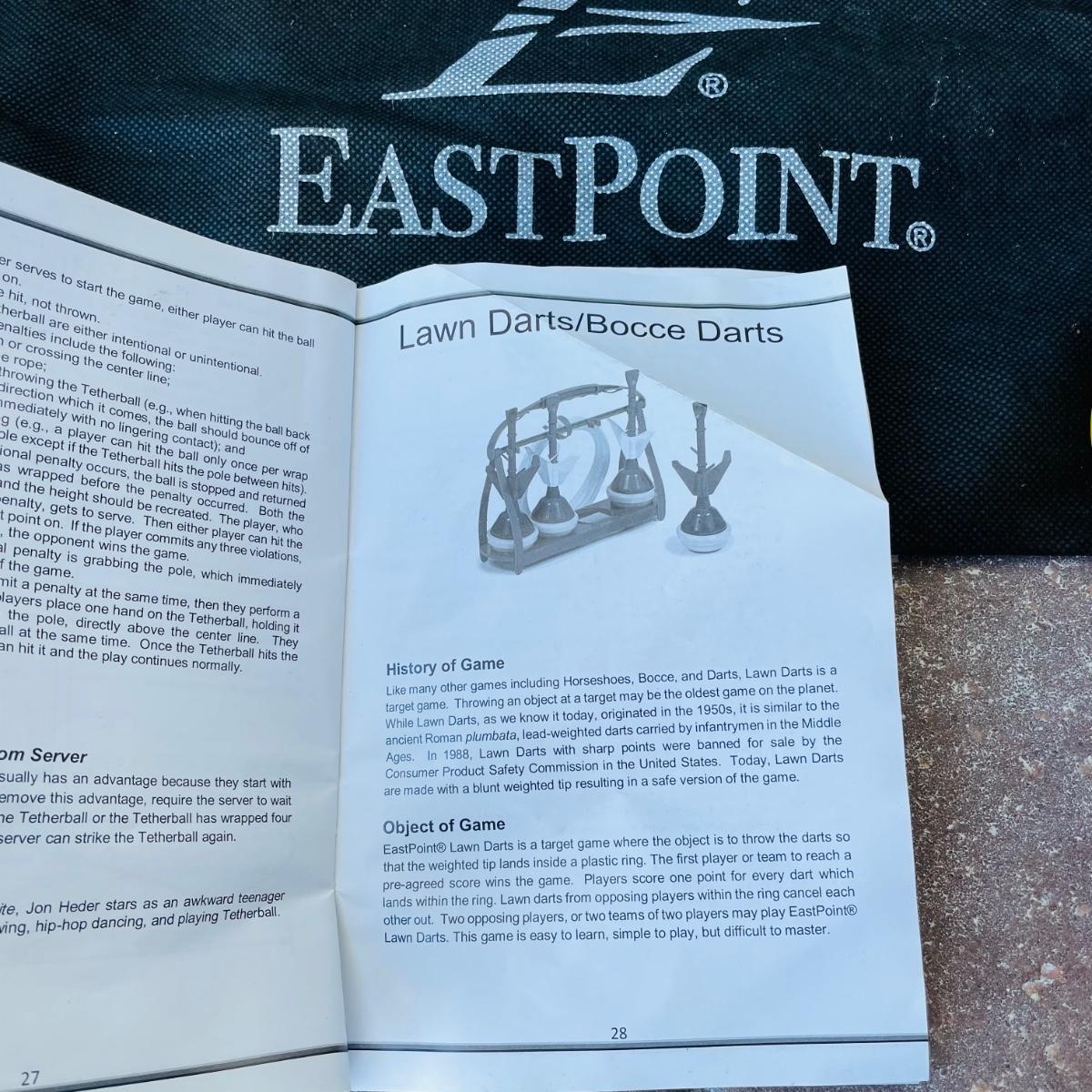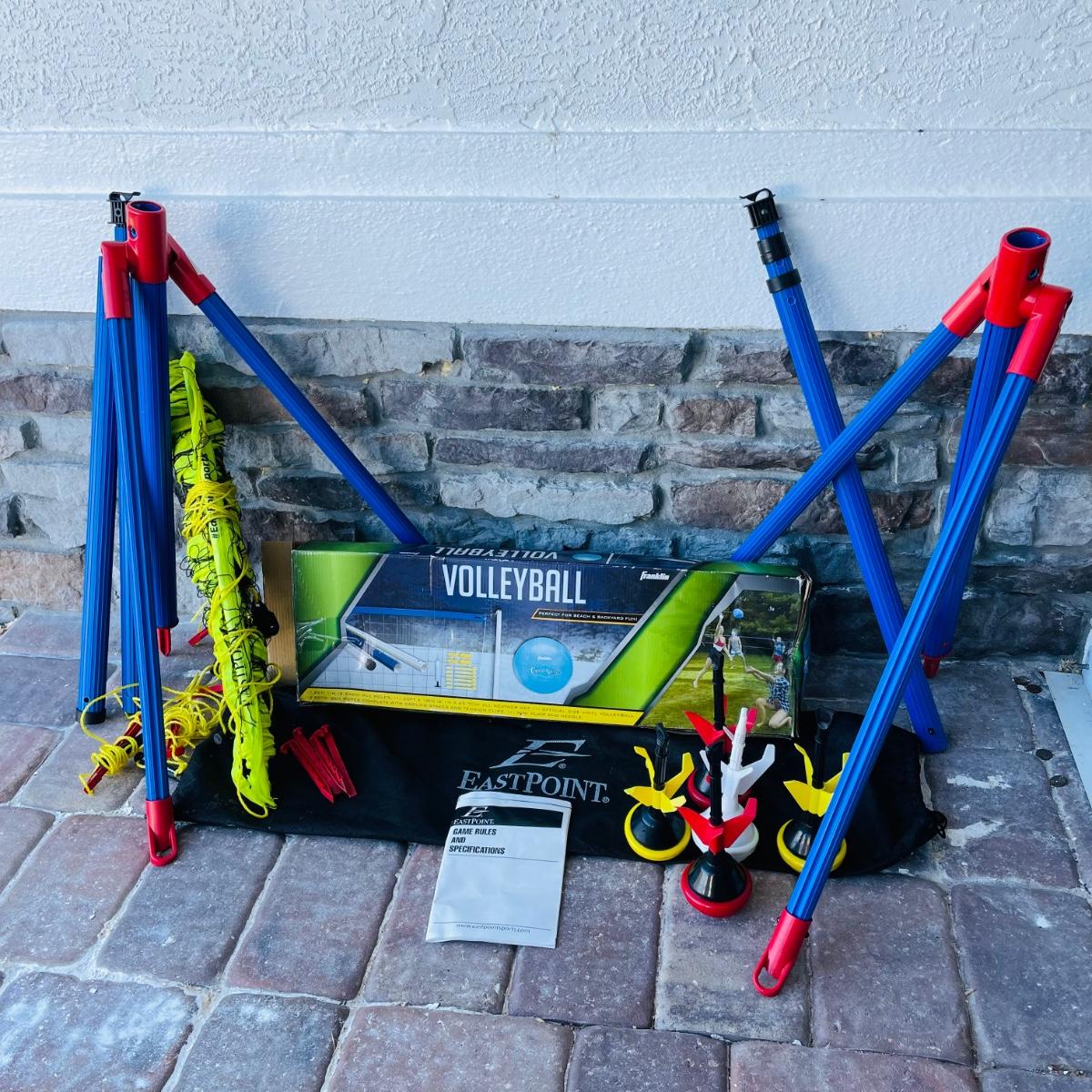 This lot includes 2 portable volleyball games, EastPoint and Franklin. and EastPoint lawn darts plus instruction manual. The lawn darts are a set of 5, game ring not included. EastPoint Volleyball net net comes with a storage/traveling bag. Adjustable PVC poles, 4 ground stakes and ropes. A Franklin Volleyball set never used, box has been open but all items inside are still in original packaging. Box includes an all weather net, official size volleyball, mini air pump, 4 sets of guy ropes with ground stakes and tension clips and pvc poles.