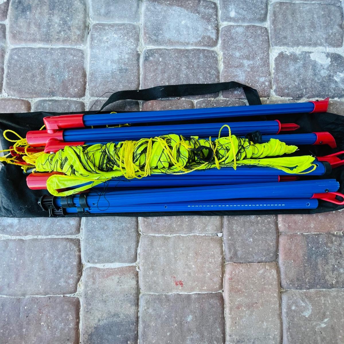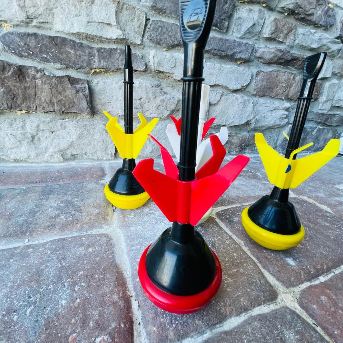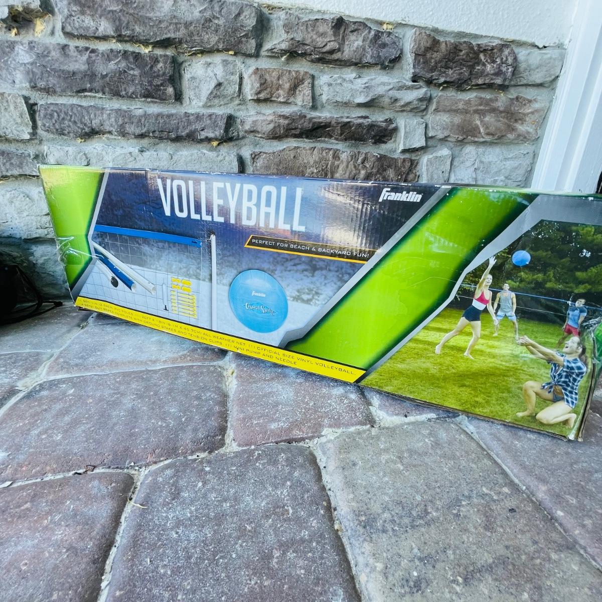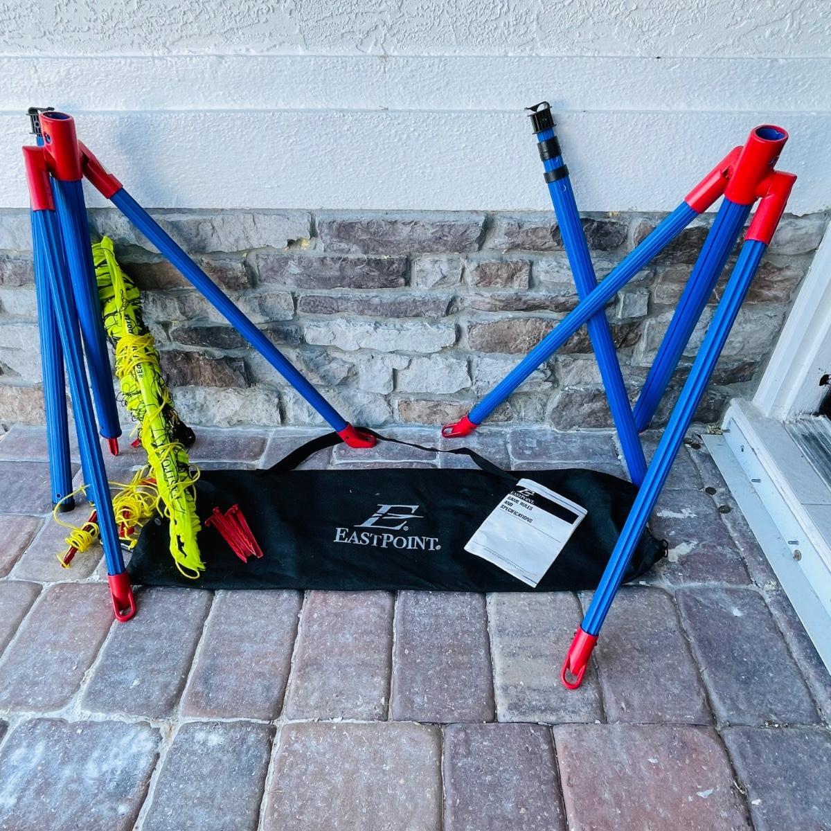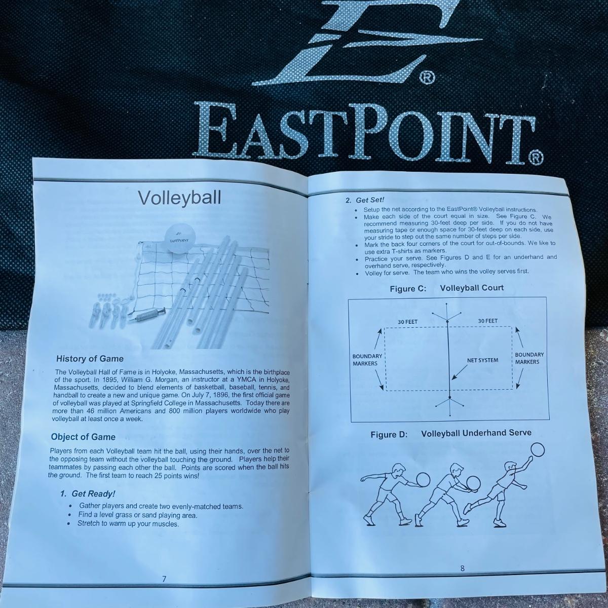 This lot includes 2 portable volleyball games, EastPoint and Franklin. and EastPoint lawn darts plus instruction manual. The lawn darts are a set of 5, game ring not included. EastPoint Volleyball net net comes with a storage/traveling bag. Adjustable PVC poles, 4 ground stakes and ropes. A Franklin Volleyball set never used, box has been open but all items inside are still in original packaging. Box includes an all weather net, official size volleyball, mini air pump, 4 sets of guy ropes with ground stakes and tension clips and pvc poles.