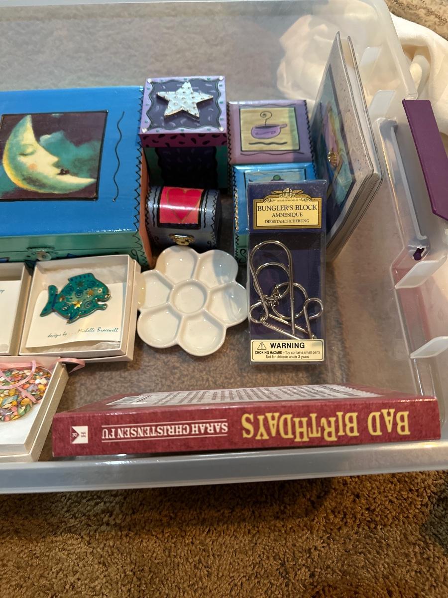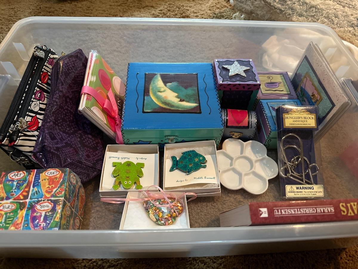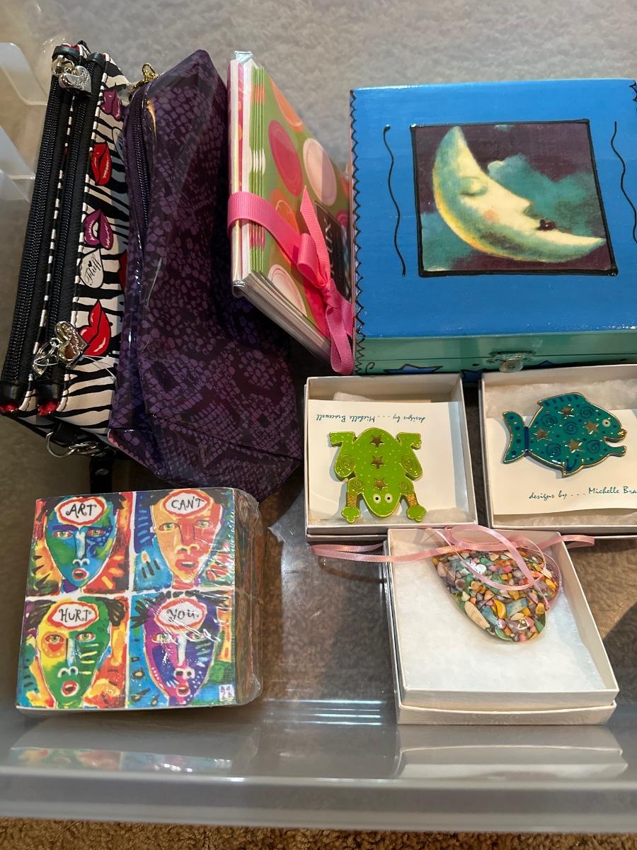 Jewelry boxes, cards, jewelry holder, astrology book, art post it notes, wobble clocks, and gravity defying magnesite pen
