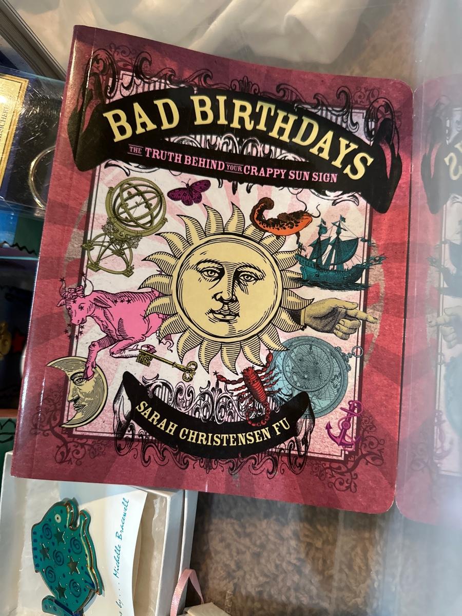 Bad birthdays astrology book, jewelry boxes, makeup bags, and pins