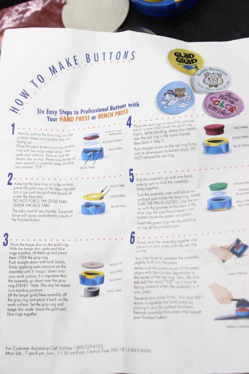 Badge A Minit button/pin maker kit. Comes with tool, supplies and instructions.