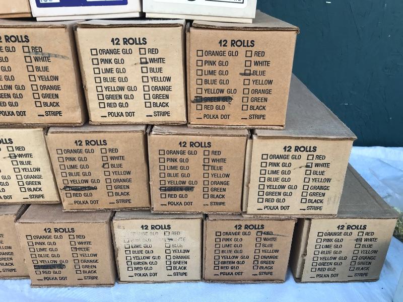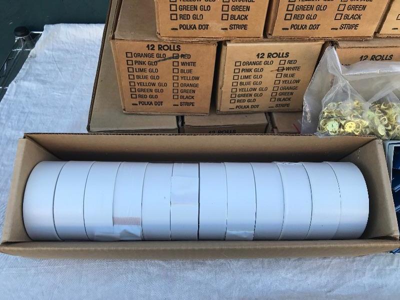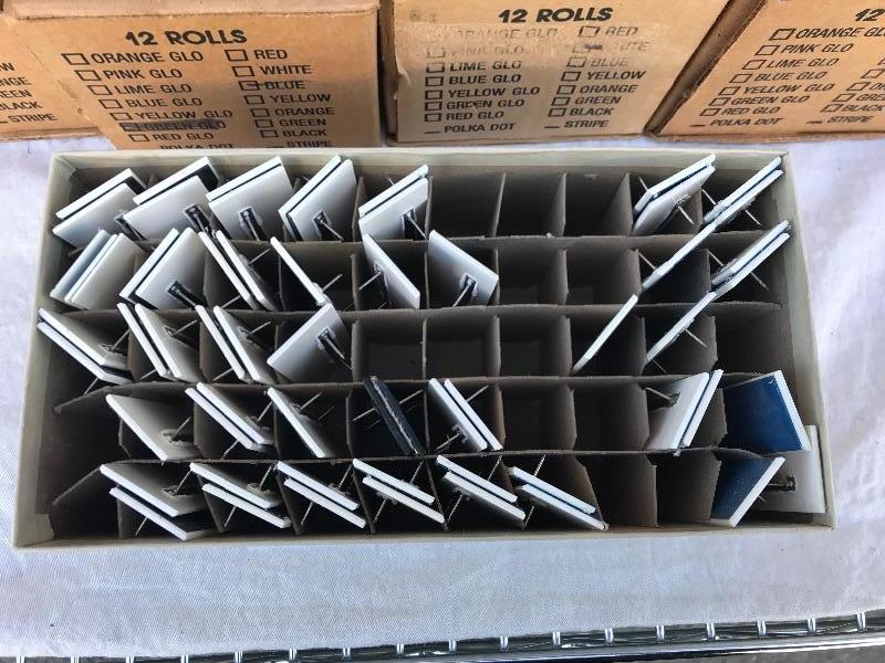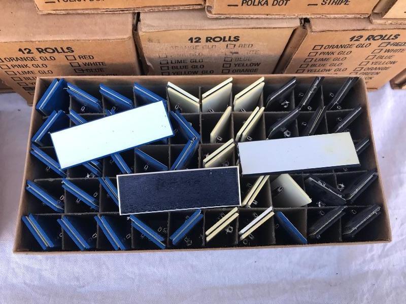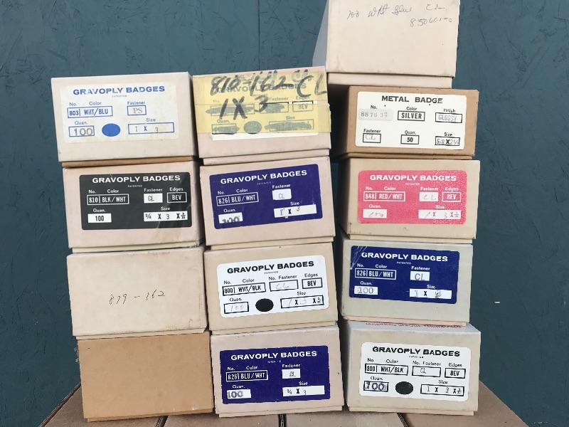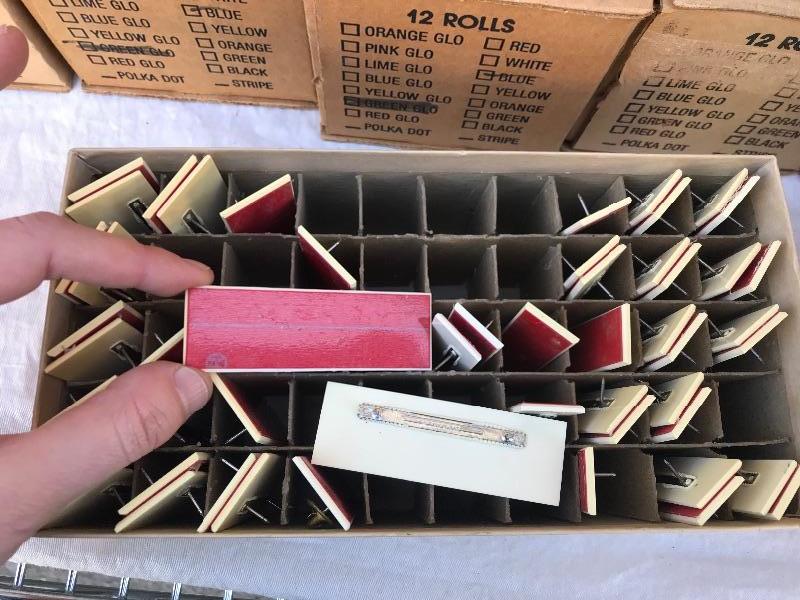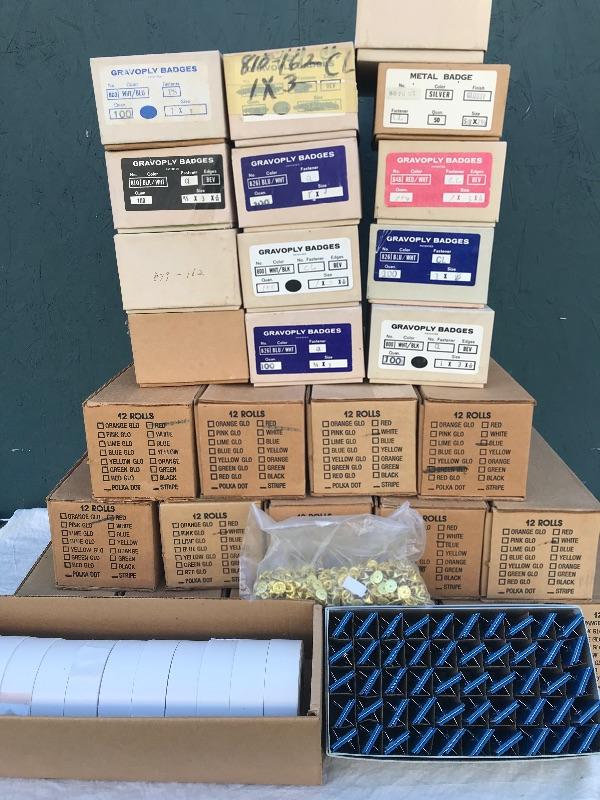 This lot includes 12 boxes of blank badges of various styles and colors. Most badges are 3.25" x 1". Also included are 16 boxes of colored tape to apply to the badges. Colors include red, white, and blue. A bag of gold pin backs are included as well. All made in USA.