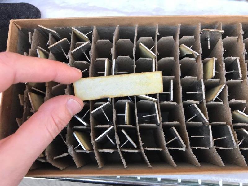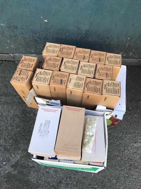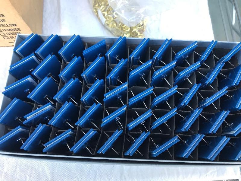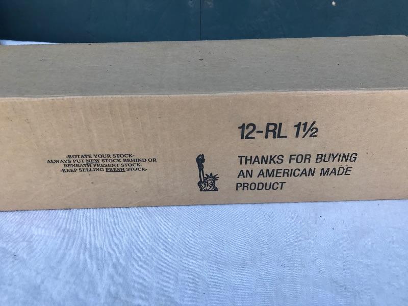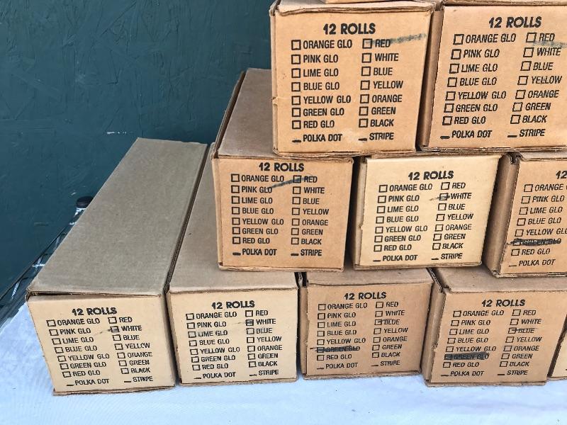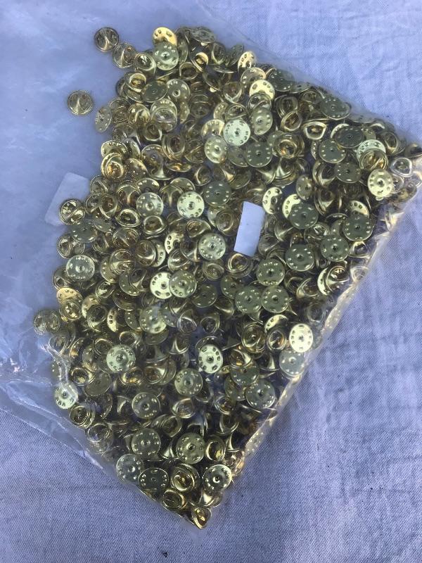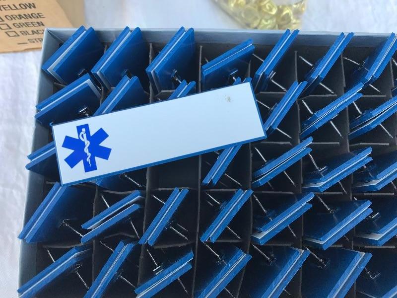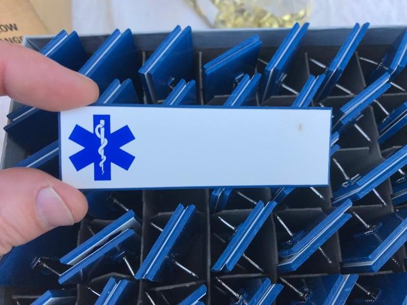 This lot includes 12 boxes of blank badges of various styles and colors. Most badges are 3.25" x 1". Also included are 16 boxes of colored tape to apply to the badges. Colors include red, white, and blue. A bag of gold pin backs are included as well. All made in USA.