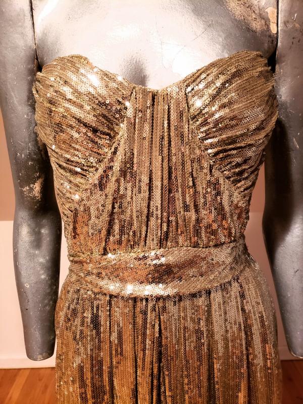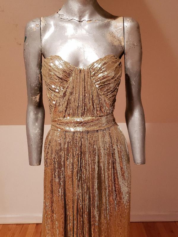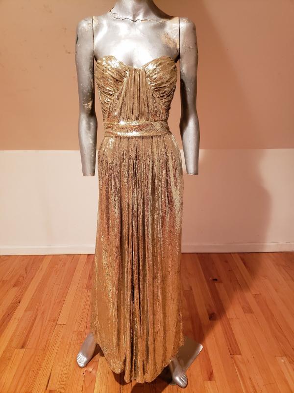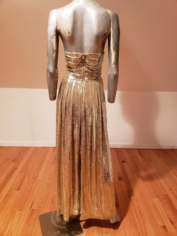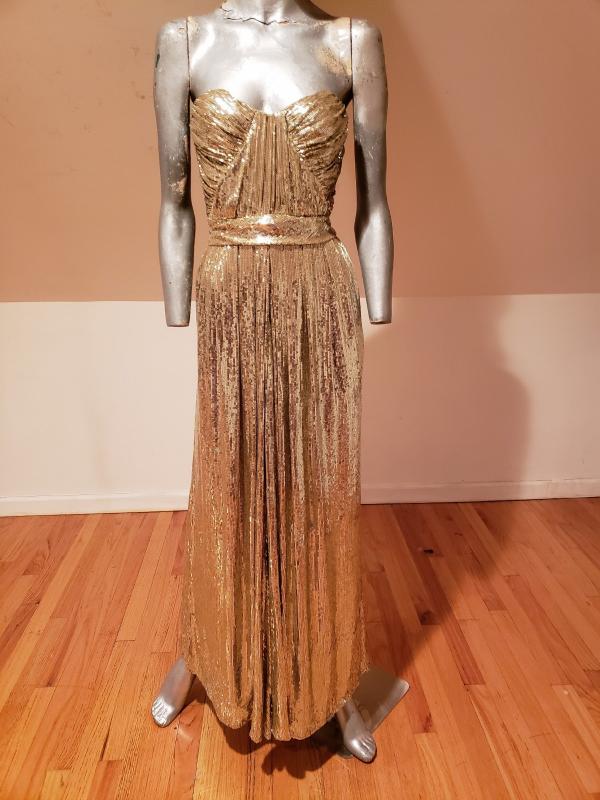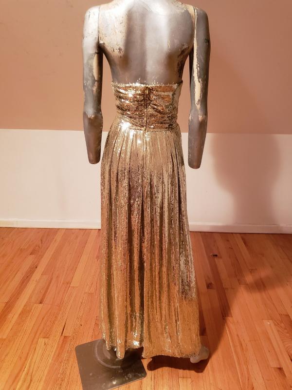 This one is truly a Golden Screen Hollywood Siren Gown .Special gold loop tiny sequin like forms. on a silk crepe chiffon , also has a linner in satin crepe.. It is fluid like liquid gold. The details are smashing
