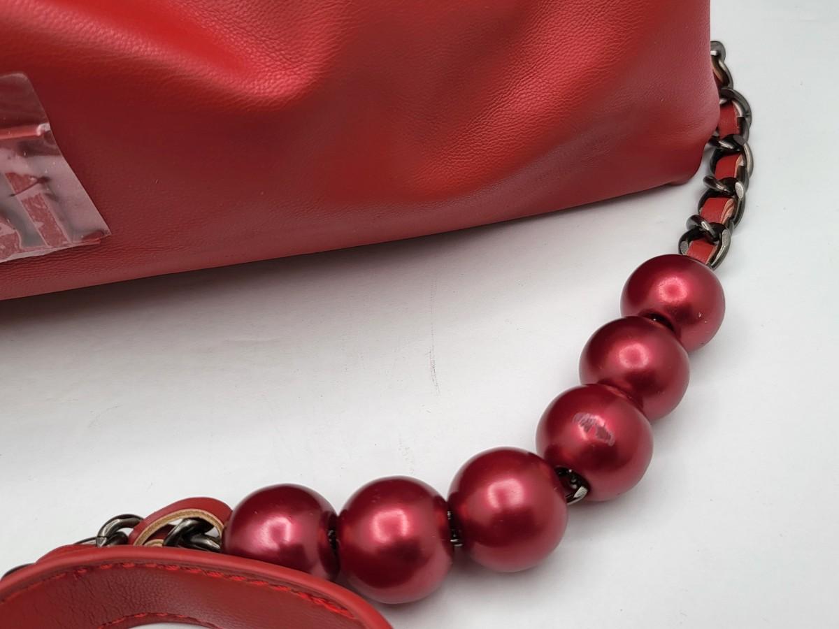 Neat, retro-look puffy pleated handbag. Hinged top opening, 22" detachable blackened chain & bead strap (see photos couple beads have scuffs). Bag has never been used, original tags still on. Measures 12" long x 6.5" tall x 4" deep. Retailed for $149.00