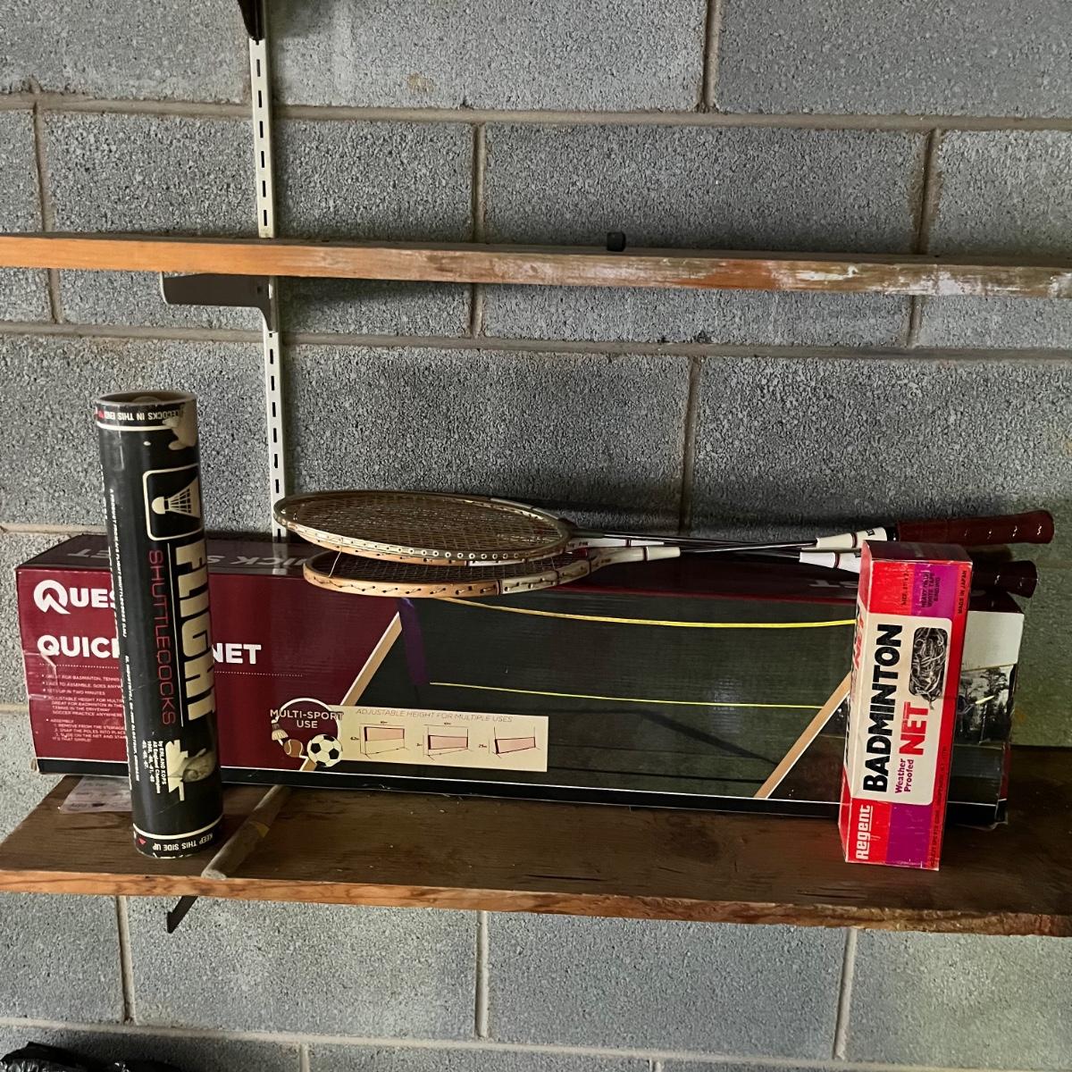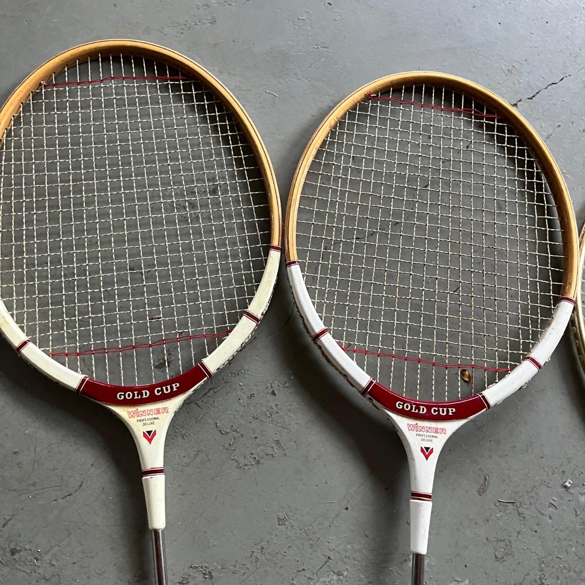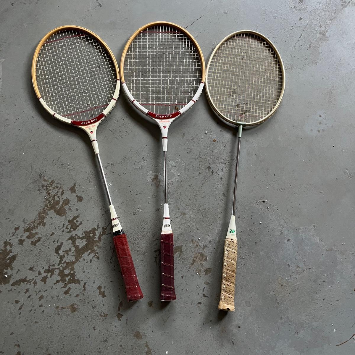 Lot includes two Relum Gold Cup wooden rackets, Yunex metal racket, Quest quick set net, Regent net and shuttlecocks.