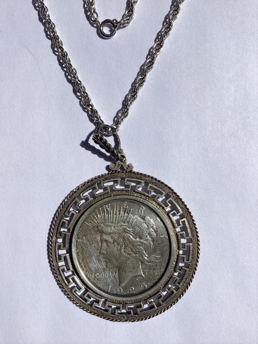 Sterling Silver Neckace with Silver Dollar. Silver chain weighs 60.4 grams.