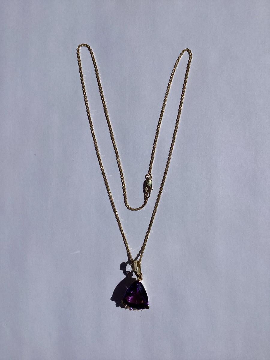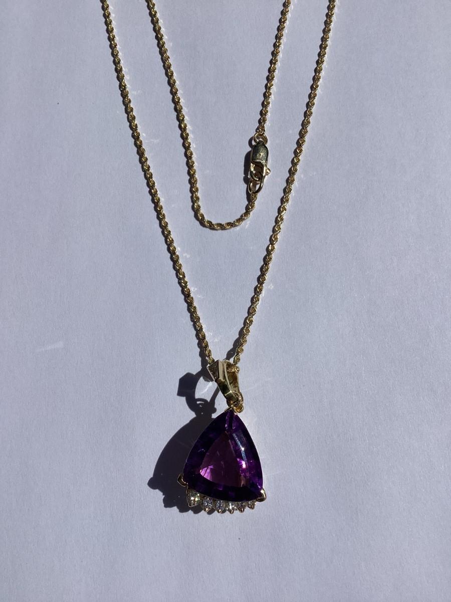 14 karat yellow gold necklace and purple amethyst pendant with diamond accents. The necklace with stones weighs 10.84 grams.
