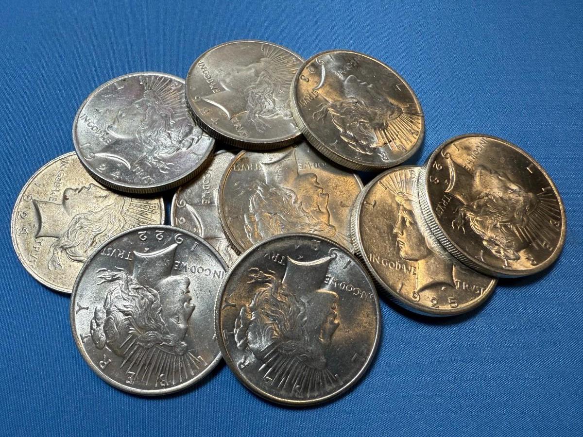 BAG #2 OF 10 DECENT SHAPE PEACE SILVER DOLLARS AT MELT SILVER PRICE AS PICTURED. (RECEIVE ALL COINS PICTURED). $6 DOMESTIC SHIPPING.