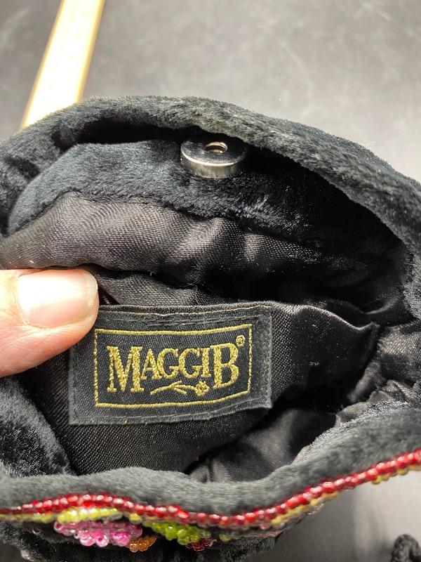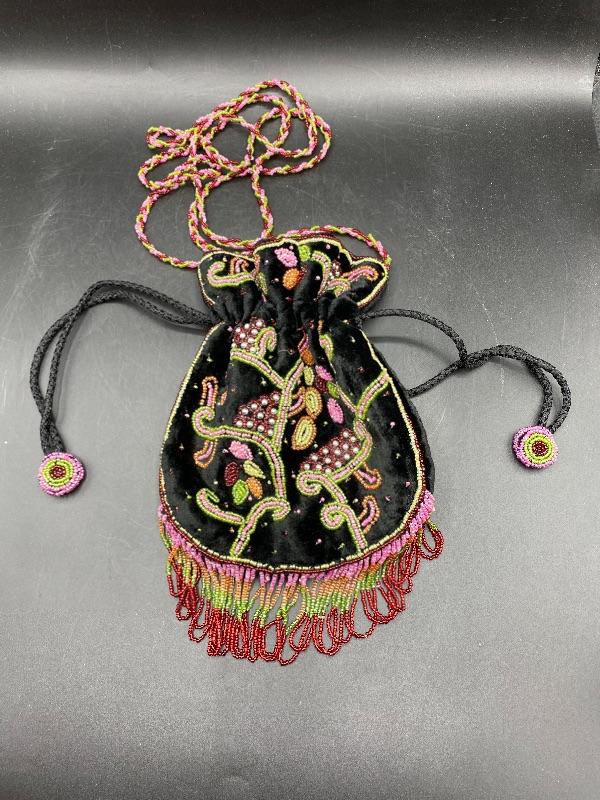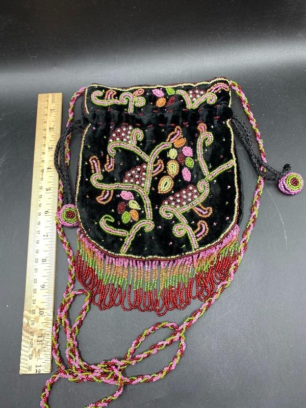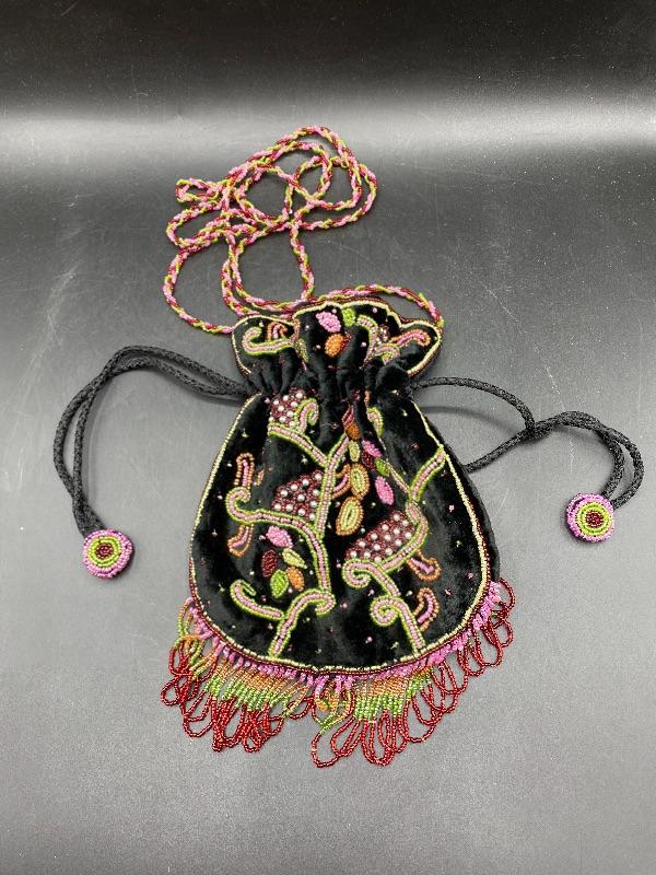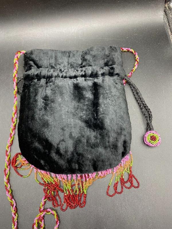 Black velvet beaded drawstring purse. Does have a magnetic snap closure along with the drawstring. Colorful beaded fringe. Good condition. About 8" size, not including shoulder strap and fringe.
