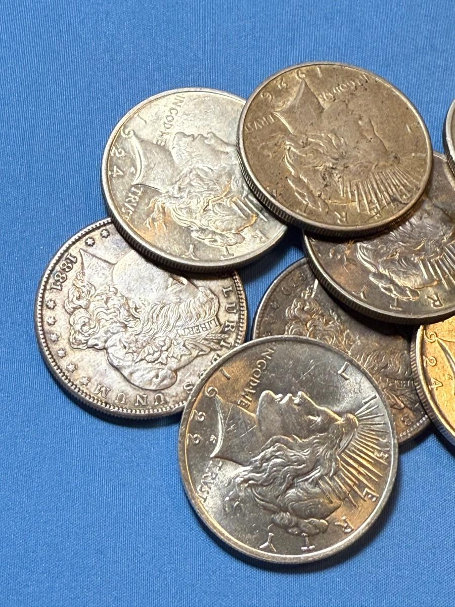 BAG #6 OF 10 DECENT SHAPE MORGAN & PEACE SILVER DOLLARS AT MELT SILVER PRICE AS PICTURED. (RECEIVE ALL COINS PICTURED). $6 DOMESTIC SHIPPING.