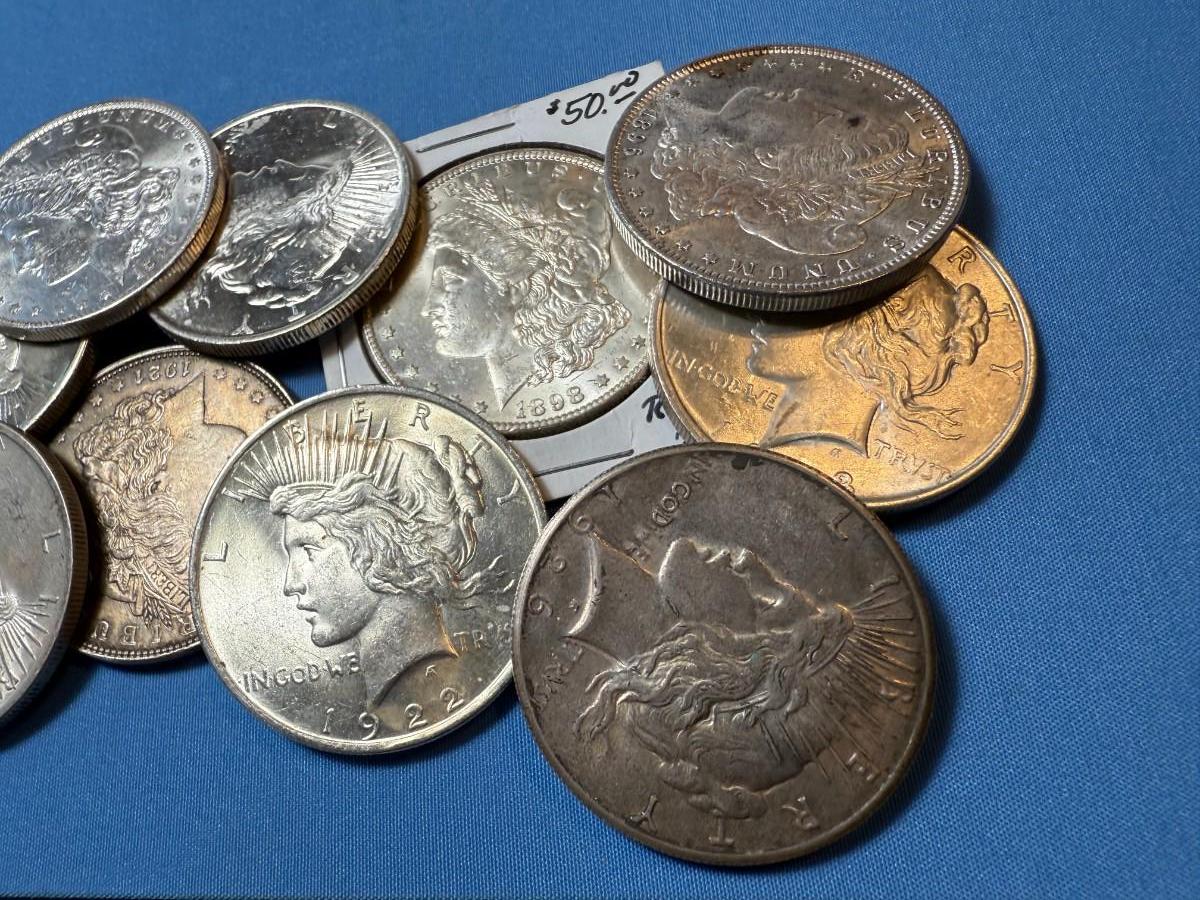 BAG #7 OF 10 DECENT SHAPE MORGAN & PEACE SILVER DOLLARS AT MELT SILVER PRICE AS PICTURED. (RECEIVE ALL COINS PICTURED). $6 DOMESTIC SHIPPING.